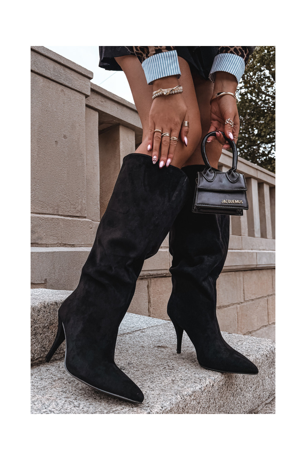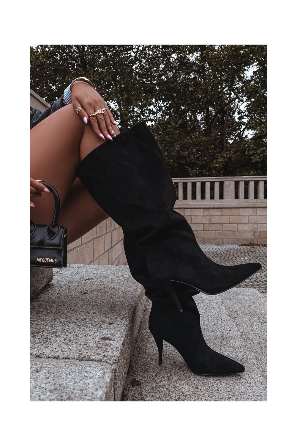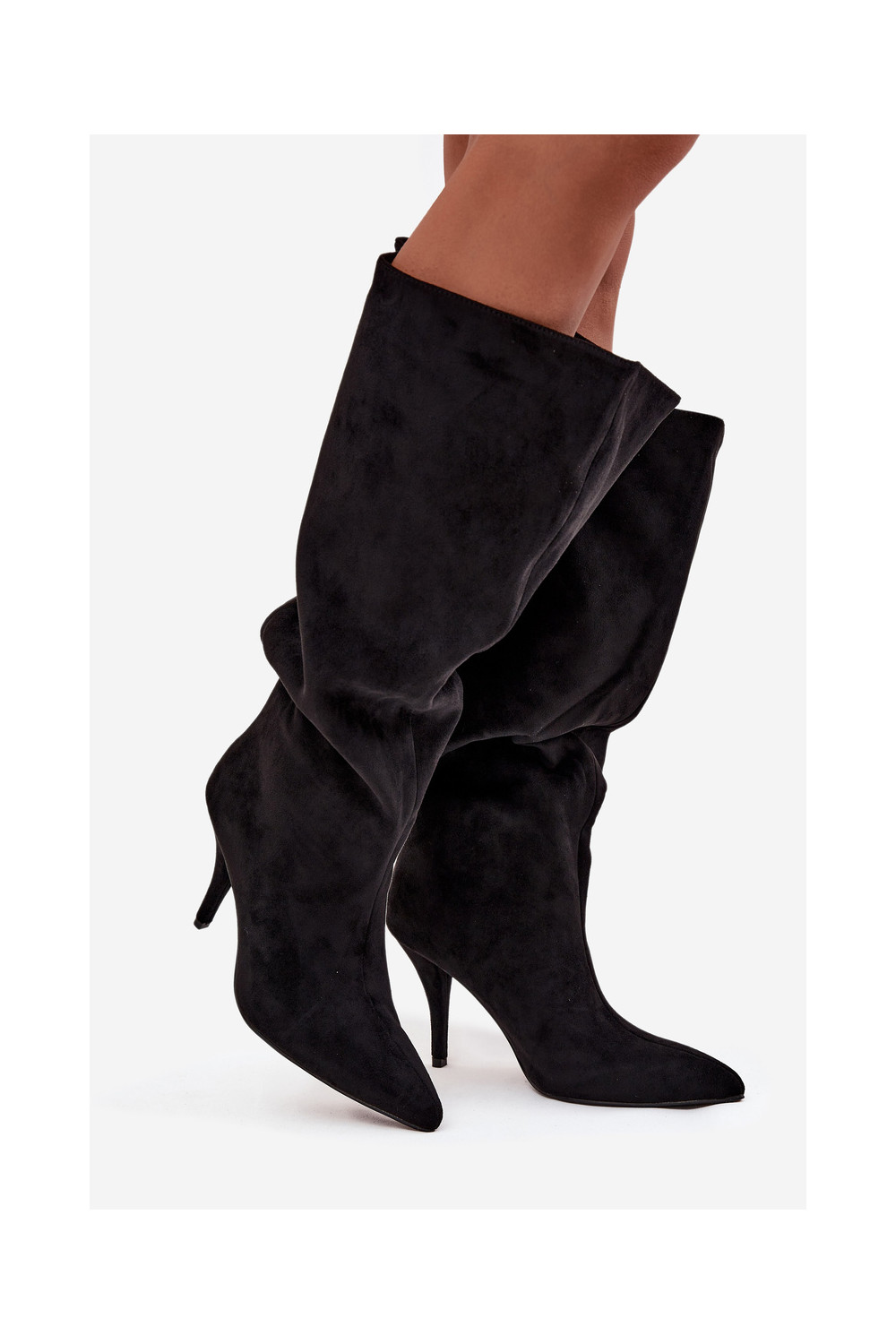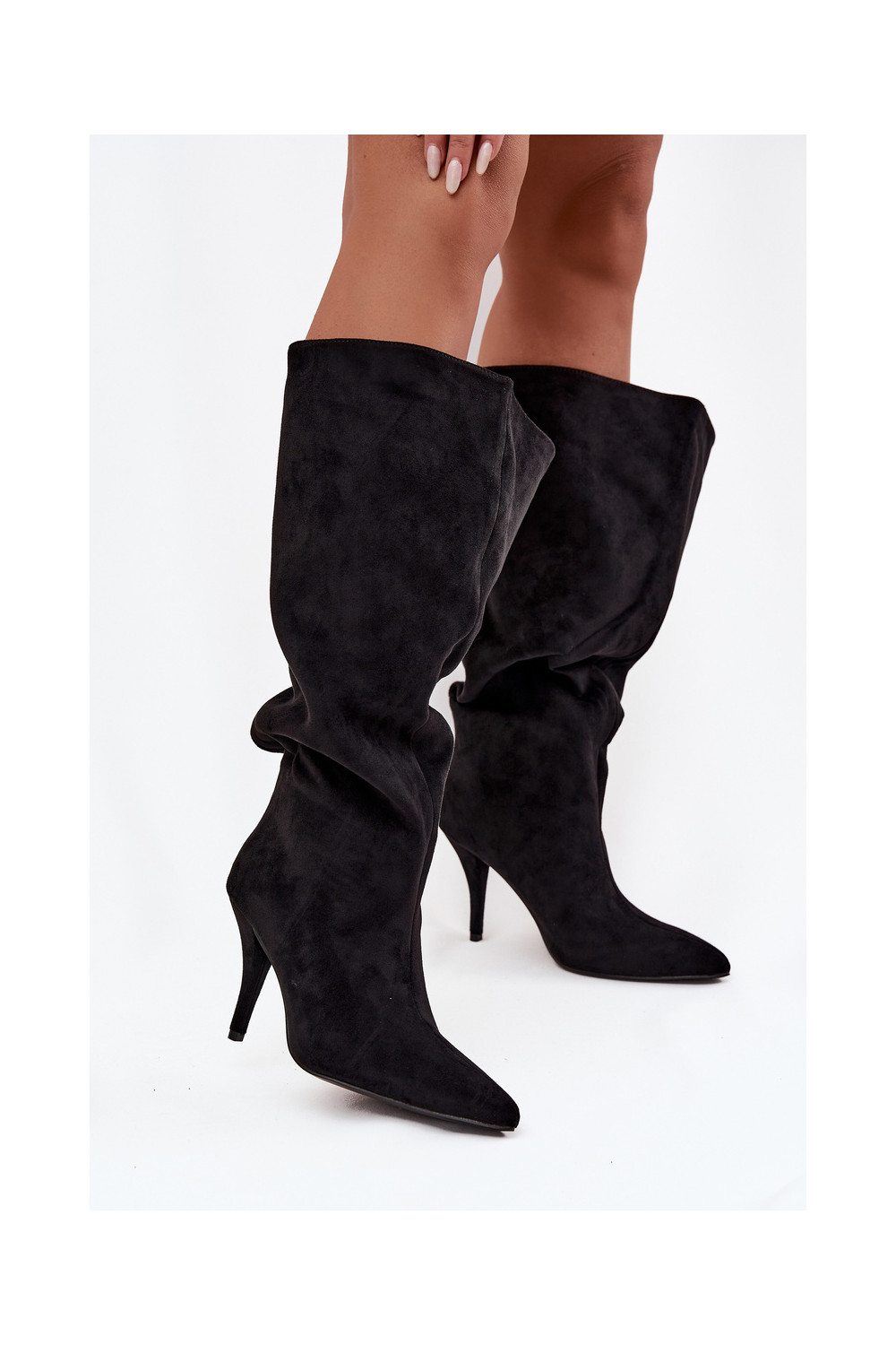 Iespraužami modeļa sieviešu garie zābaki ar plāniem papēžiem no mākslīgā zābaka melnā krāsā Noretta