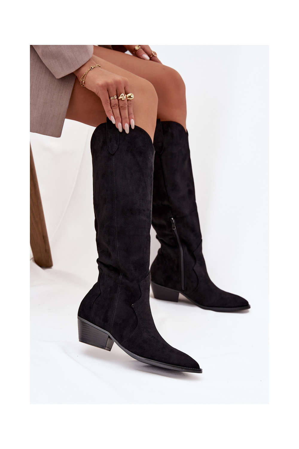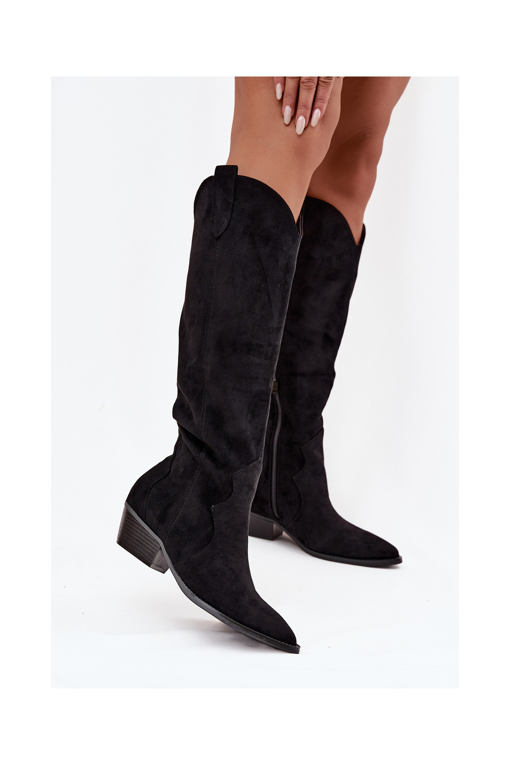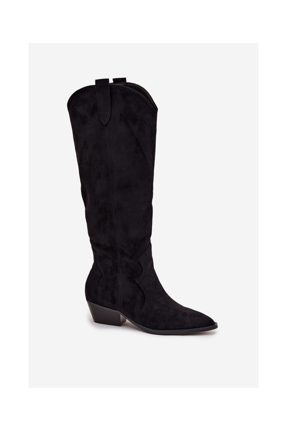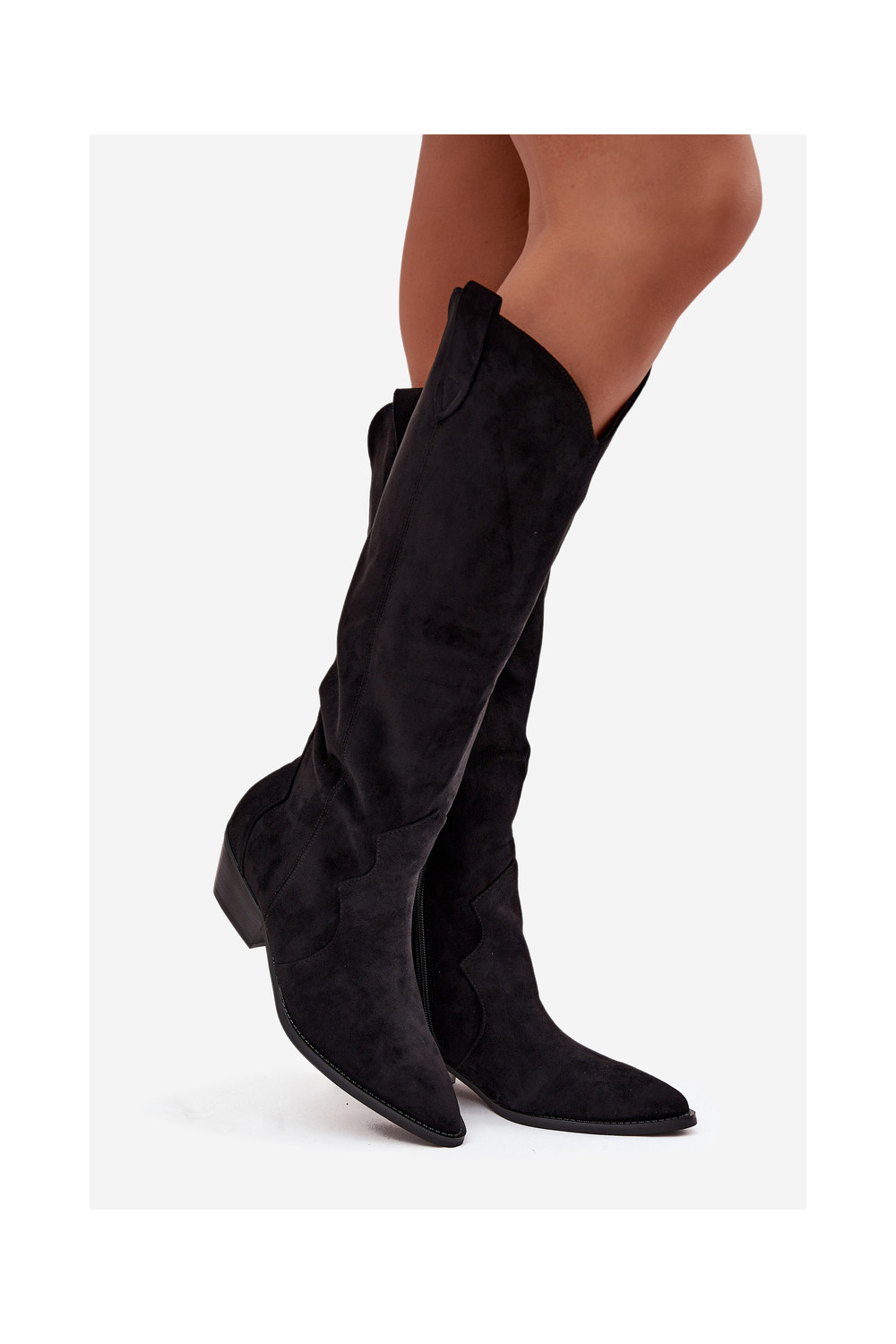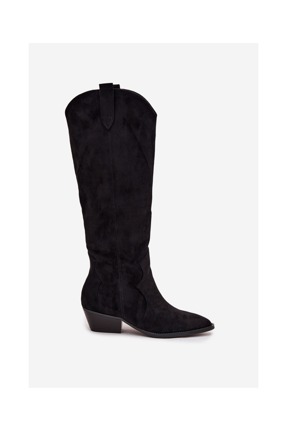 Mākslīgās zamšas garie zābaki kovboju stilā sievietēm ar papēžiem melnā krāsā Jenaya