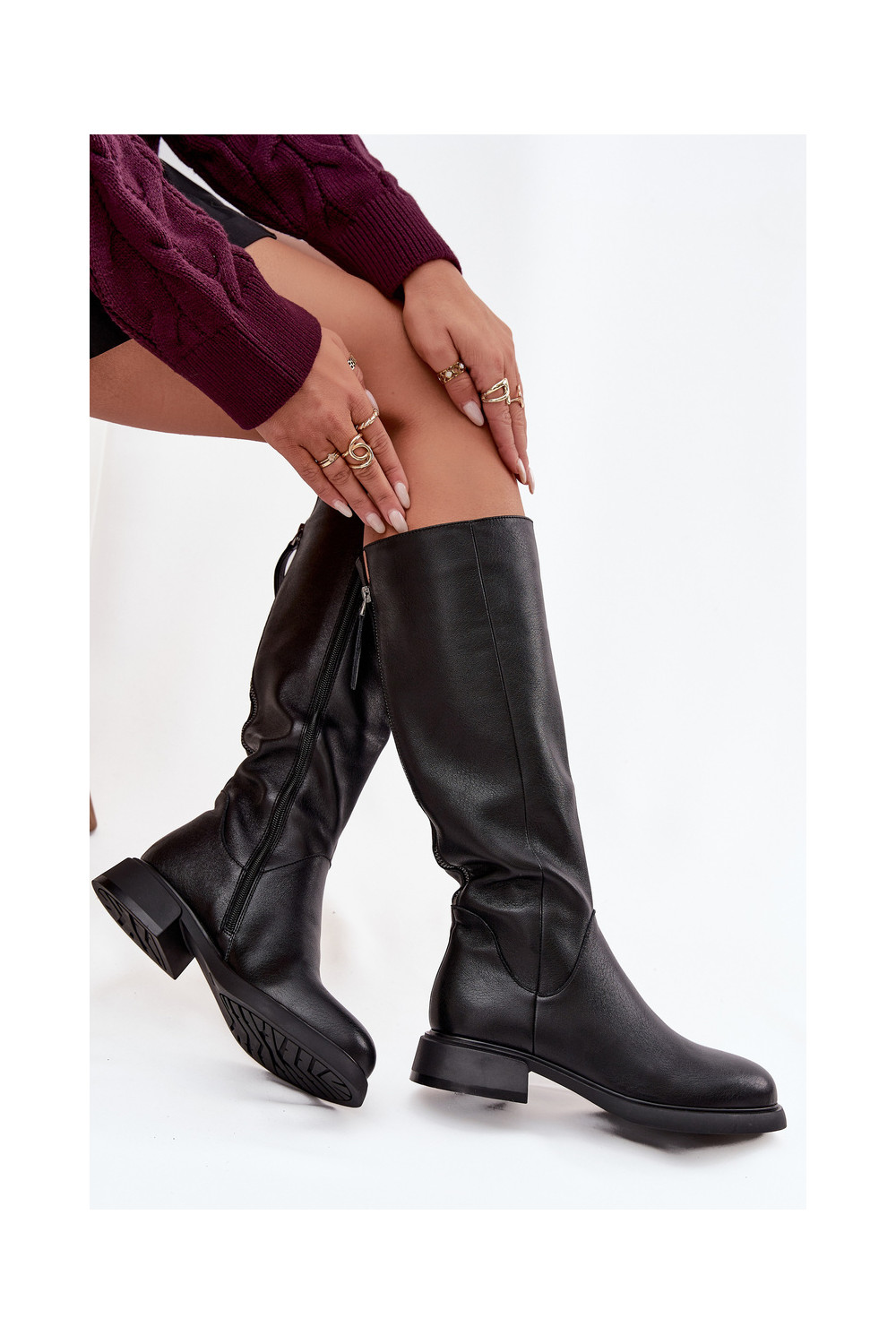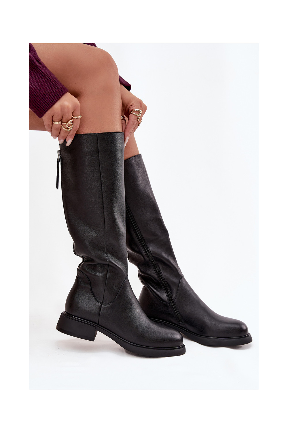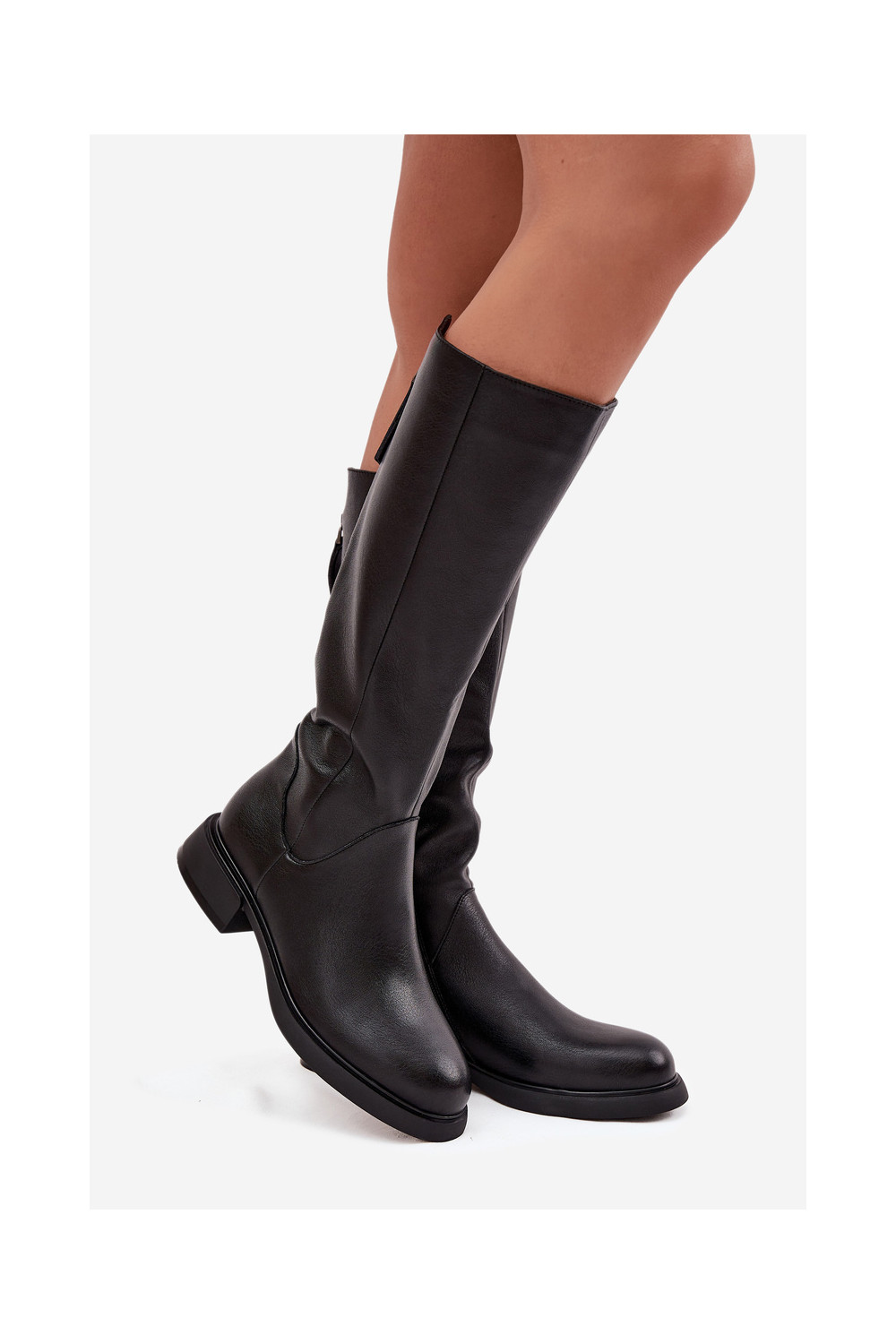 Mākslīgās ādas sieviešu gari zābaki ar plats papēžiem, siltie, D&A JC52-837, melnā krāsā