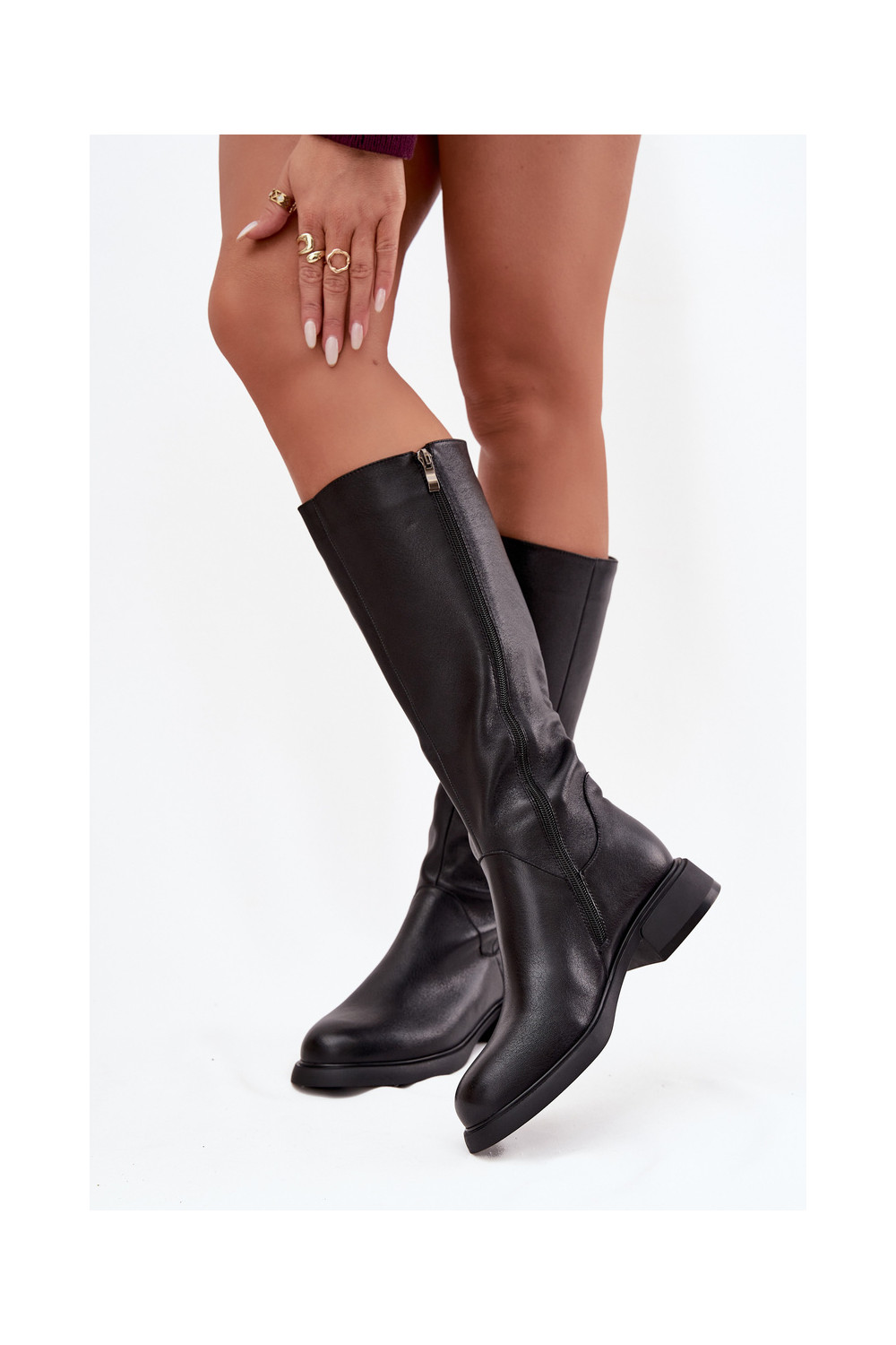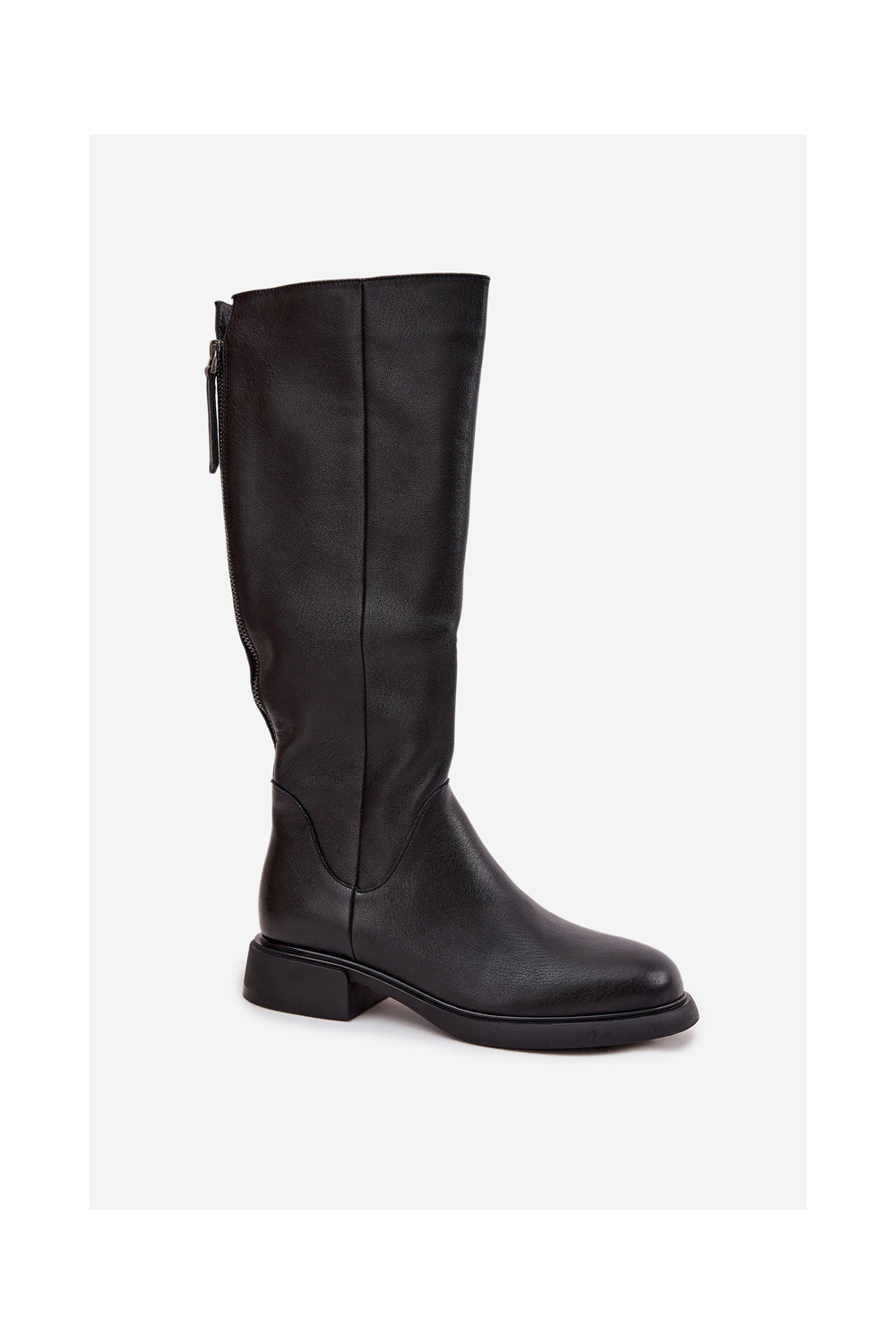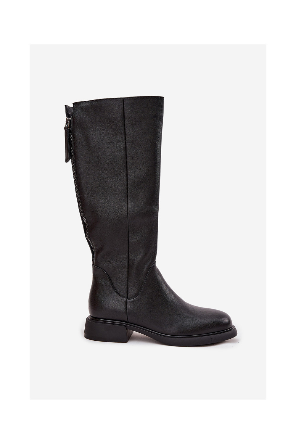 Mākslīgās ādas sieviešu gari zābaki ar plats papēžiem, siltie, D&A JC52-837, melnā krāsā