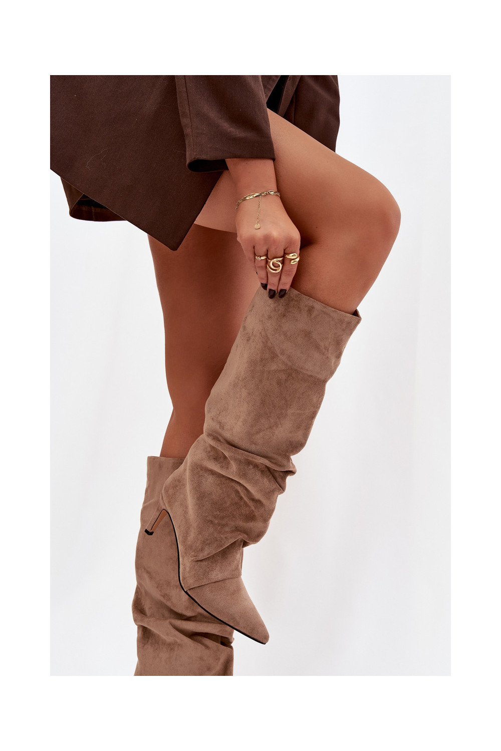 Saburzīts garie zābaki ar papēdiEko zamšādau siltināti smilšu krāsas Tā irvella