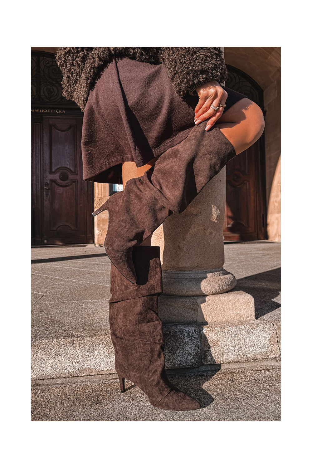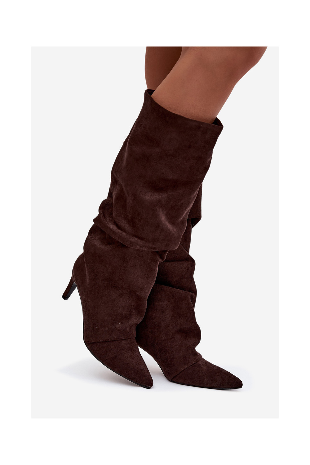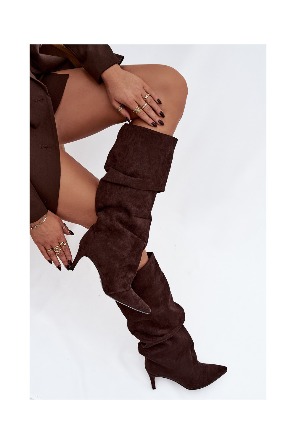 Šokolādes krāsa saraukta siltināti garie zābaki ar plāniem papēžiem no mākslīgā zamša Tai turivella