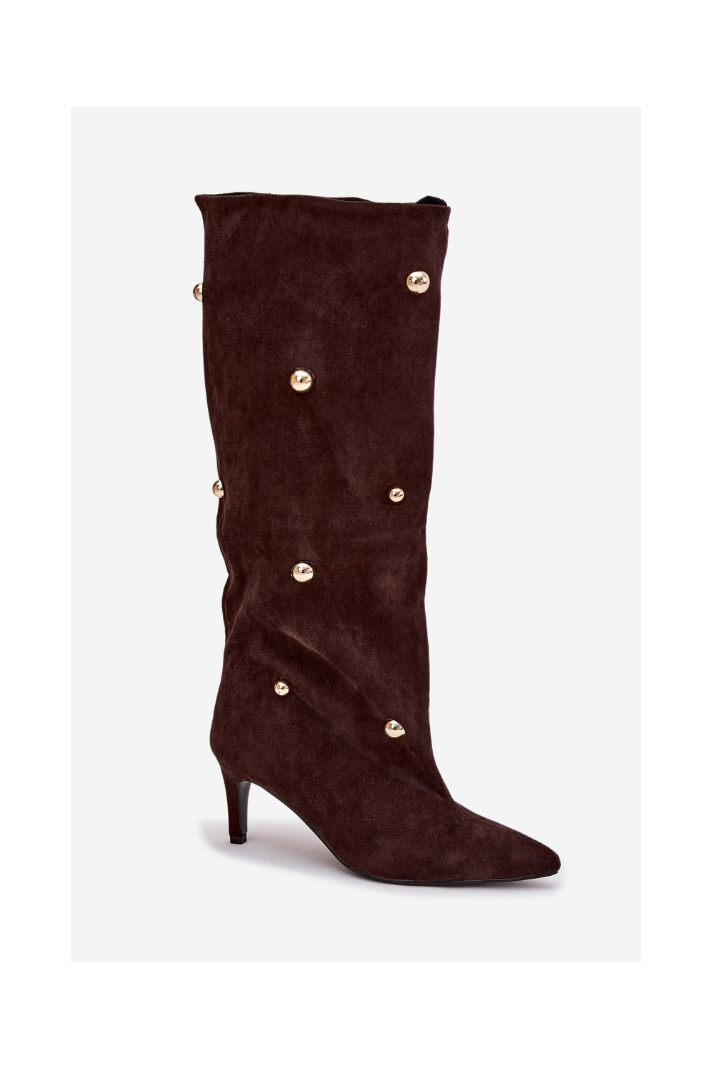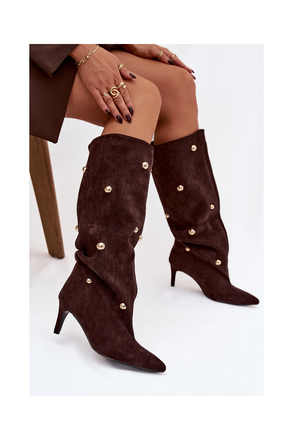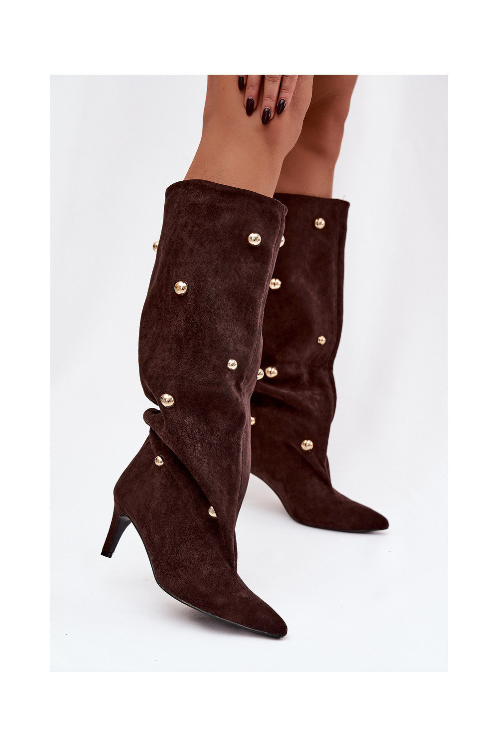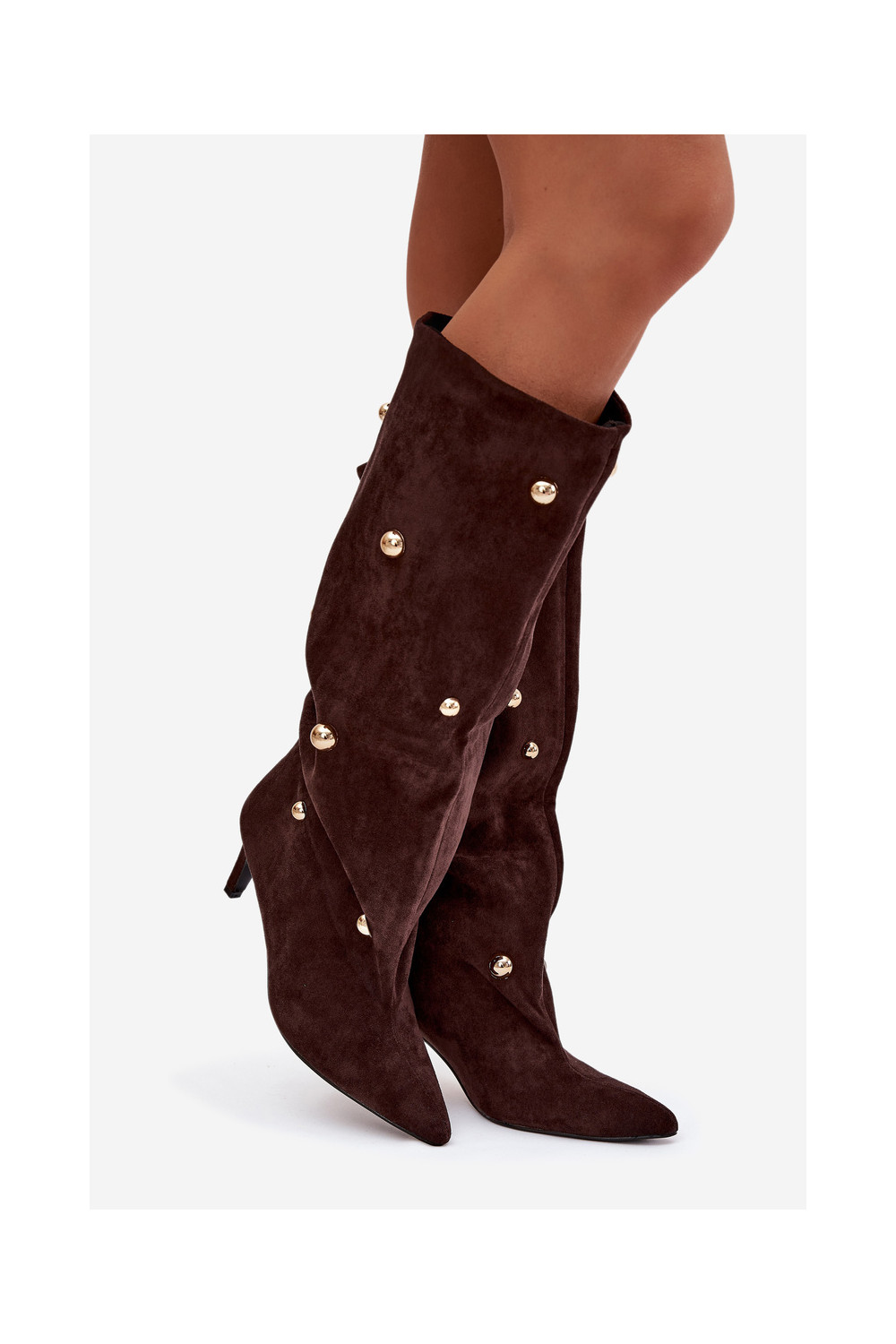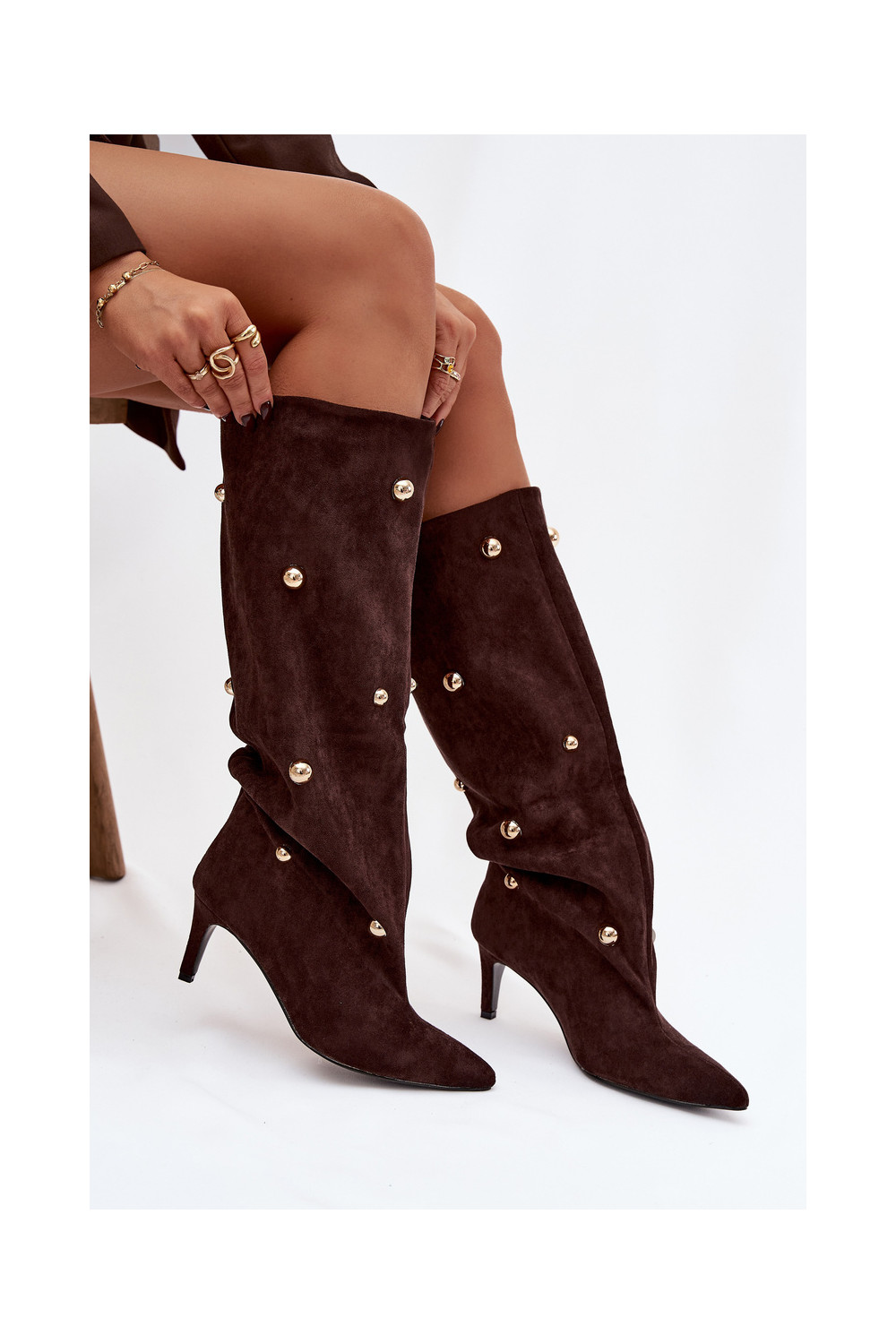 Paslīdēt uz sieviešu garie zābaki ar papēdi Ze Zelta krāsasmi Ozdobami CzekoladoIne Thaliane