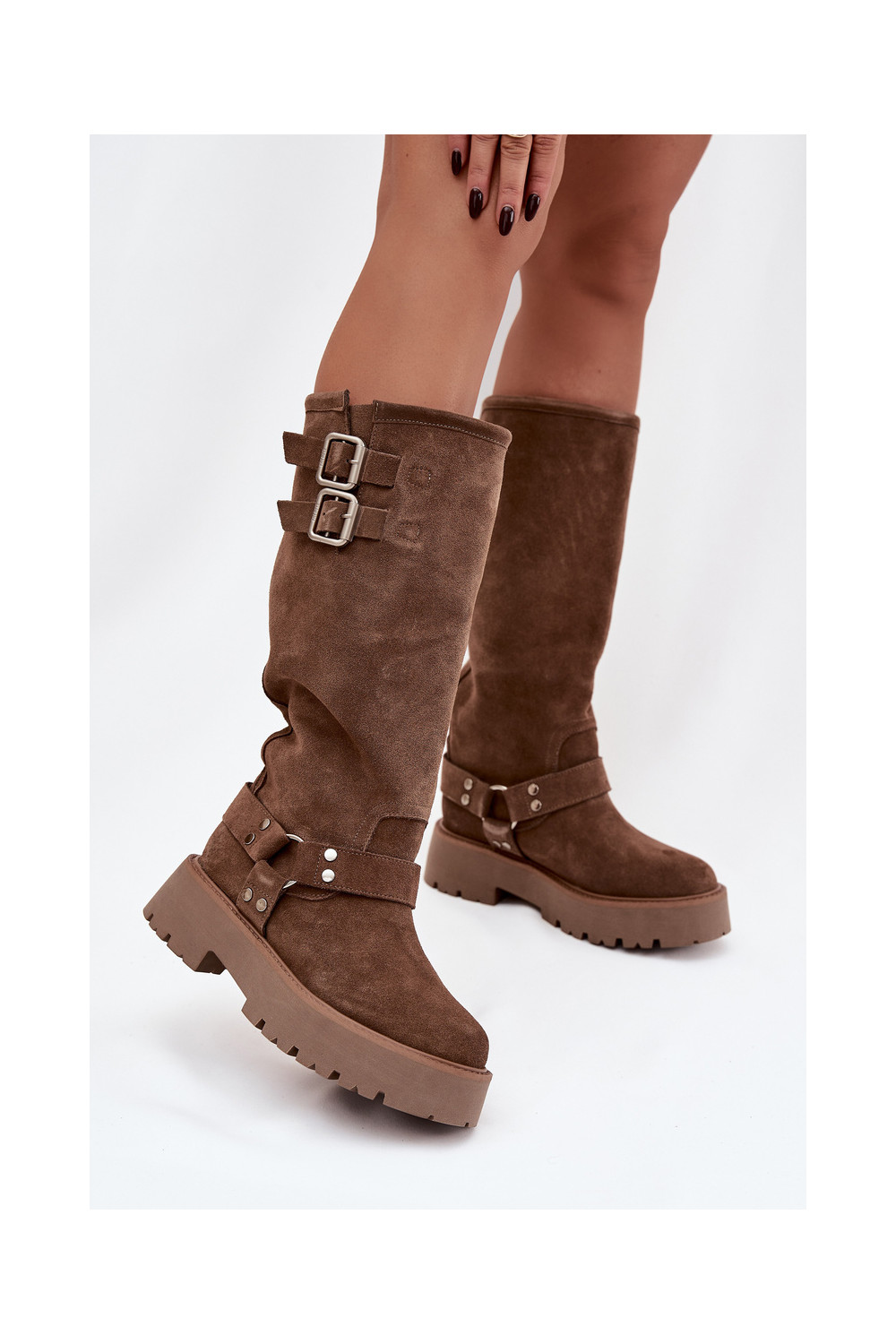Smilšu krāsas Big Star OO274A182 silti sieviešu ilgaulīši ar sprādzēm no dabīgā zamša