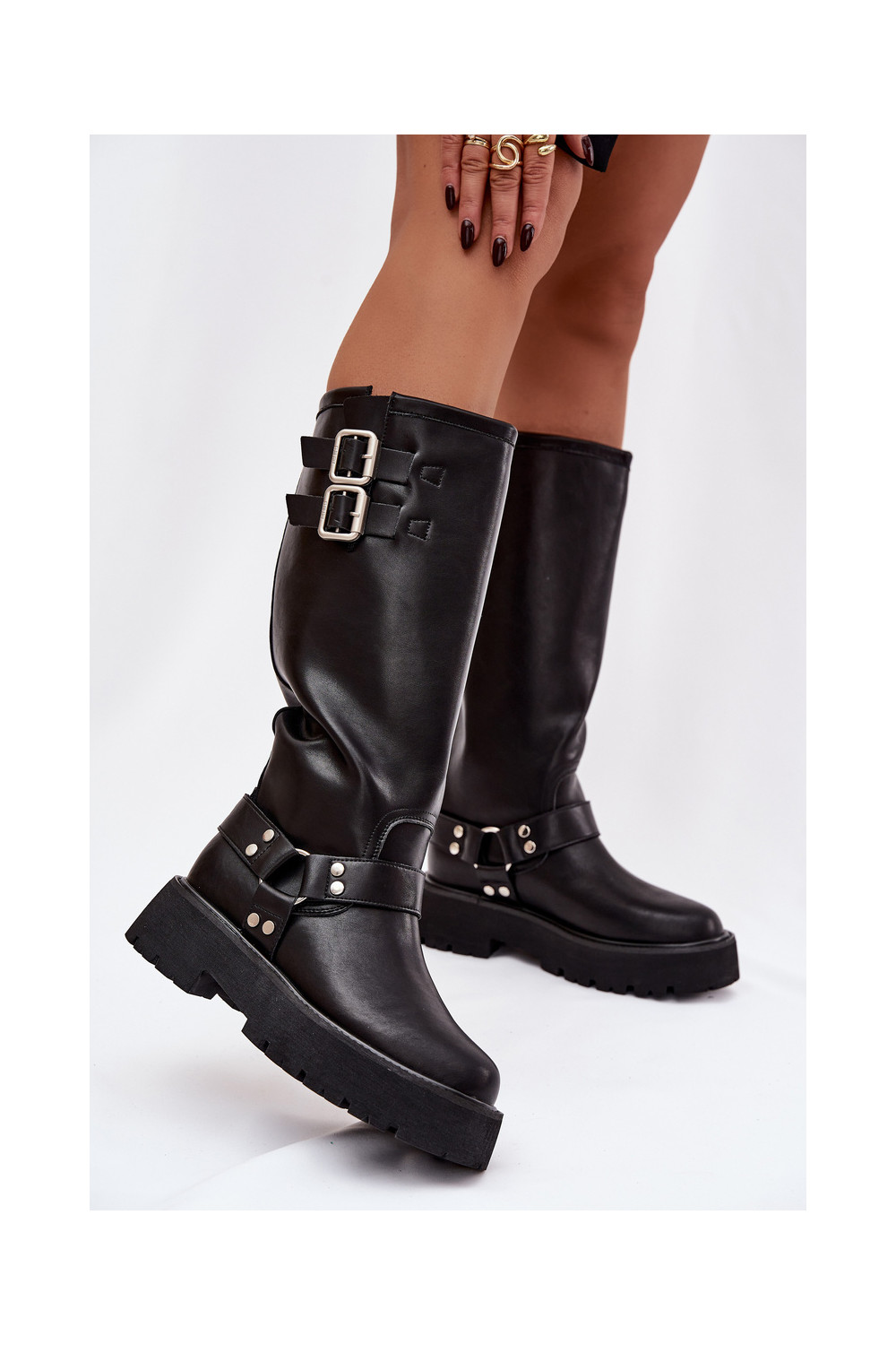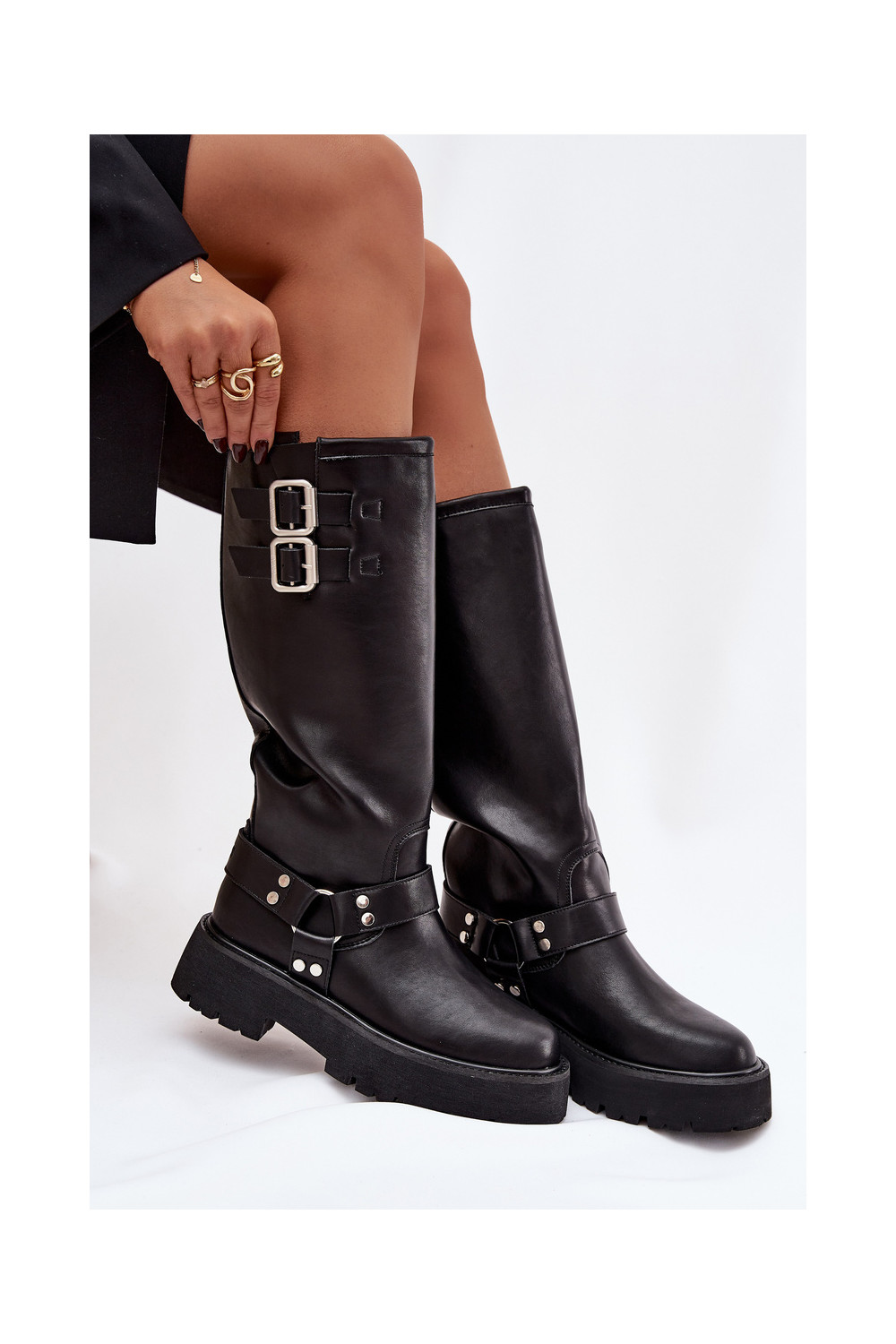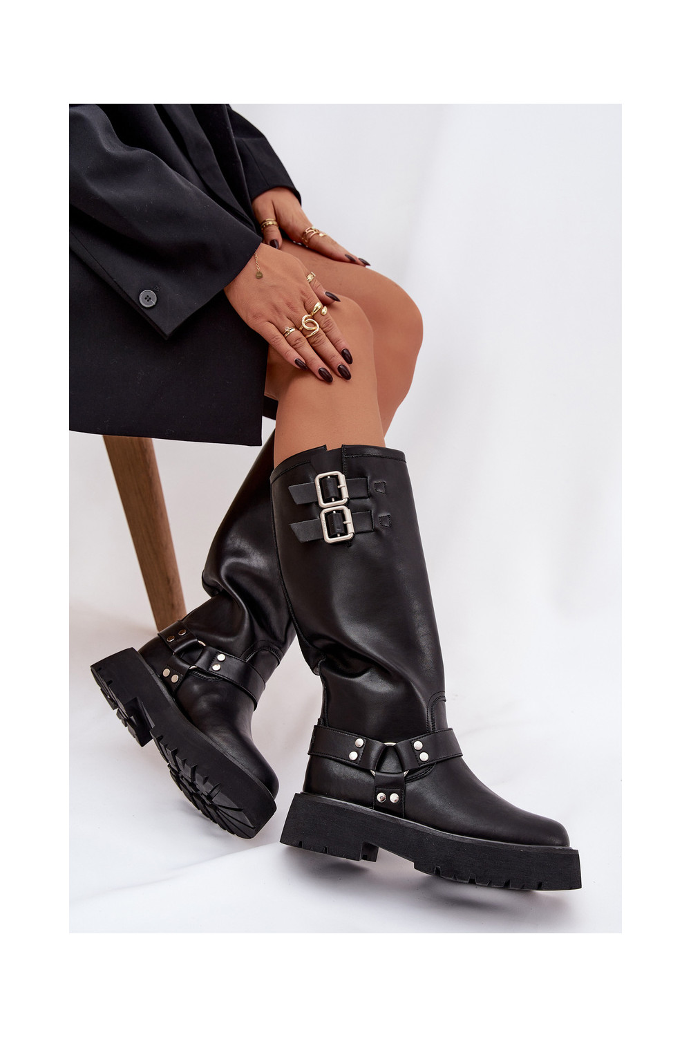 Melni Big Star OO274A180 siltināti sieviešu garie zābaki ar sprādzēm no dabīgās ādas