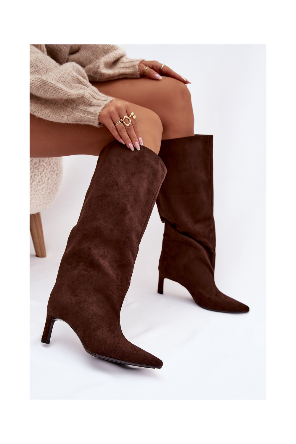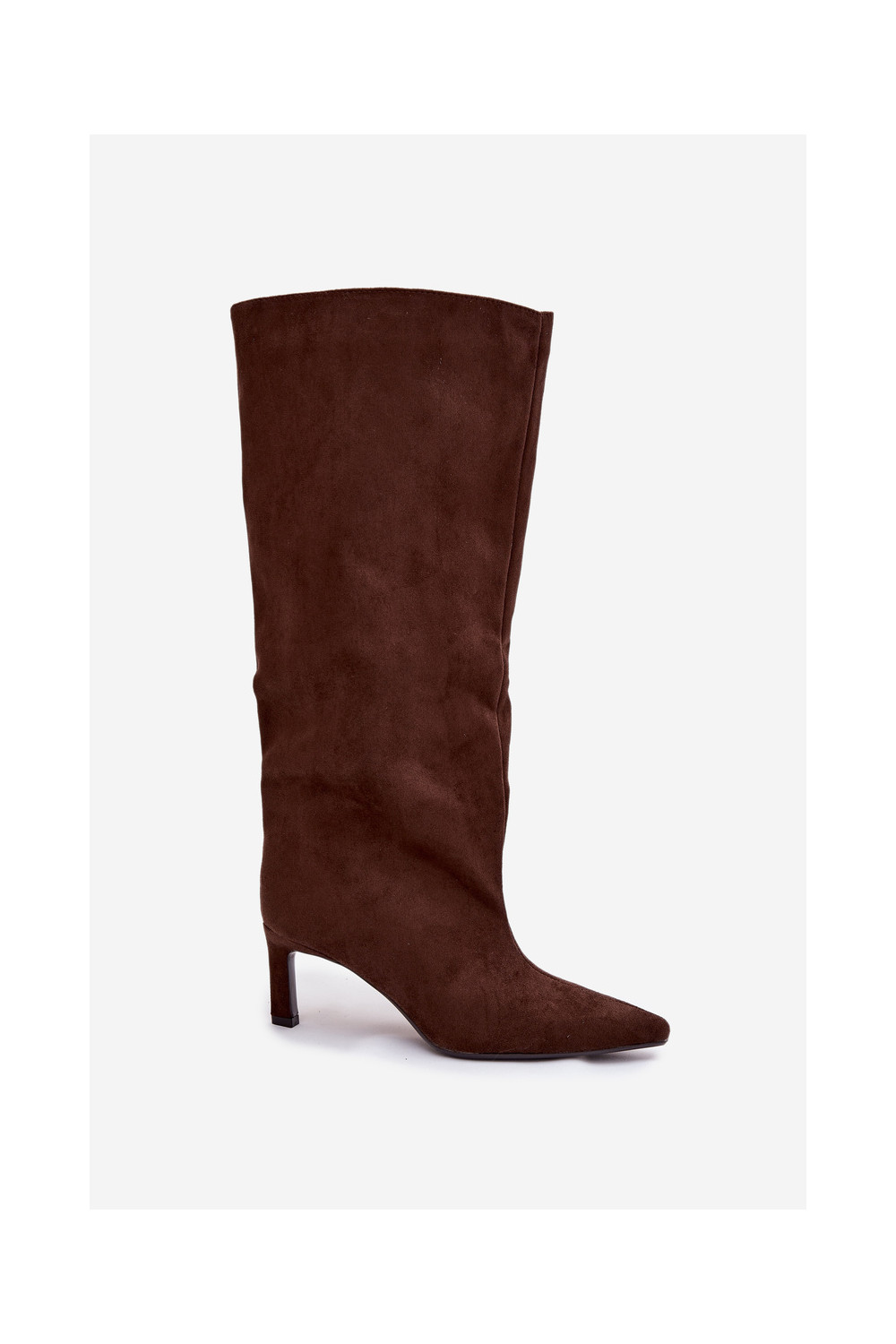 Sieviešu garie zābaki no mākslīgā zamšā, ievelkami, ar plāniem papēžiem, šokolādes krāsā Phelin