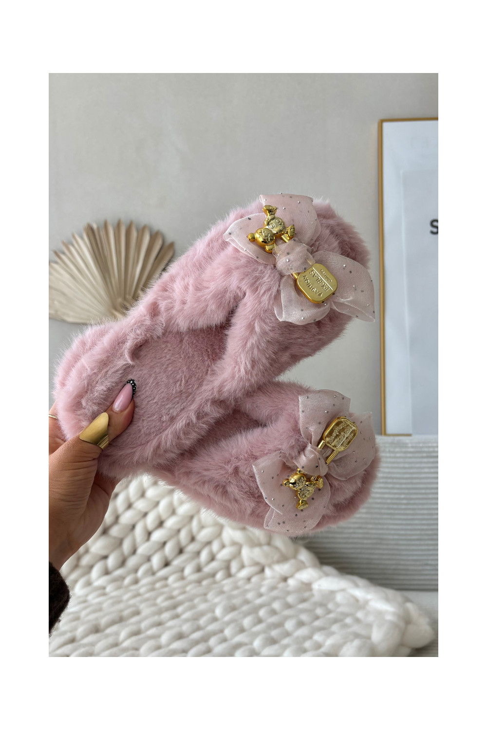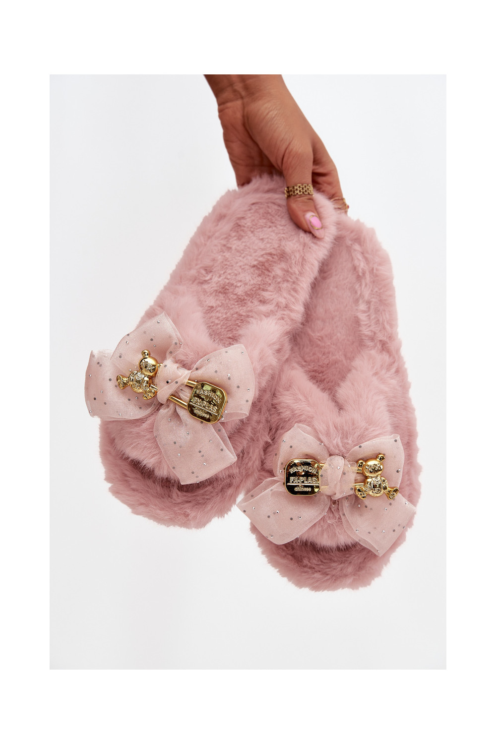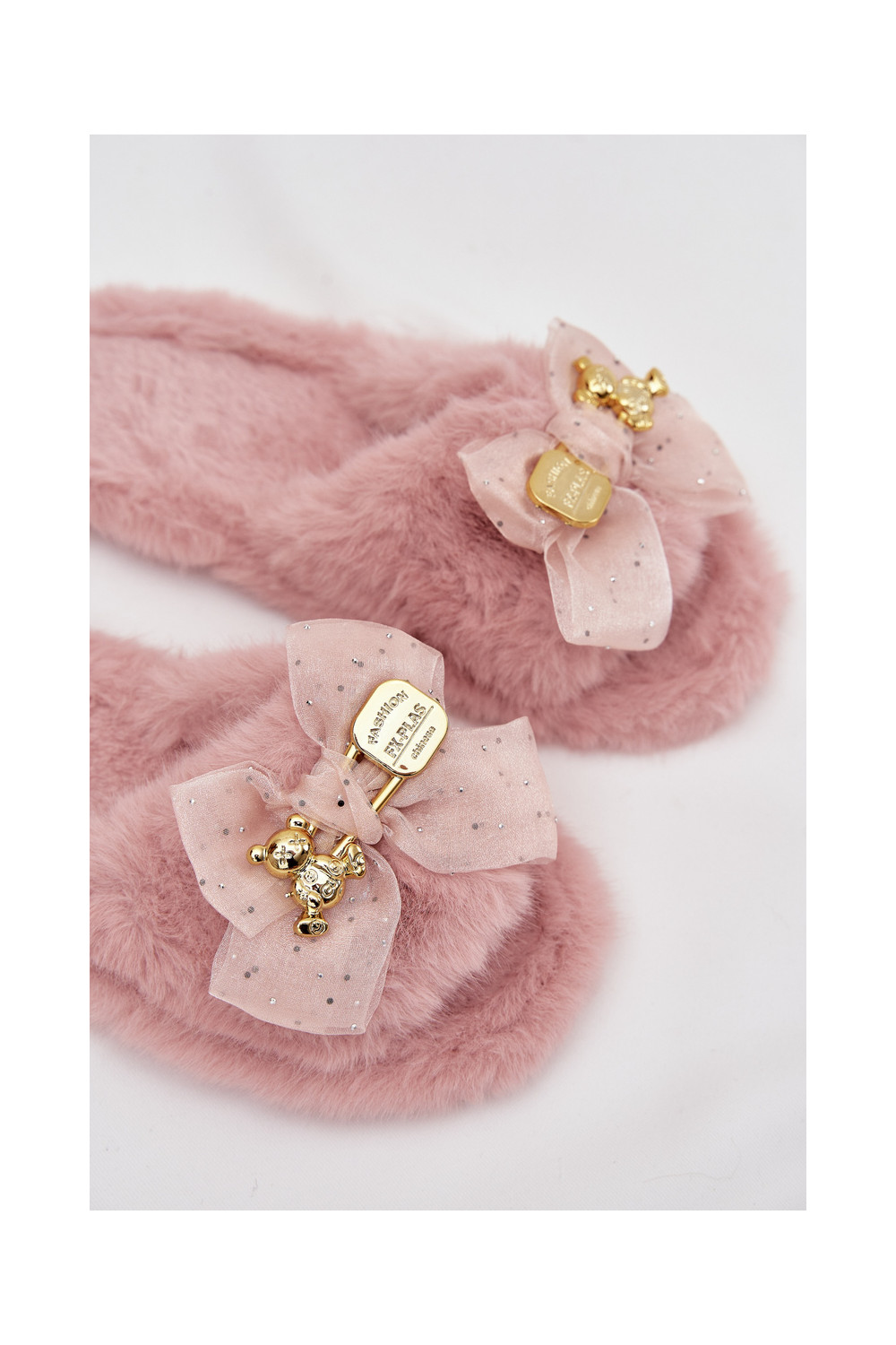 Rozā sieviešu čības ar kažokādu, lentītēm un zelta rotājumu „Nolara"