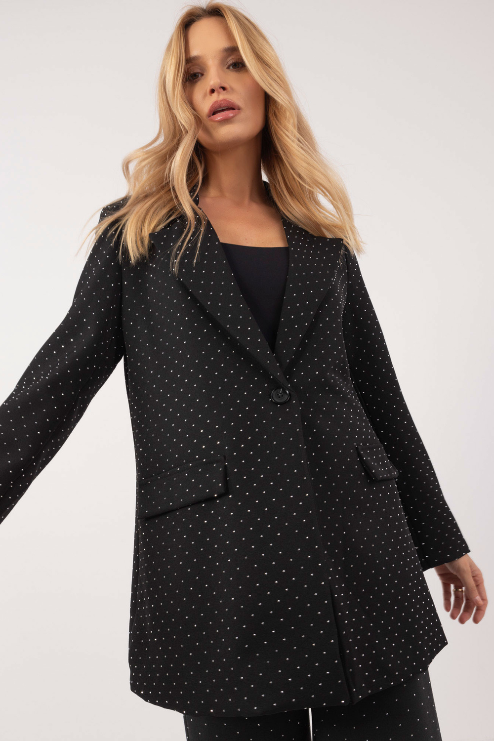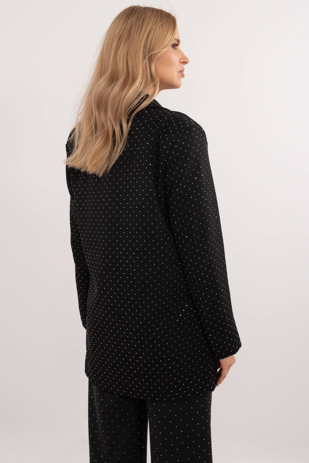 Modele valkā viena izmēra izmēru. Modeļa izmēri: augums 175 cm, krūtis 90 cm, viduklis 66 cm, gurni 94 cm.