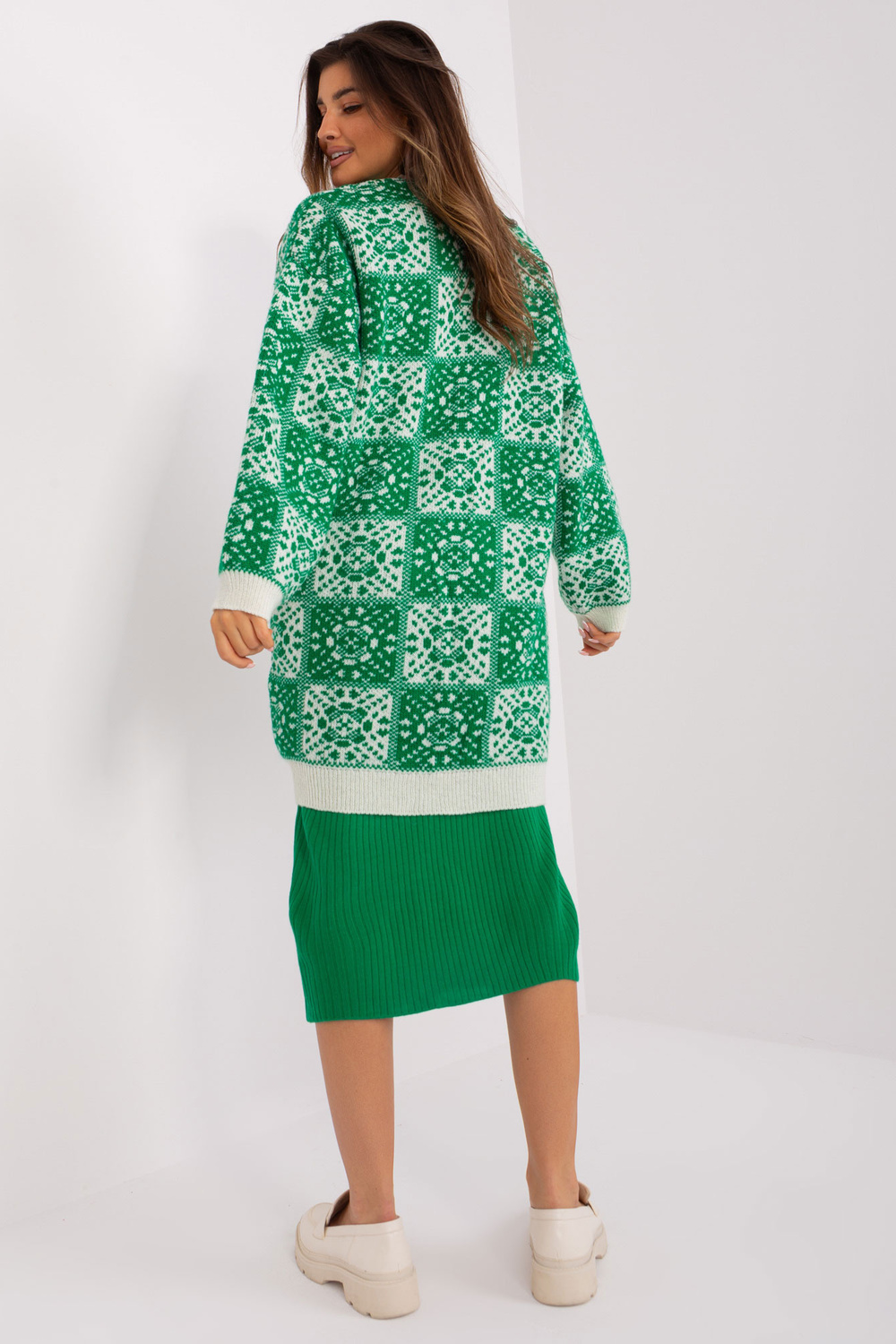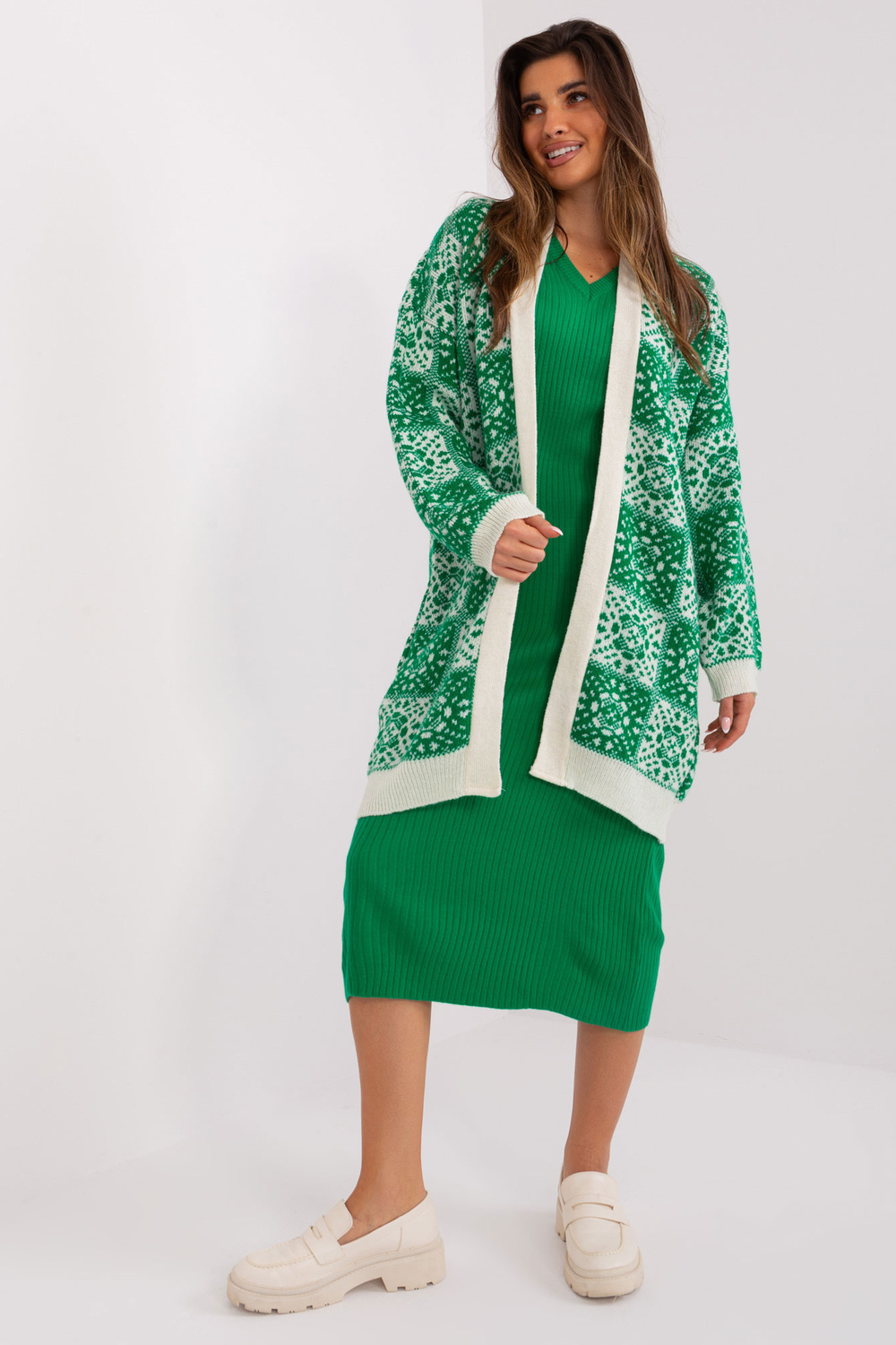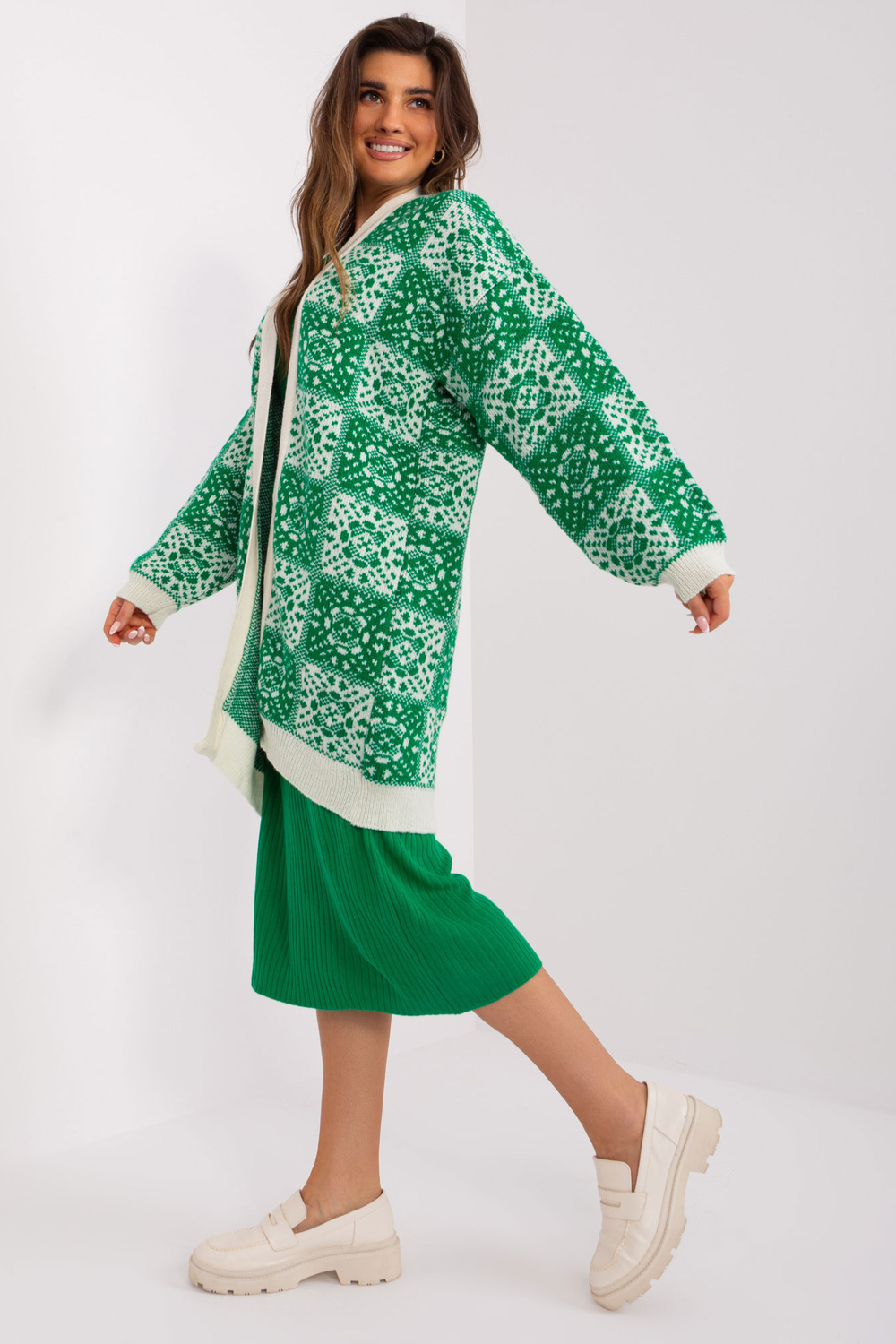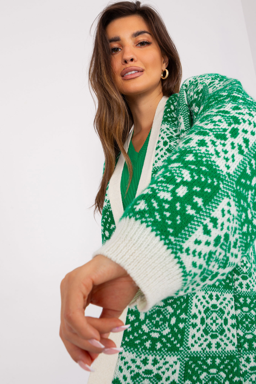 Zaļš un ekru brīvs jaciņš ar rakstiem.