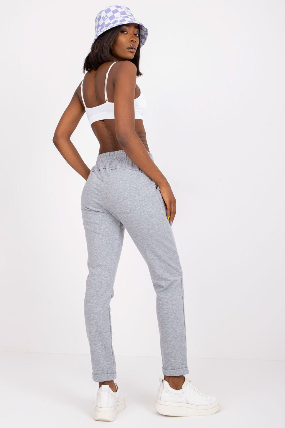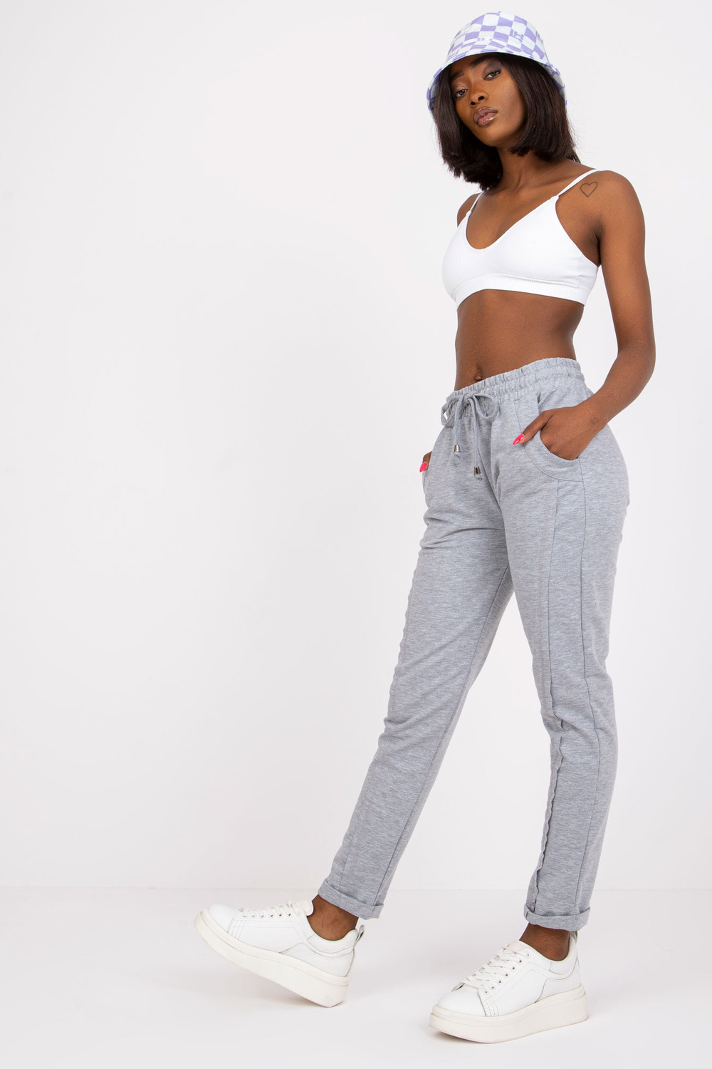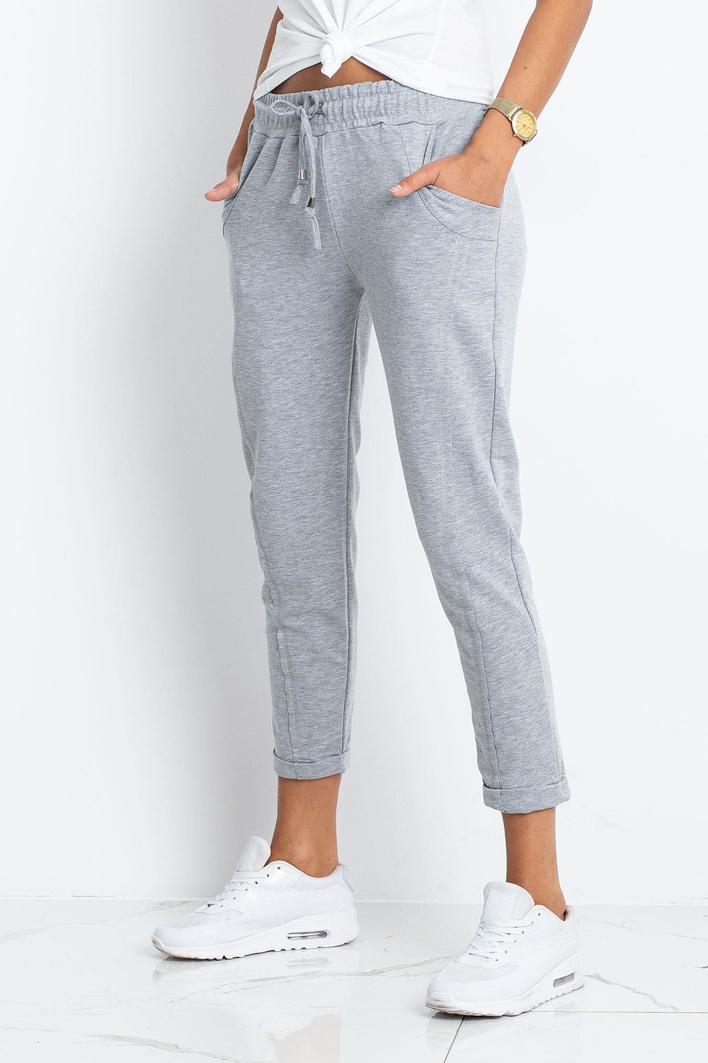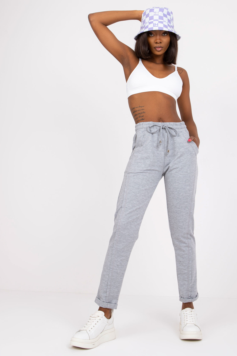 Pelēkās krāsas bikses. Sieviešu treniņbikses ir viens no visvairāk pirktajiem apģērbu stiliem mūsu apģērbu interneta veikalā. Lielu popularitāti, cita starpā, bauda šis modelis, kas izgatavots no melanža kokvilnas trikotāžas auduma ar nelielu ela piejaukumu< /div>