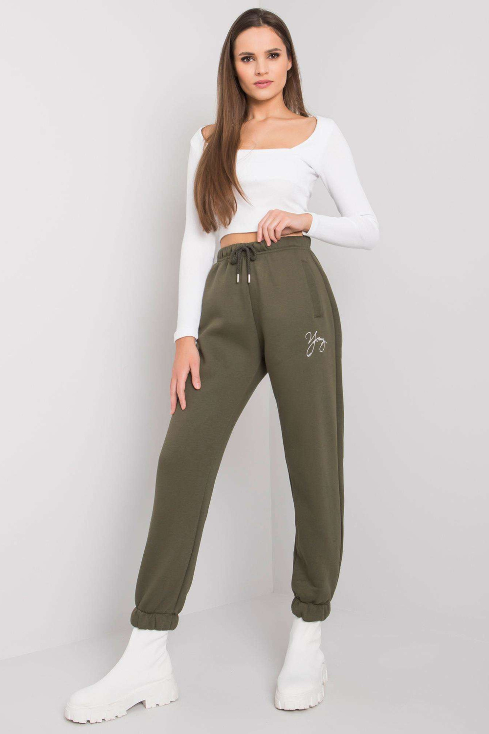 Lightkhaki sporta bikses ar Lilijas uzrakstu.