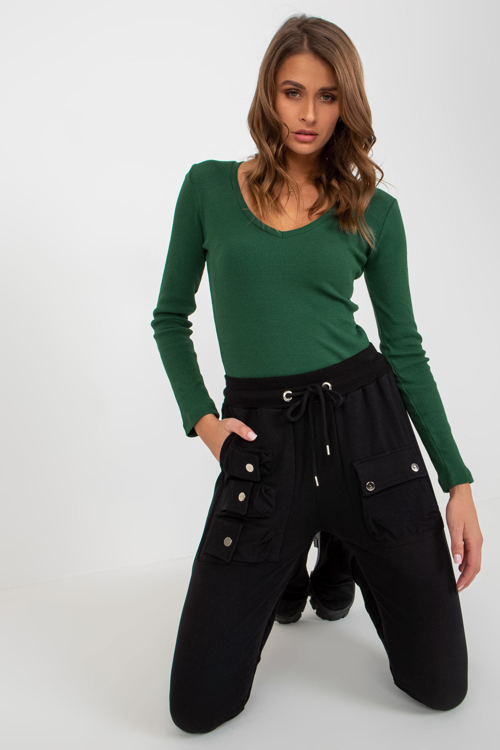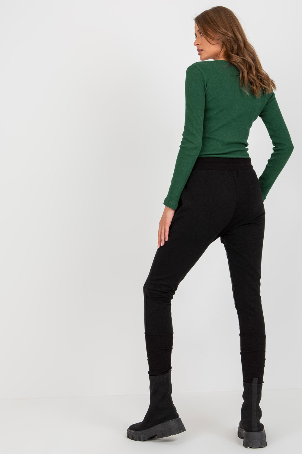 Melnas sieviešu treniņbikses ar atloku kabatām. Produkta kods: EM-DR-ES-21-593.43P Dominējošais raksts: gluds Stils: ikdienišķs gadījums: ikdienišķs, ārpus pilsētas, pastaigā Modele valkā S izmēru. Modeļa izmēri: augums 175 cm, krūšuka 84 cm, viduklis 65