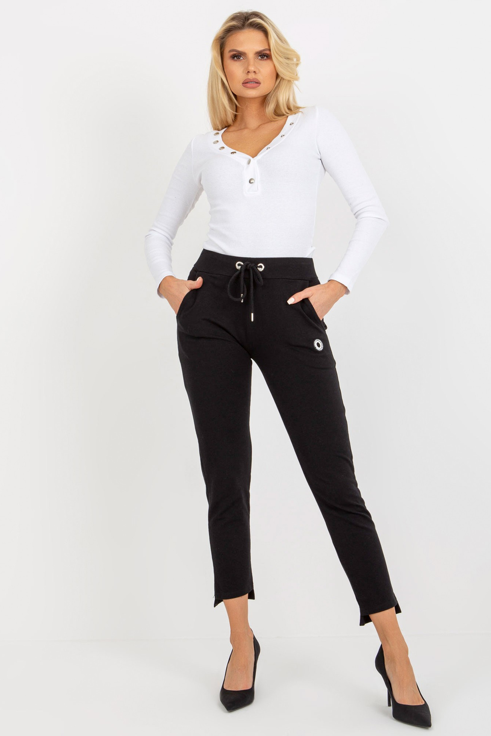 Melnas sieviešu treniņbikses ar iesiešanu. Produkta kods: RV-DR-8370.00 Dominējošais raksts: gluds Stils: neformāls gadījums: ikdienišķs, ārpus pilsētas, pastaigāties Modele valkā S/M izmēru. Modeļa izmēri: augstums 175 cm, krūtis 85 cm, viduklis 63 cm, gurni 95 cm.