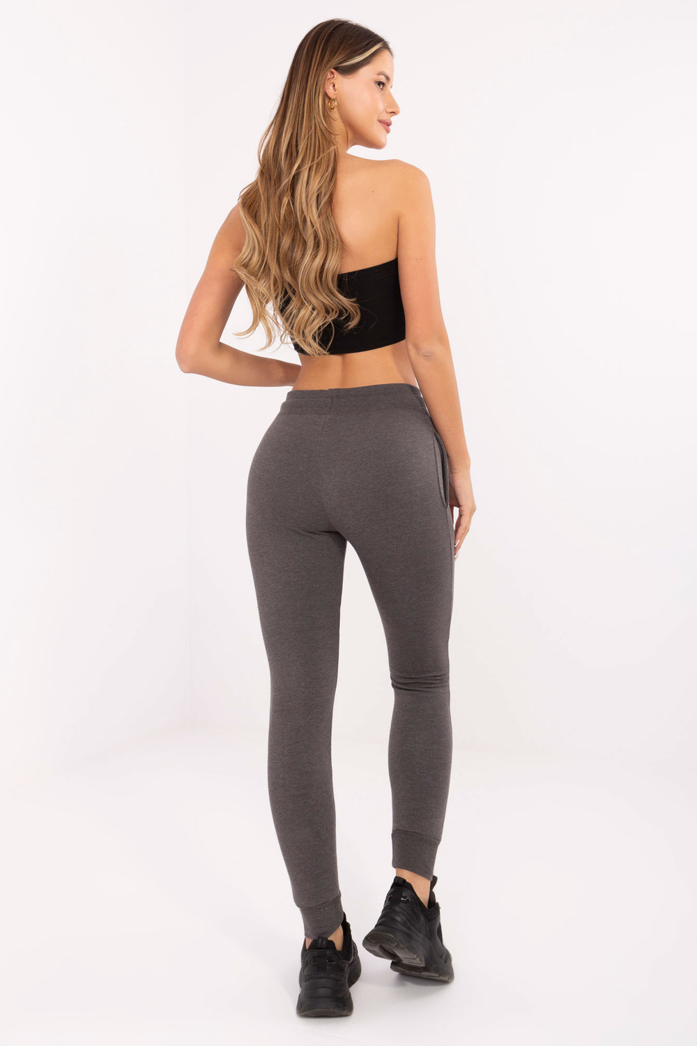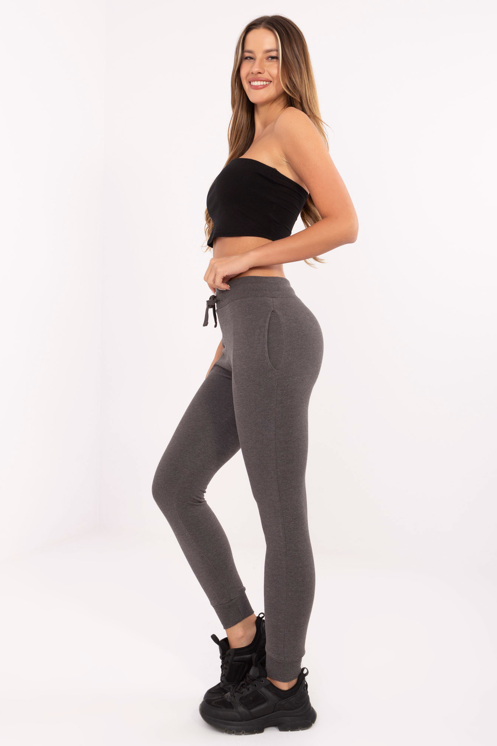 Tumši pelēkas melanžas pamata treniņbikses ar kabatām .