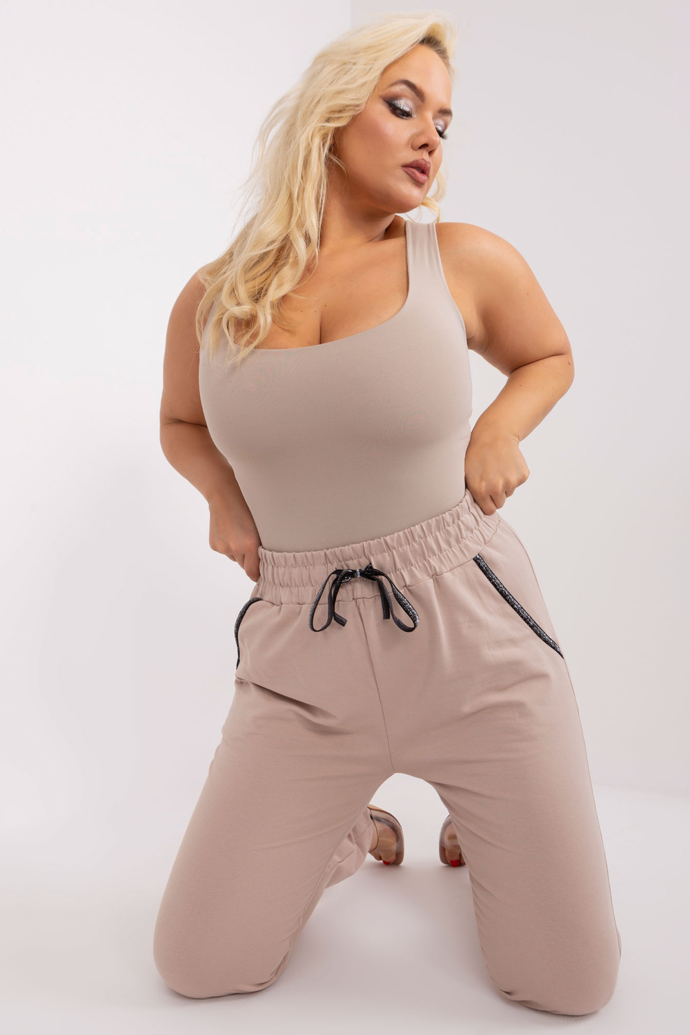 Modele valkā 2XL izmēru. Modeles izmēri: augums 174 cm, krūtis 100 cm, viduklis 74 cm, gurni 107 cm.