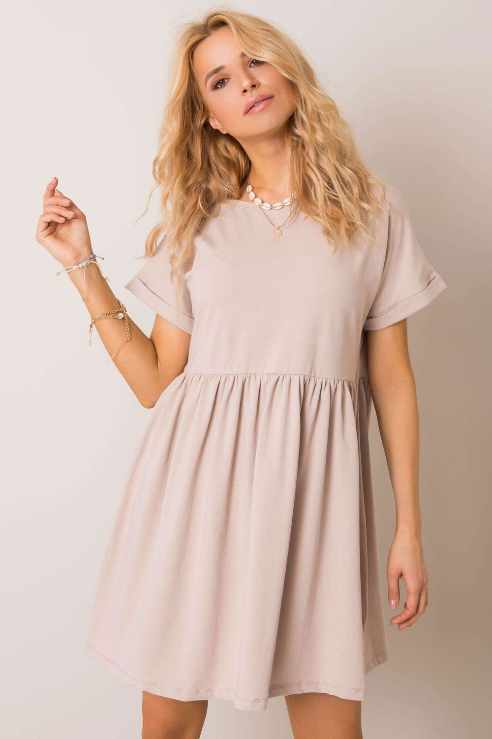 Bēšā kleita Dita RUE PARIS Šī kleita ir obligāta jūsu sezonas garderobē! Vai vēlaties efektīvi uzlabot savu vasaras izskatu? Šī modernā pamata kleita ir izvēle, kuru jūs noteikti nenožēlosiet. Piedāvātais modelis ir īsts kārums visiem brīvā izskata cienītājiem. Viņas lielais piegriezums ir ne tikai ļoti moderns, bet arī nodrošina kustību brīvību. Sasniedziet mūsu stilīgo kleitu universālā tonī, kad nezināt, ko valkāt, lai strādātu vai pastaigātos ar ģimeni. Izgatavots no labas kvalitātes kokvilnas nodrošina izcilu lietošanas komfortu pat karstākajās vasaras dienās. Materiāls ir ļoti gaisīgs un neierobežo kustības. Kleitai moderno raksturu piešķir atlokamās piedurknes. Salieciet to kopā ar kedām un džinsa jaku. Viņa iepazīstinās ar savu meitenīgo šarmu sandaļu un krāsainu rotu kompānijā.
