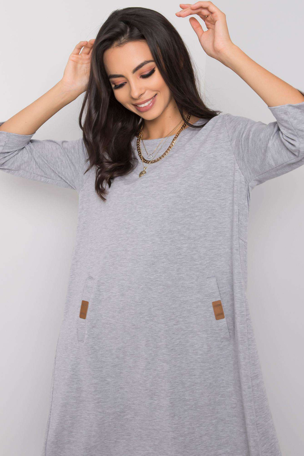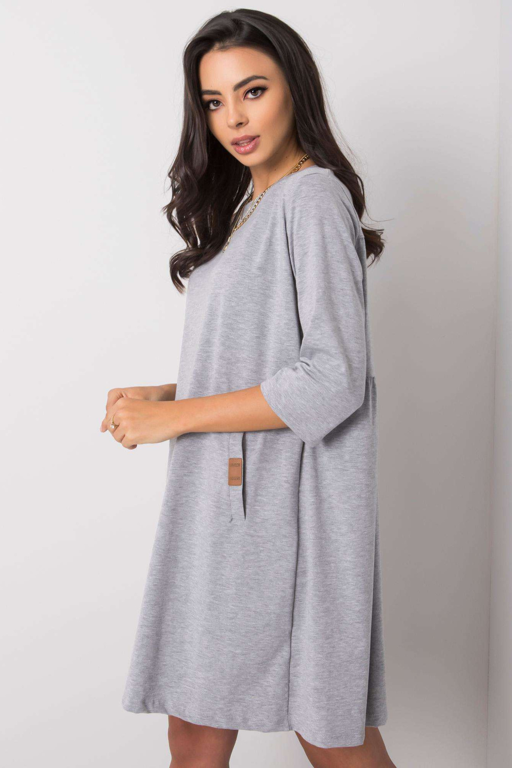 Pelēka kleita ar volāniem Dalenas mugurā .