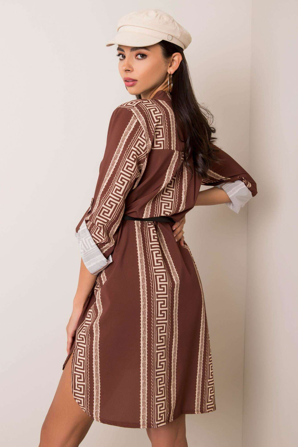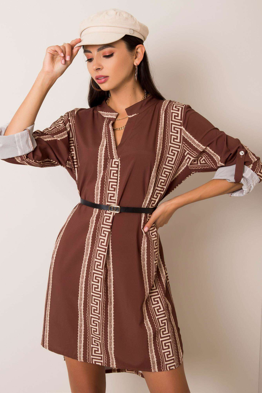 Brūna kleita Elisa. piederumi: josta, uzlokamas piedurknes ar pogu aizdari materiālssastāvs: 95% poliesters, 5% elastāns mazgāšanas metode: veļas mašīna 30°C. Modelis valkā izmēru viens izmērs. Modeļa izmēri: augums 175 cm, krūtis 84 cm, viduklis 61 cm, hi