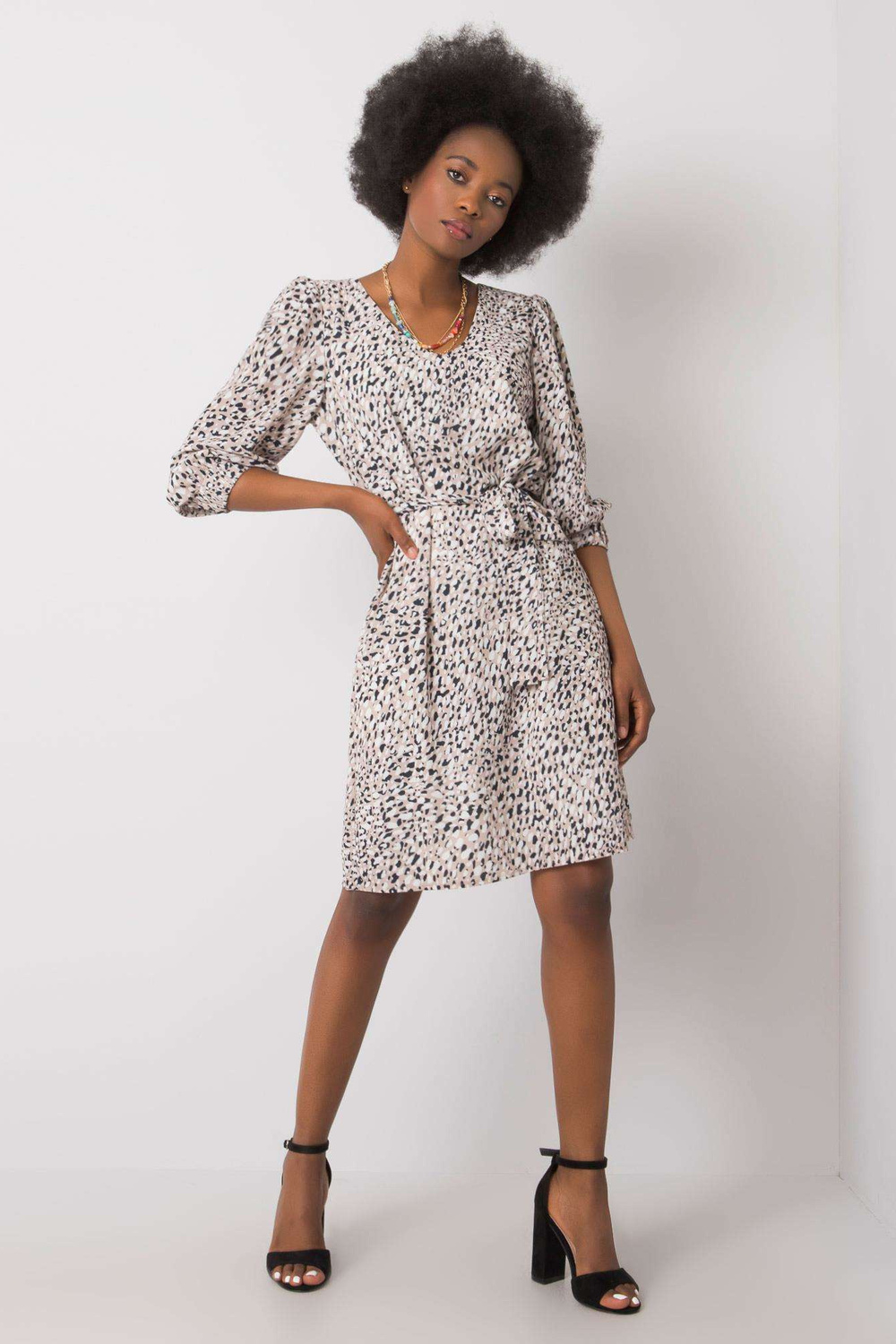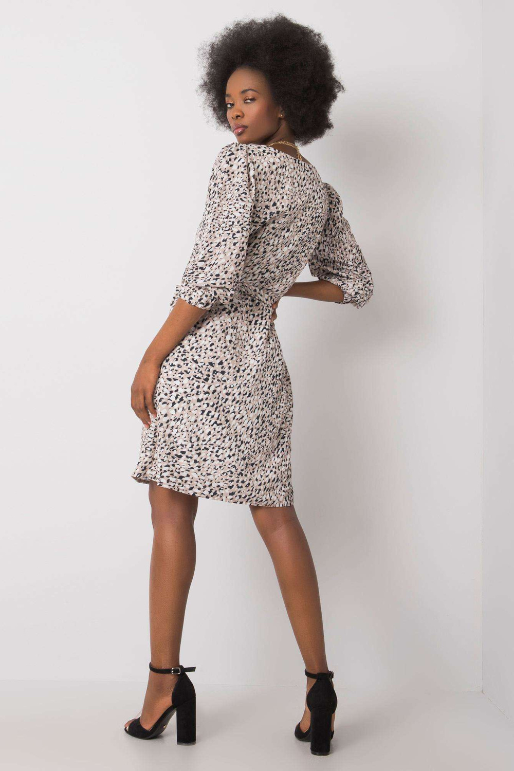 Bēša kleita ar Džiannas apdrukām.