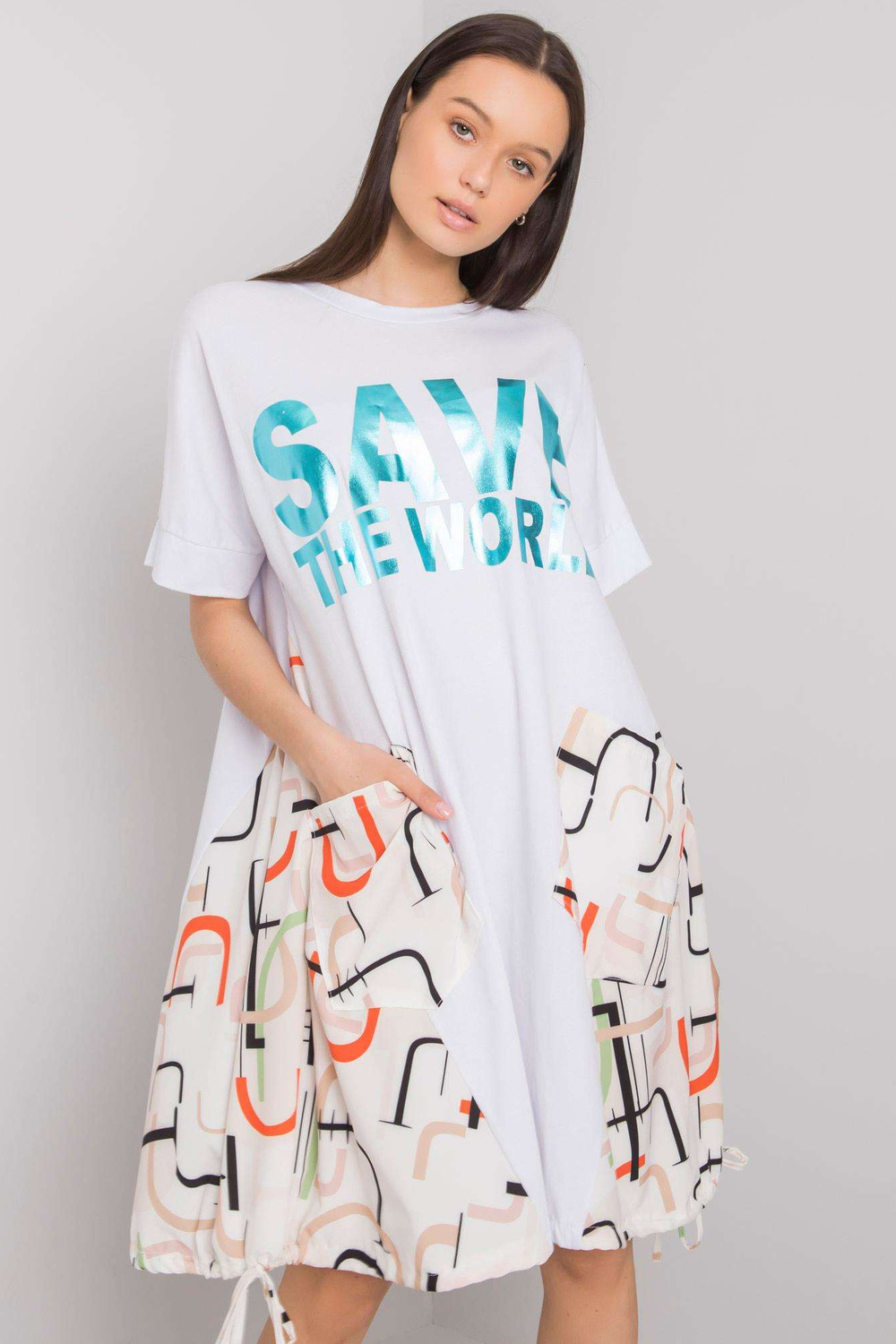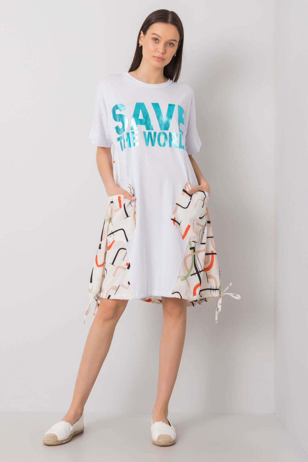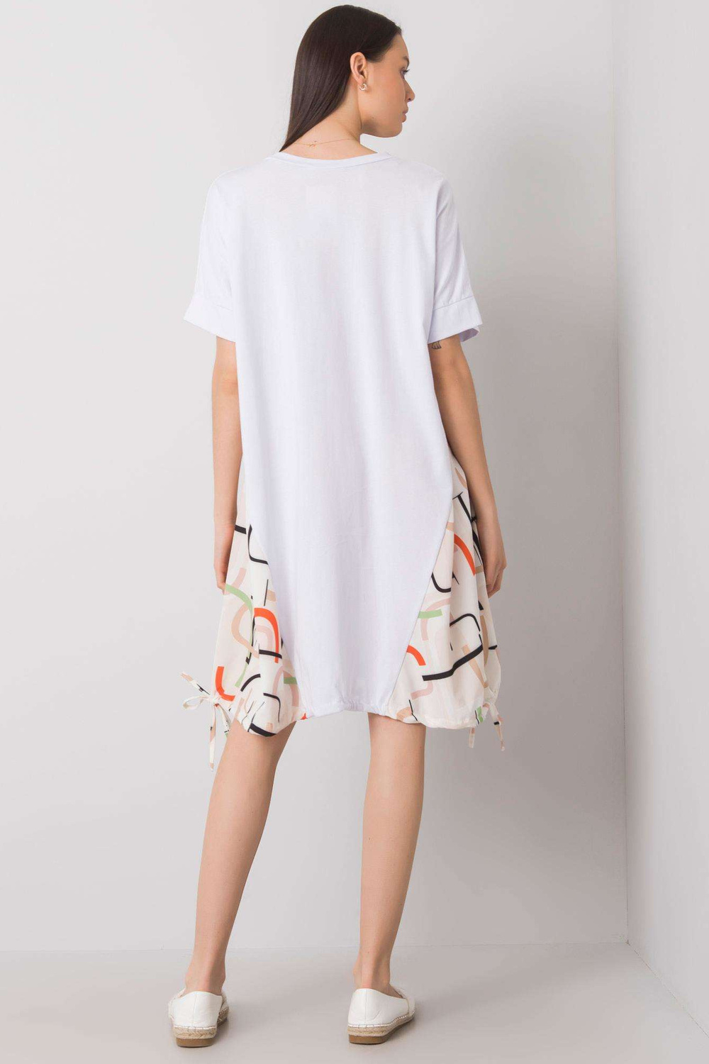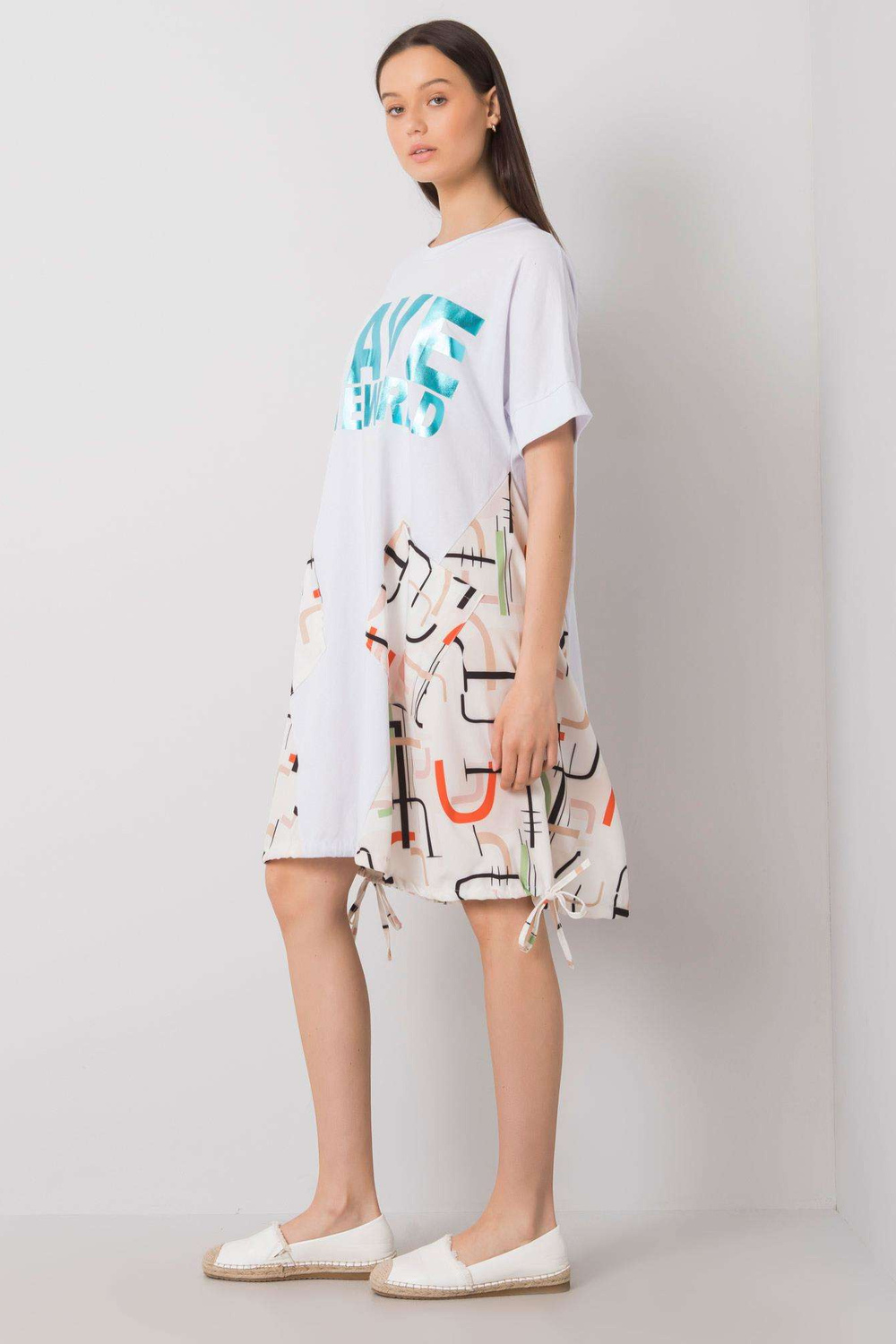 Balta un bēša kleita ar uzrakstu Ebba. materiāla sastāvs: materiāls 1:100% kokvilna, materiāls 2:55% poliesters, 45% viskoze mazgāšanas metode: veļas mašīna 30°C. Modelis valkā vienu izmēru. Modeļa izmēri: augums 173 cm, krūtis 81 cm, viduklis 60