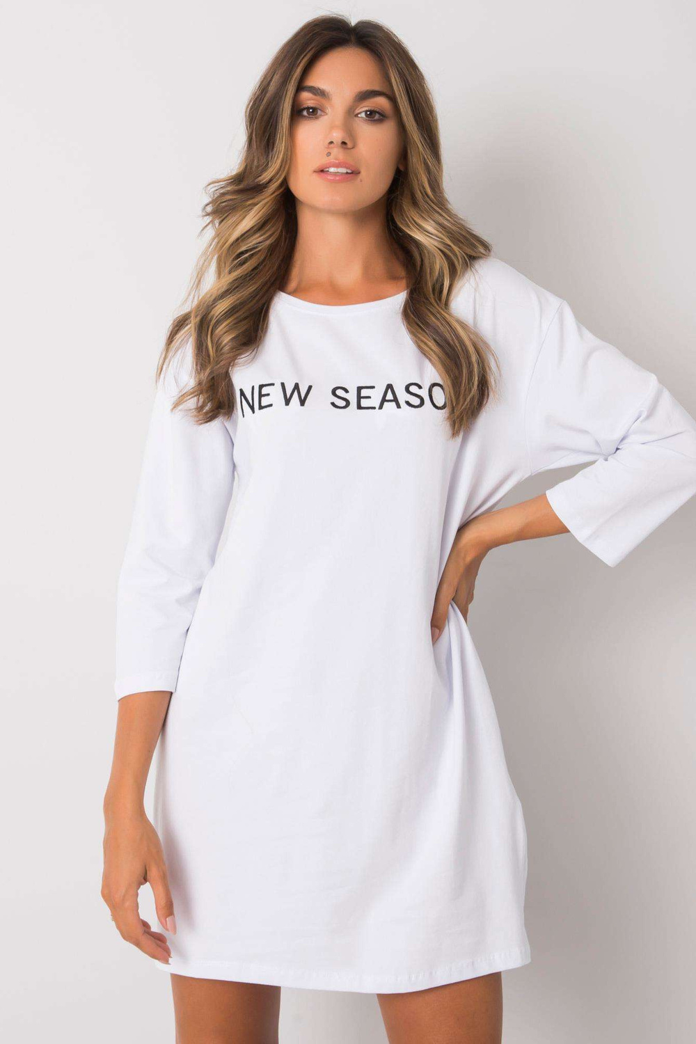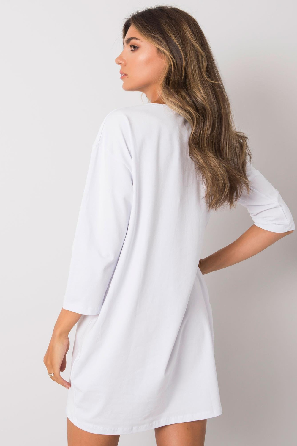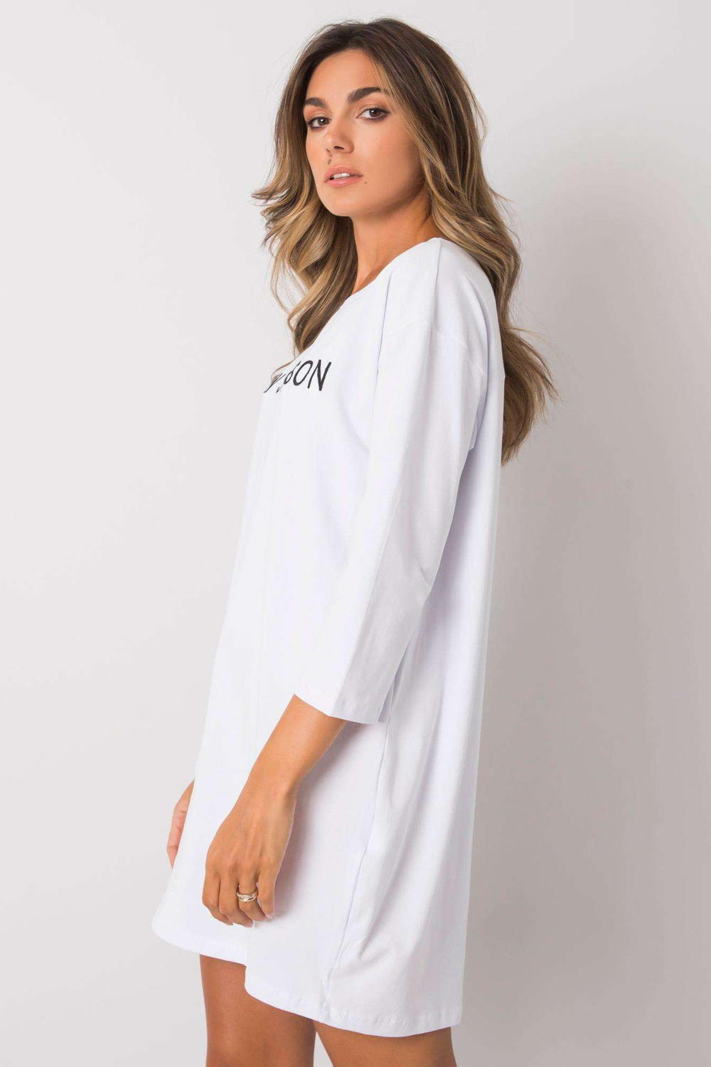Balta kleita ar Raiņa uzrakstu. materiālssastāvs: 90% kokvilna, 10% elastāns Mazgāšanas metode: mazgāšana veļasmašīnā 30°C Modelis valkā S izmēru. Modeļa izmēri: augstums 175 cm, krūtis 85 cm, viduklis 65 cm, gurni 89 cm. Kleitas izmēri izmērā