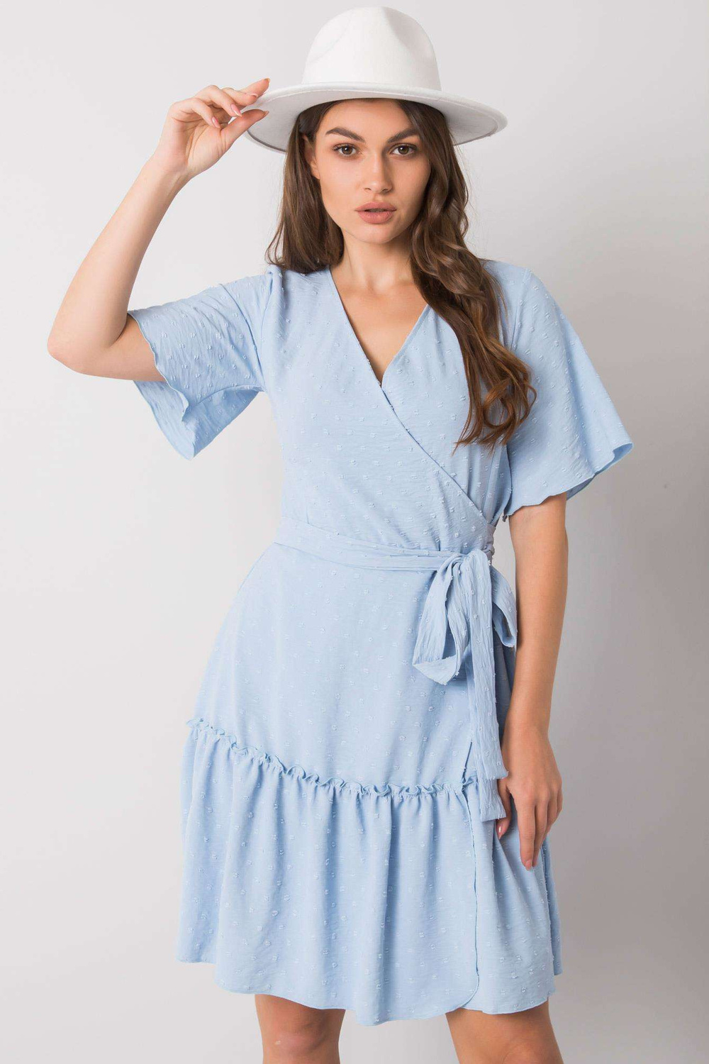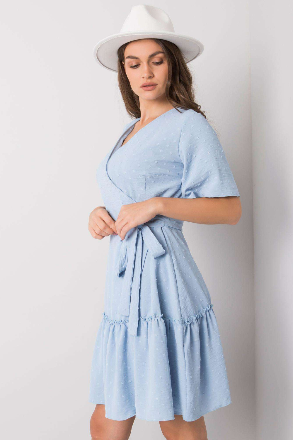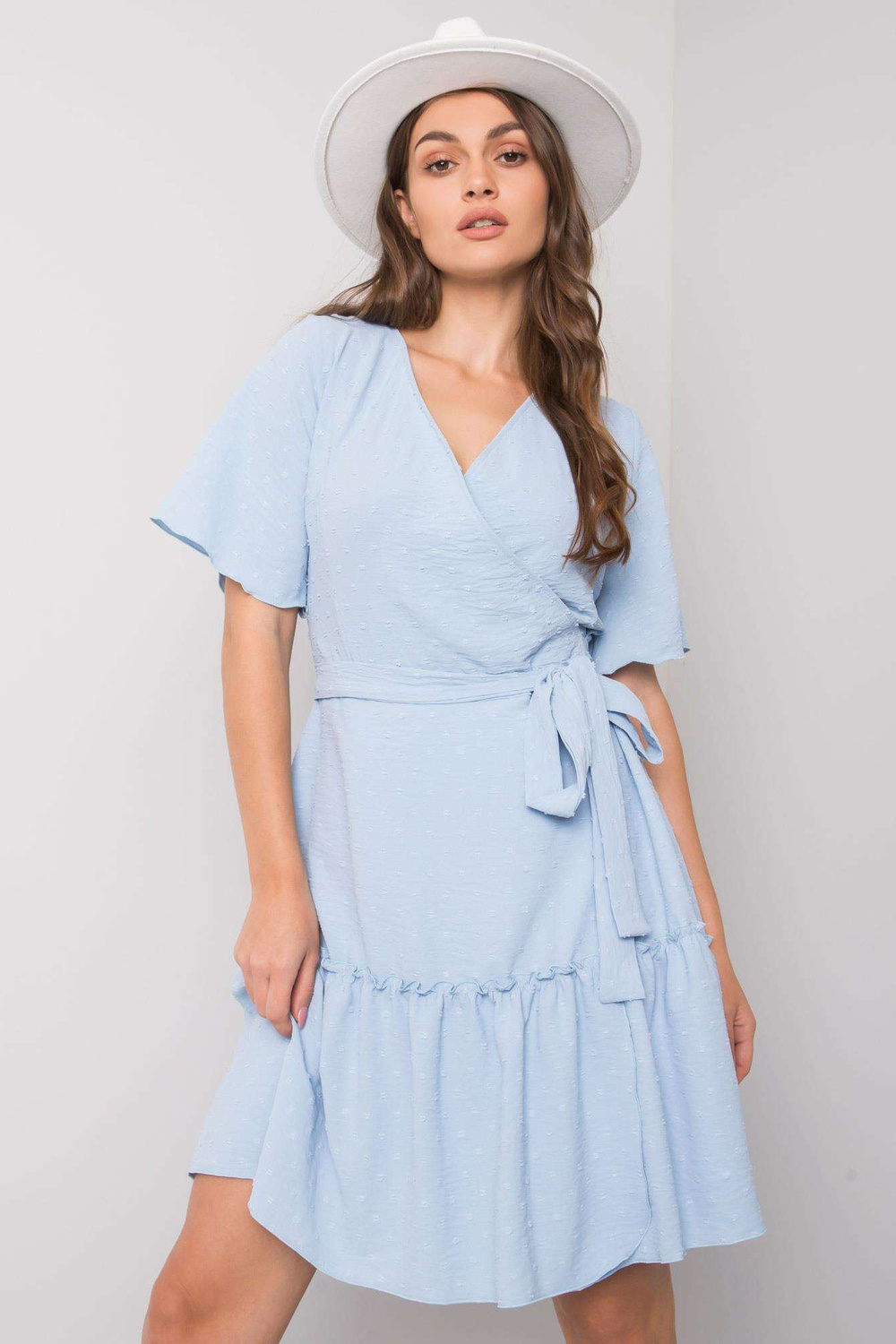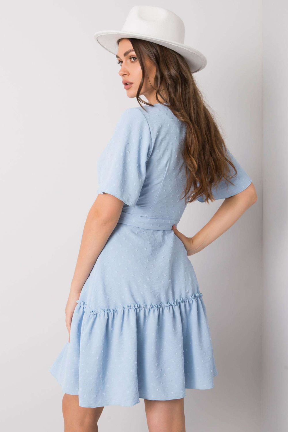 Zilā kleita ar volānu Lachelle. materiālssastāvs: 65% kokvilna, 30% poliesters, 5% likra mazgāšanas metode: mazgāšana veļasmašīnā 30°C Modelis valkā 36. izmēru. Modeļa izmēri: augstums 170 cm, krūtis 93 cm, viduklis 66 cm, gurni 93 cm. Kleitas izmēri si
