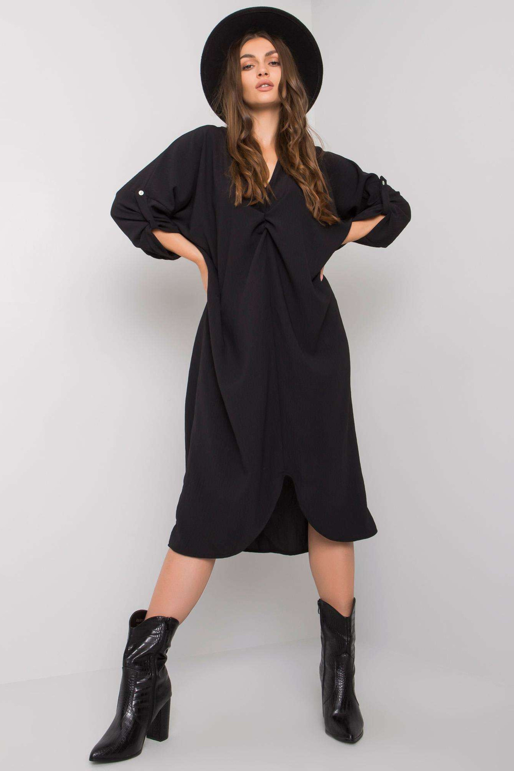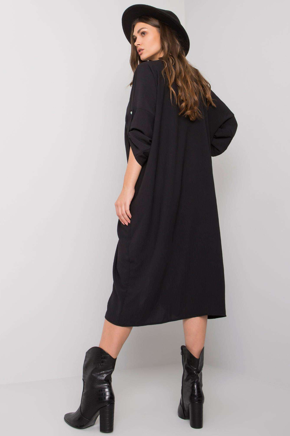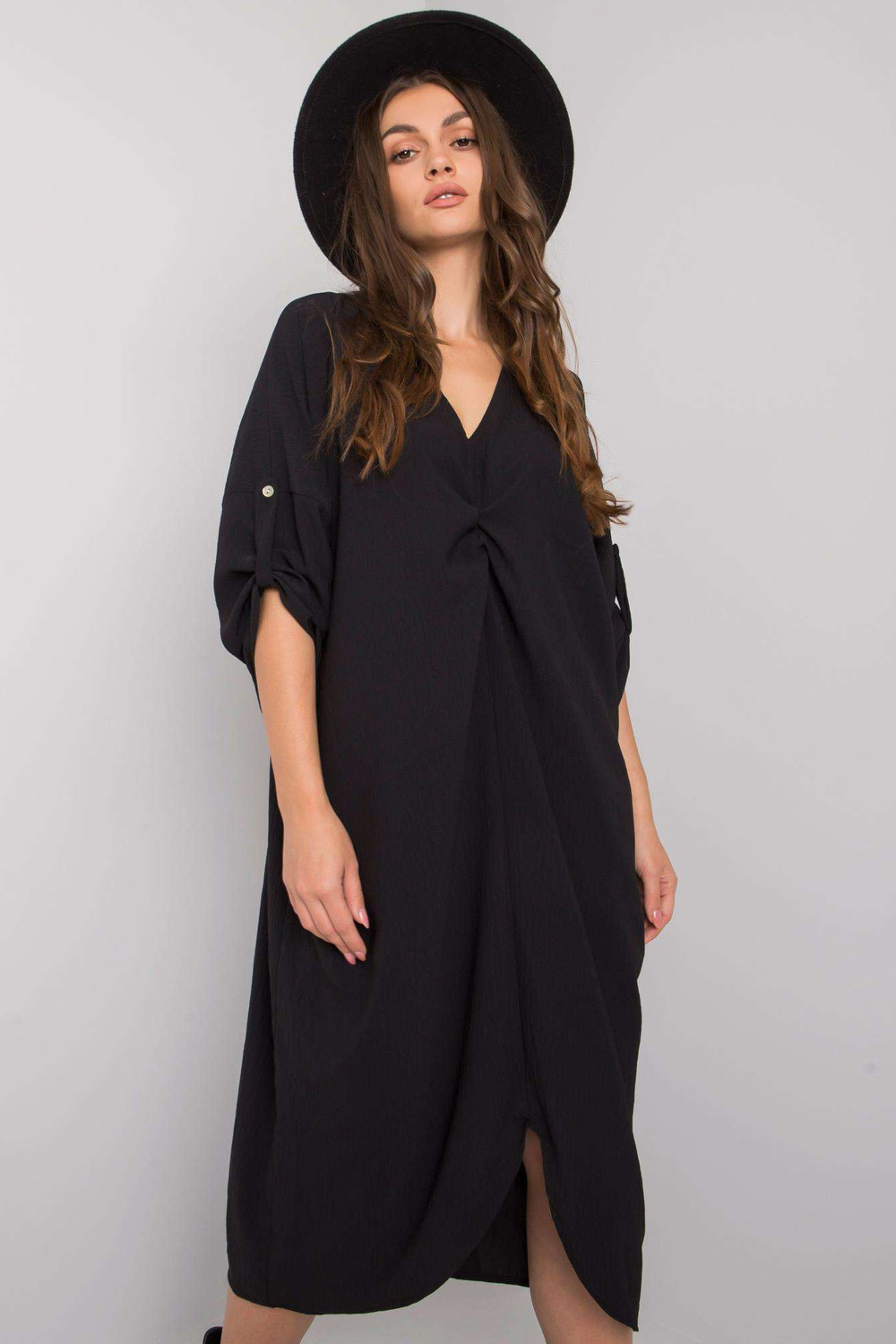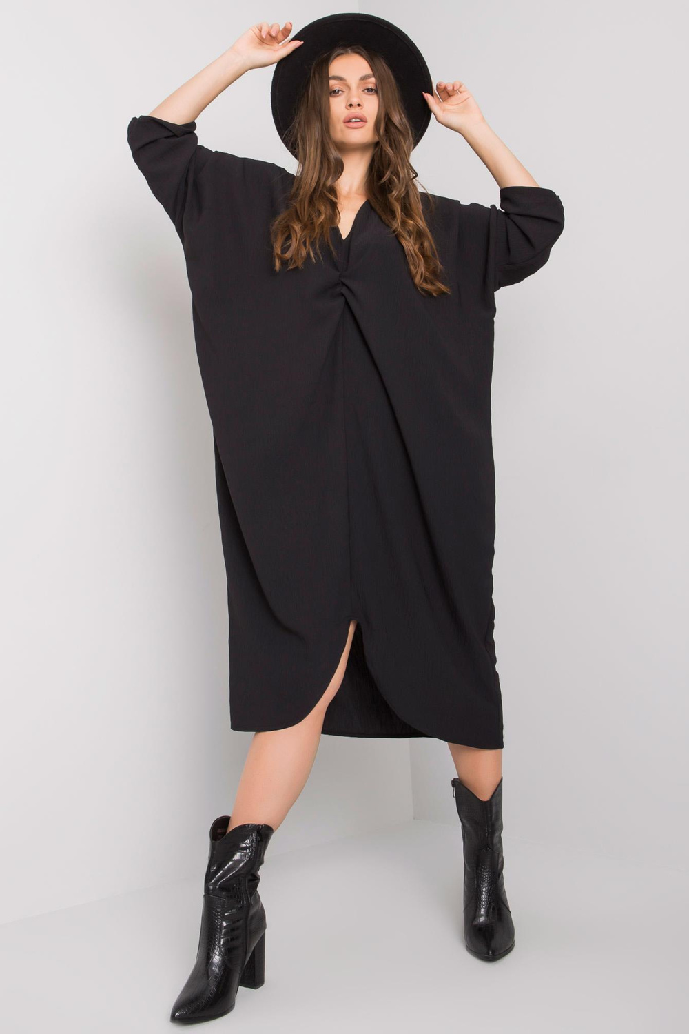 < p>Modele valkā viena izmēra izmēru. Modeļa izmēri: augums 170 cm, krūtis 93 cm, viduklis 66 cm, gurni 93 cm.Kleitas izmēri vienā izmērā, mērot plakani: platums zem padusēm - 69 cm, kopējais garums - 112 cm, piedurkņu garums - 49 cm