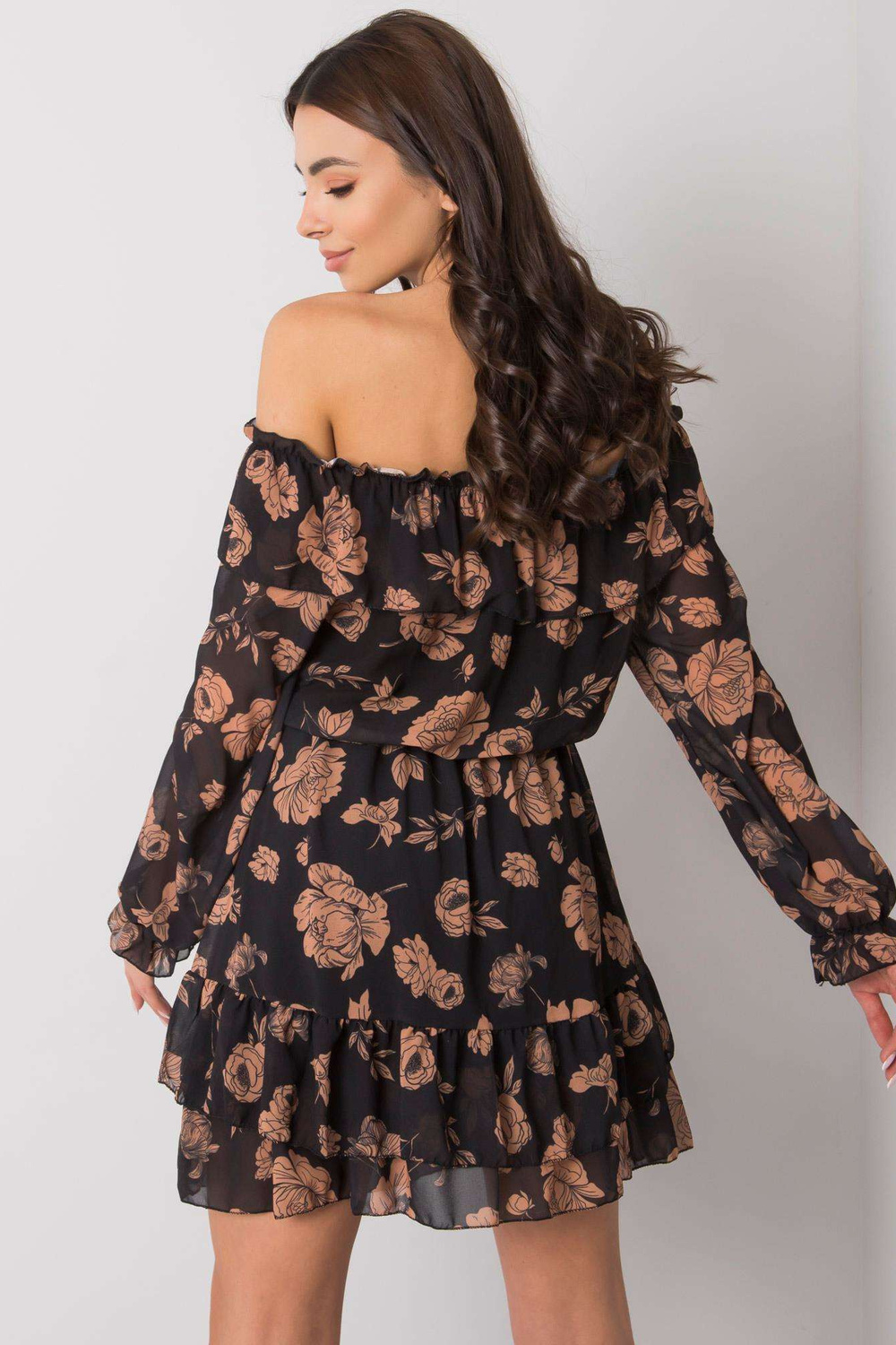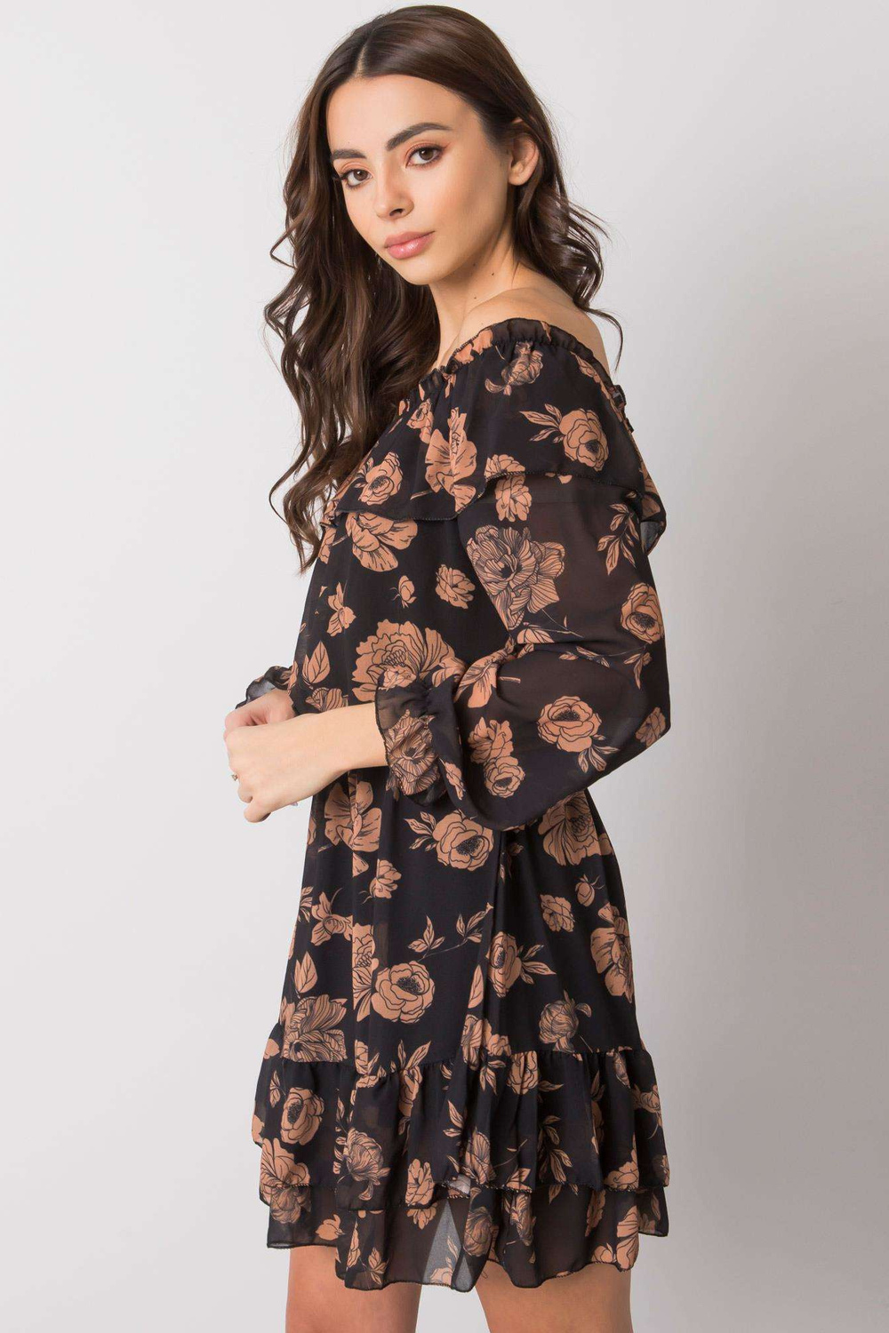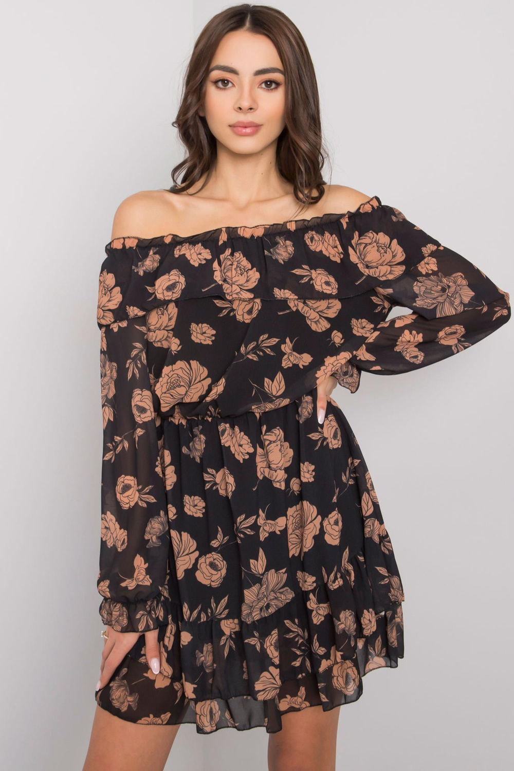 Melna un kamieļu kleita ar spāņu kakla izgriezumu.