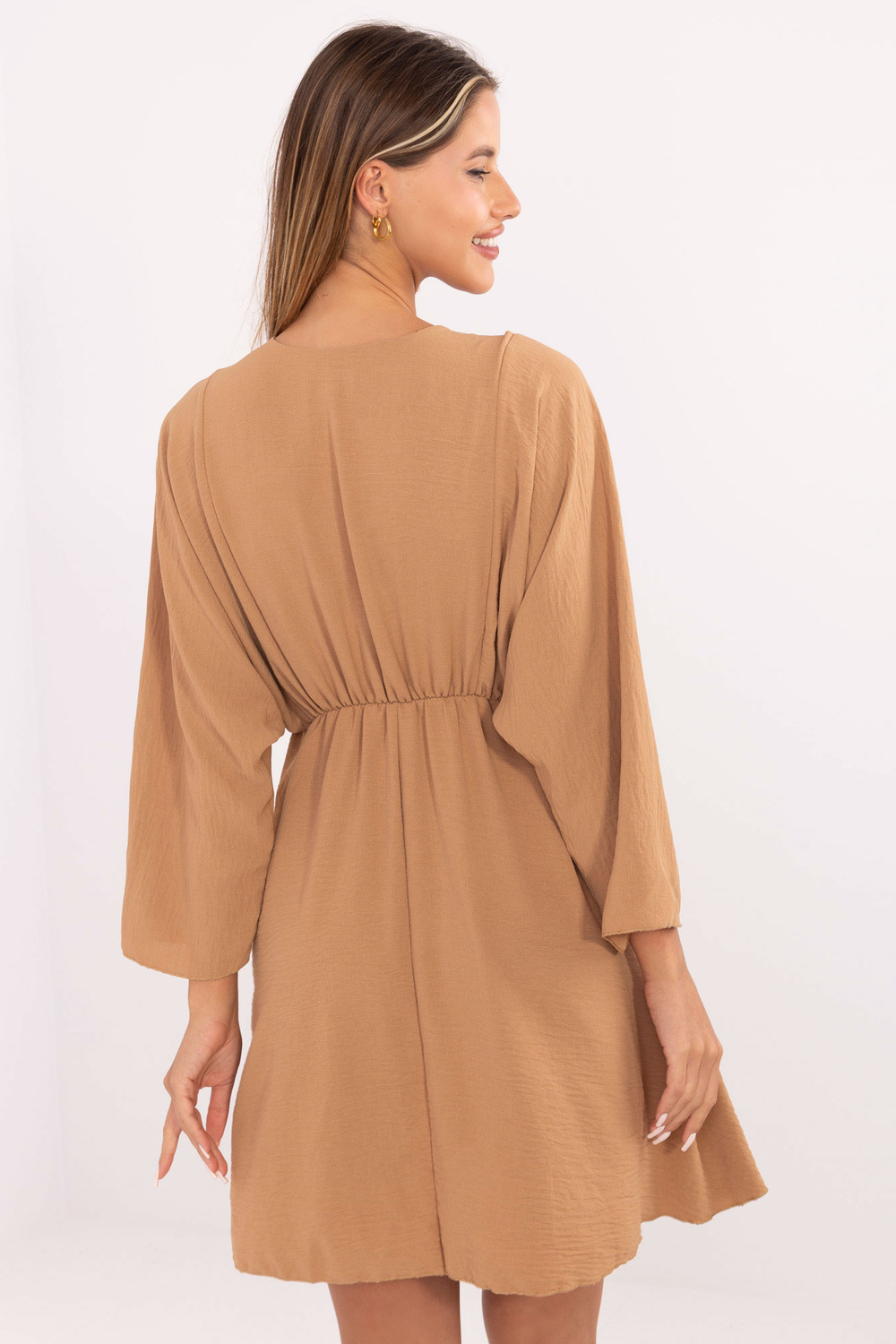 < p>Modele valkā viena izmēra izmēru. Modeļa izmēri: augums 172 cm, krūtis 88 cm, viduklis 61 cm, gurni 92 cm.Kleitas izmēri vienā izmērā, mērot plakani: platums zem padusēm - 53 cm, kopējais garums - 91 cm, piedurkņu garums - 56 cm