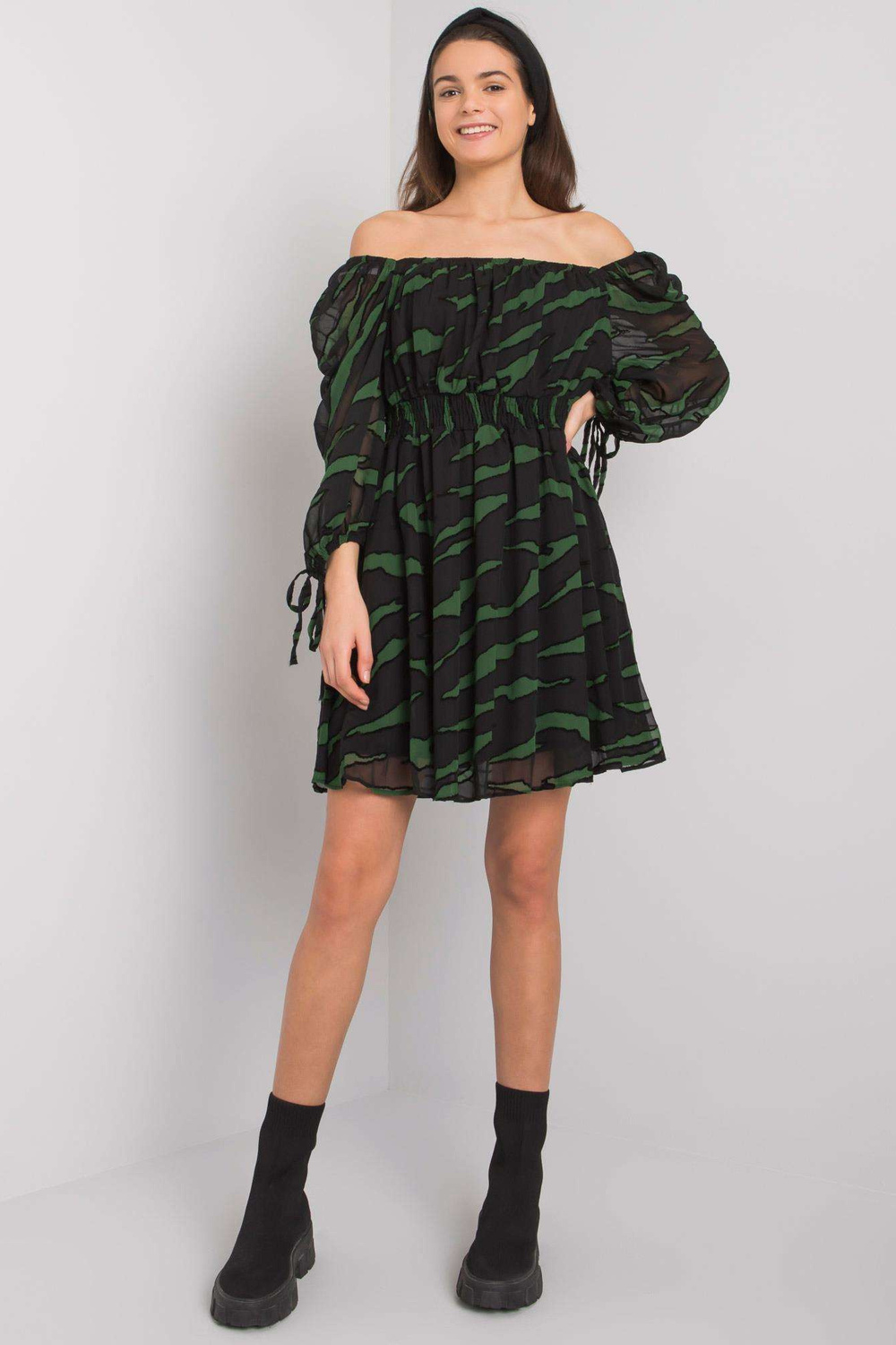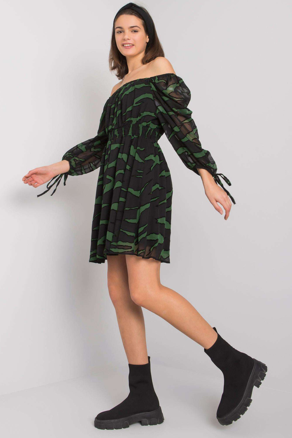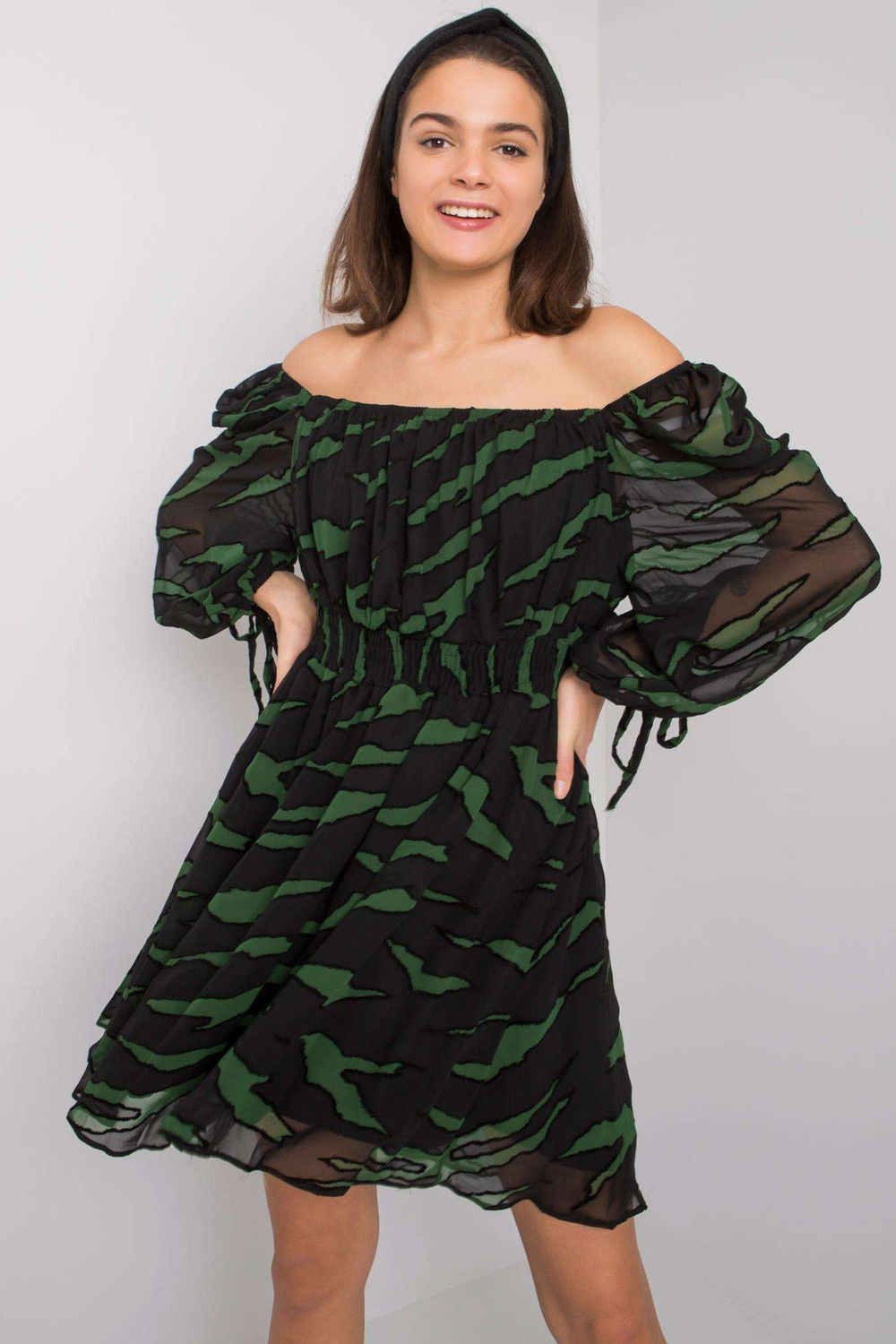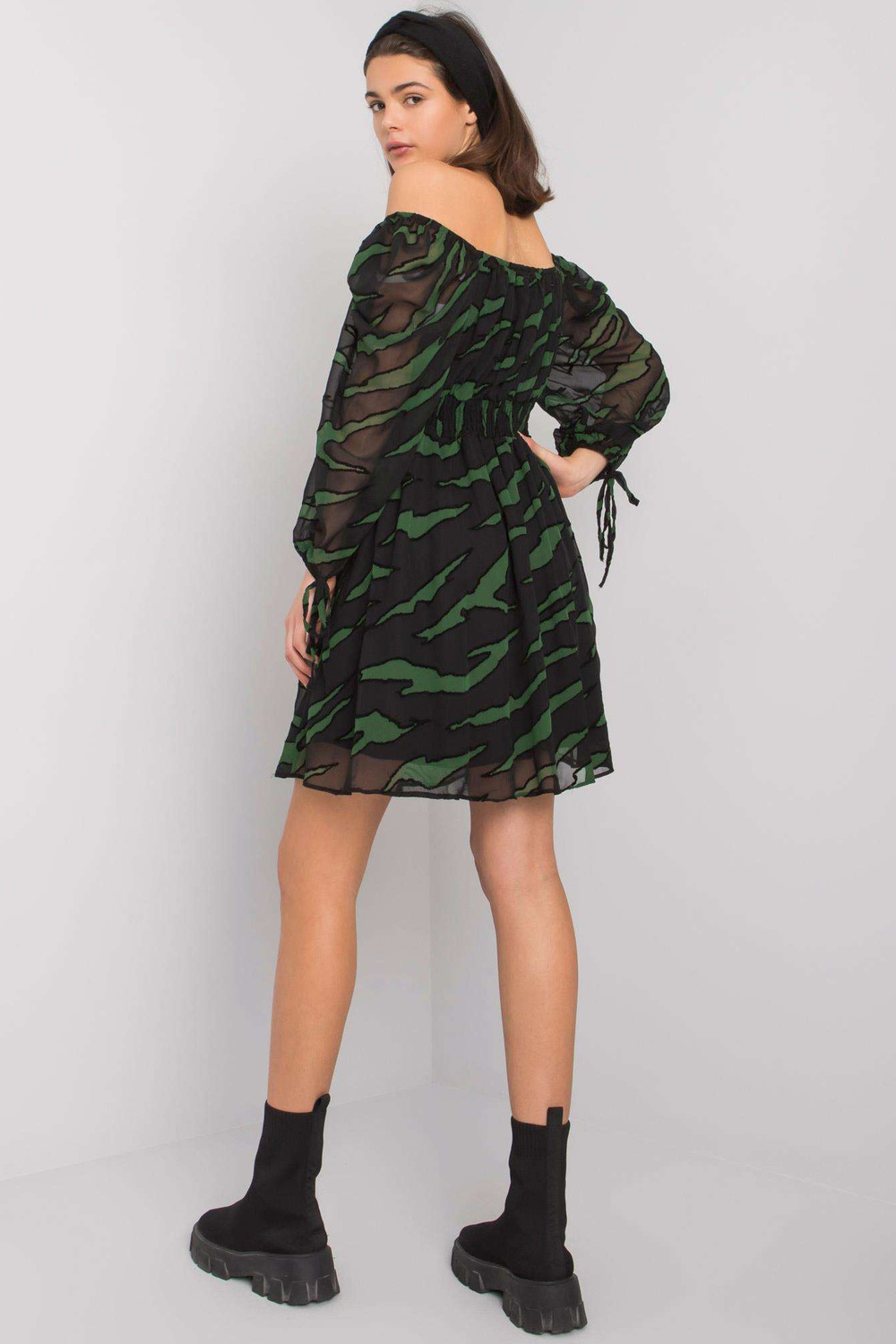 Melnzaļa spāņu kleita ar Filipu apdrukām . ekstras: odere Materiālssastāvs: 100% poliesters mazgāšanas metode: veļas mašīna 30°C Modelis valkā S izmēru. Modeļa izmēri: augums 175 cm, krūtis 83 cm, viduklis 61 cm, gurni 88 cm. Izmērs