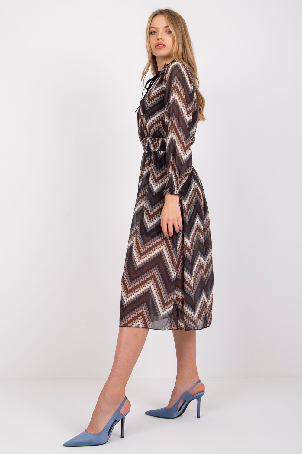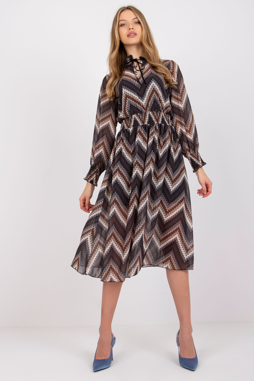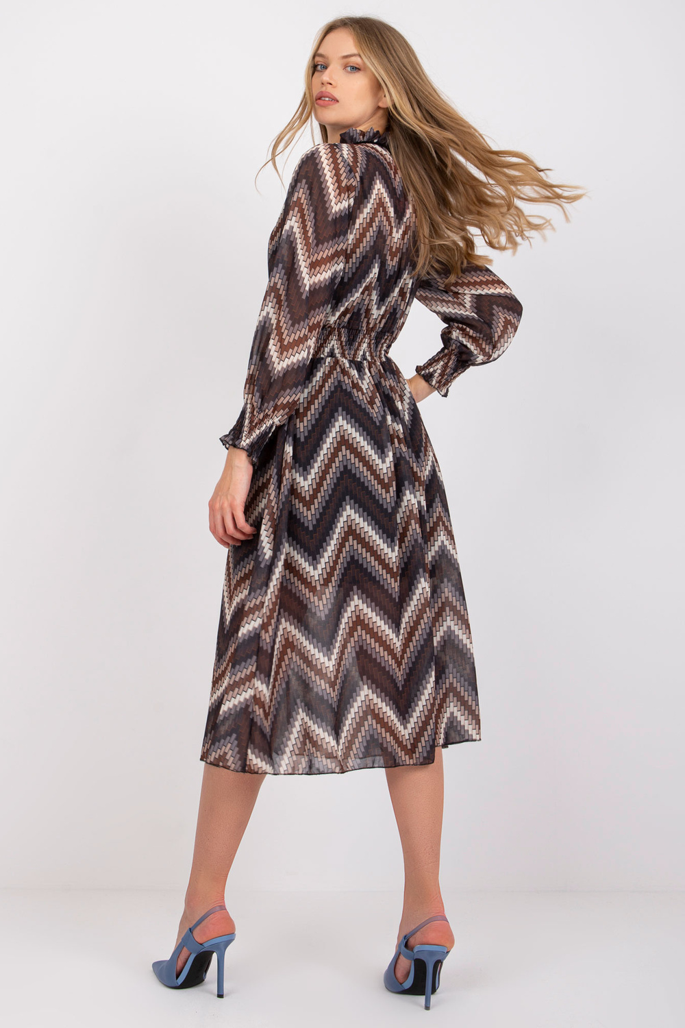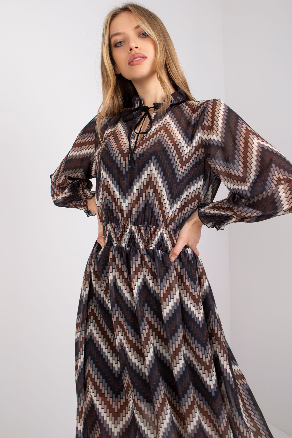 Modelis valkā viena izmēra izmēru. Modeļa izmēri: augums 174 cm, krūtis 82 cm, viduklis 62 cm, gurni 89 cm.