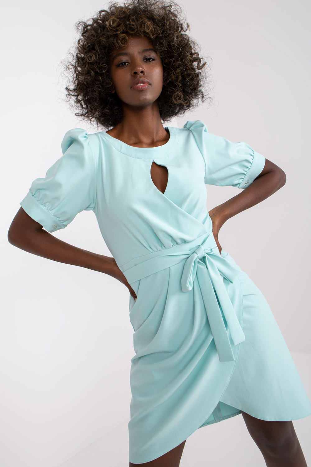 Piparmētru kokteiļkleita ar īsām piedurknēm .