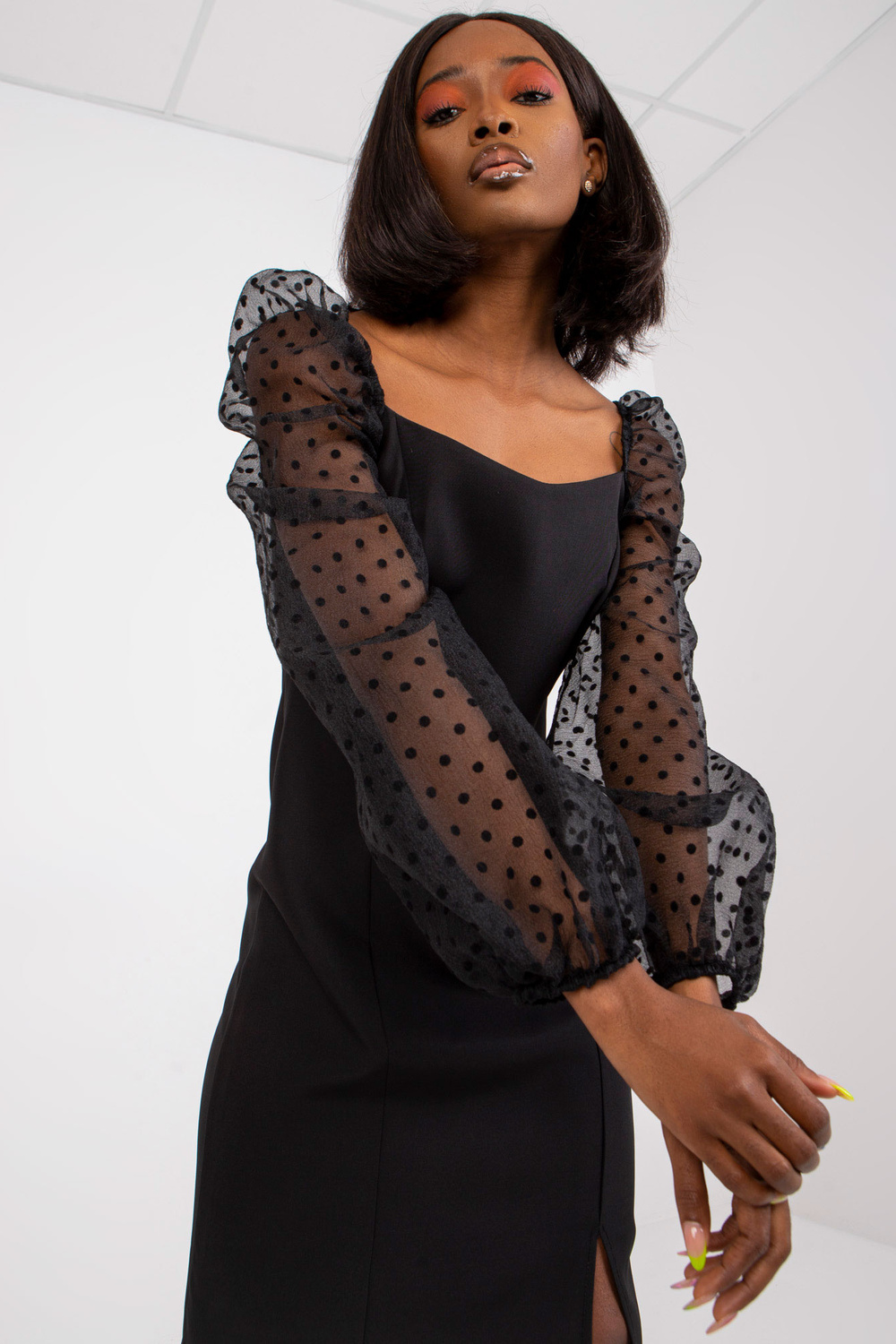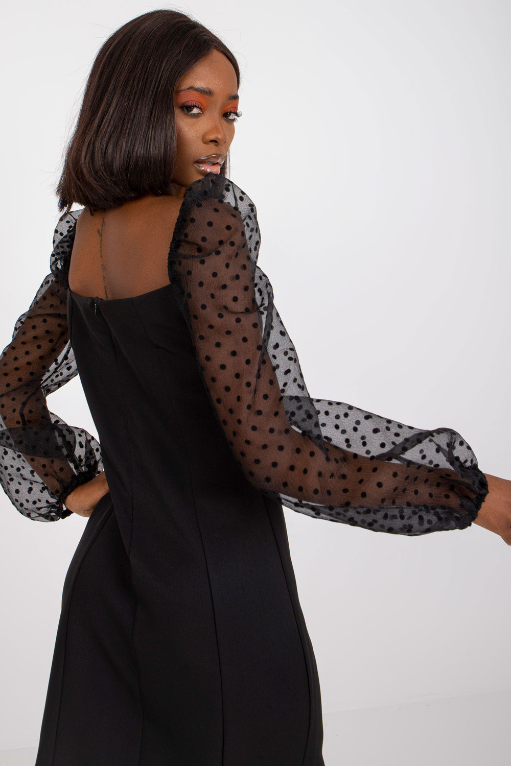 Melnā kokteiļa kleita ar uzpūstām piedurknēm.