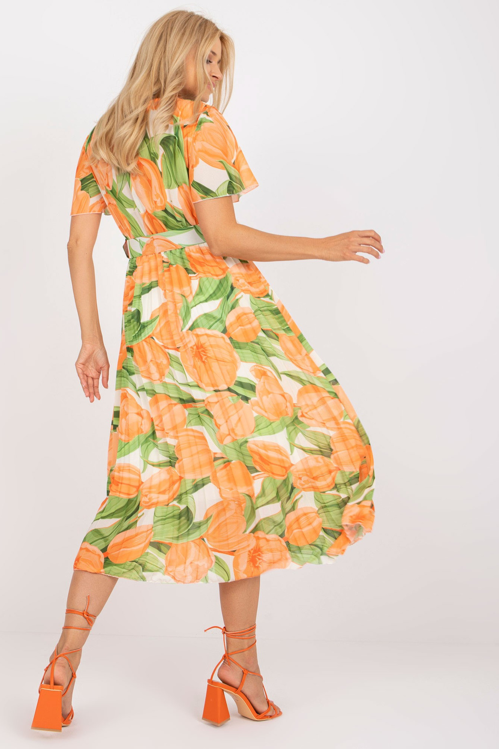 Viena izmēra kleita ar oranži zaļu kroku ziediem .