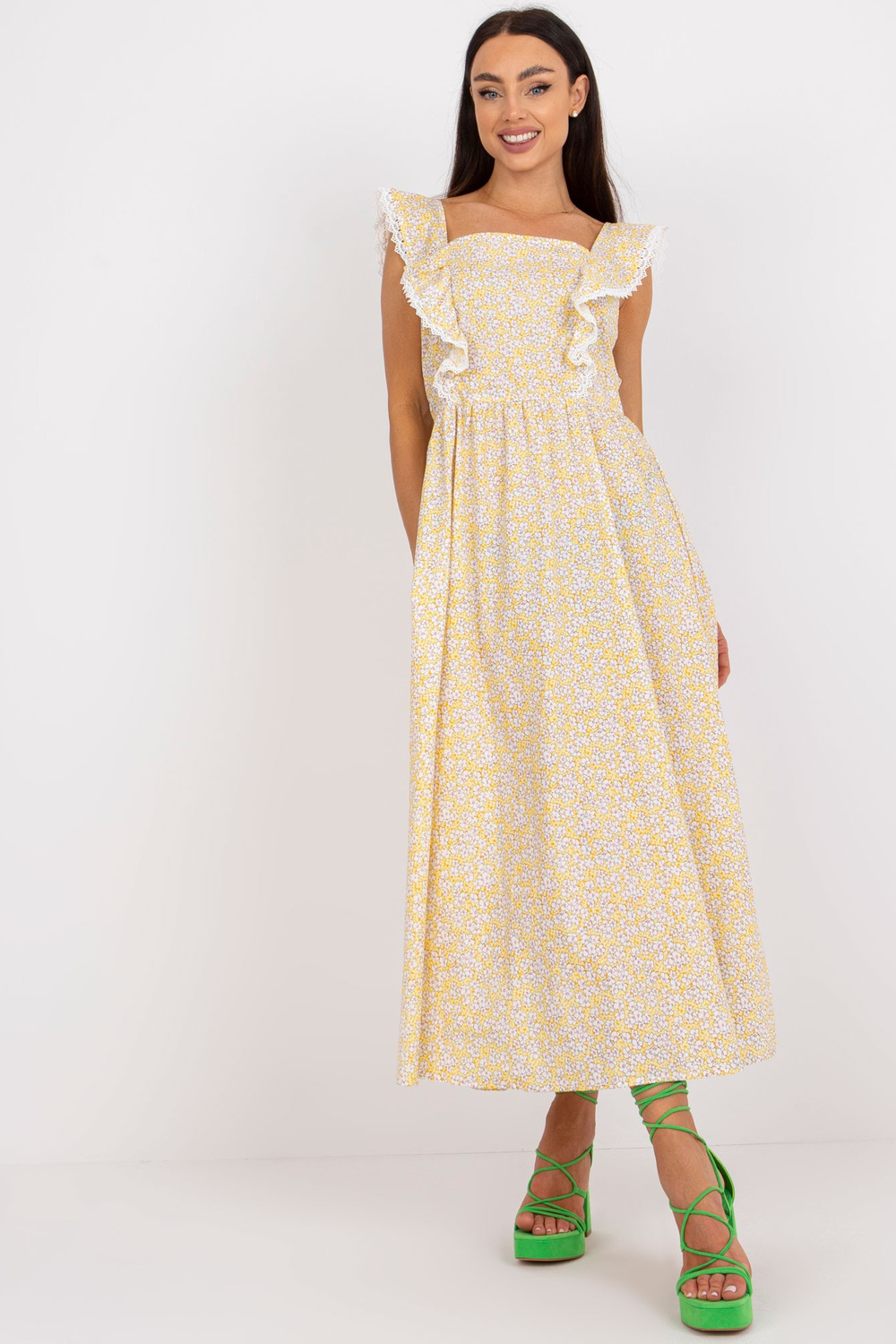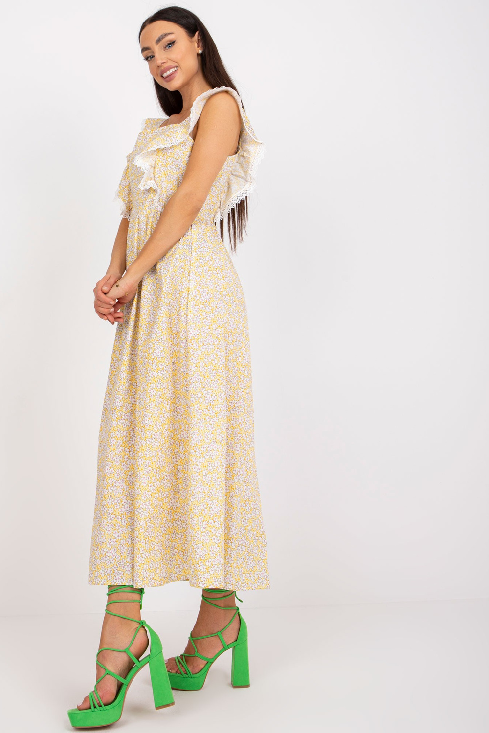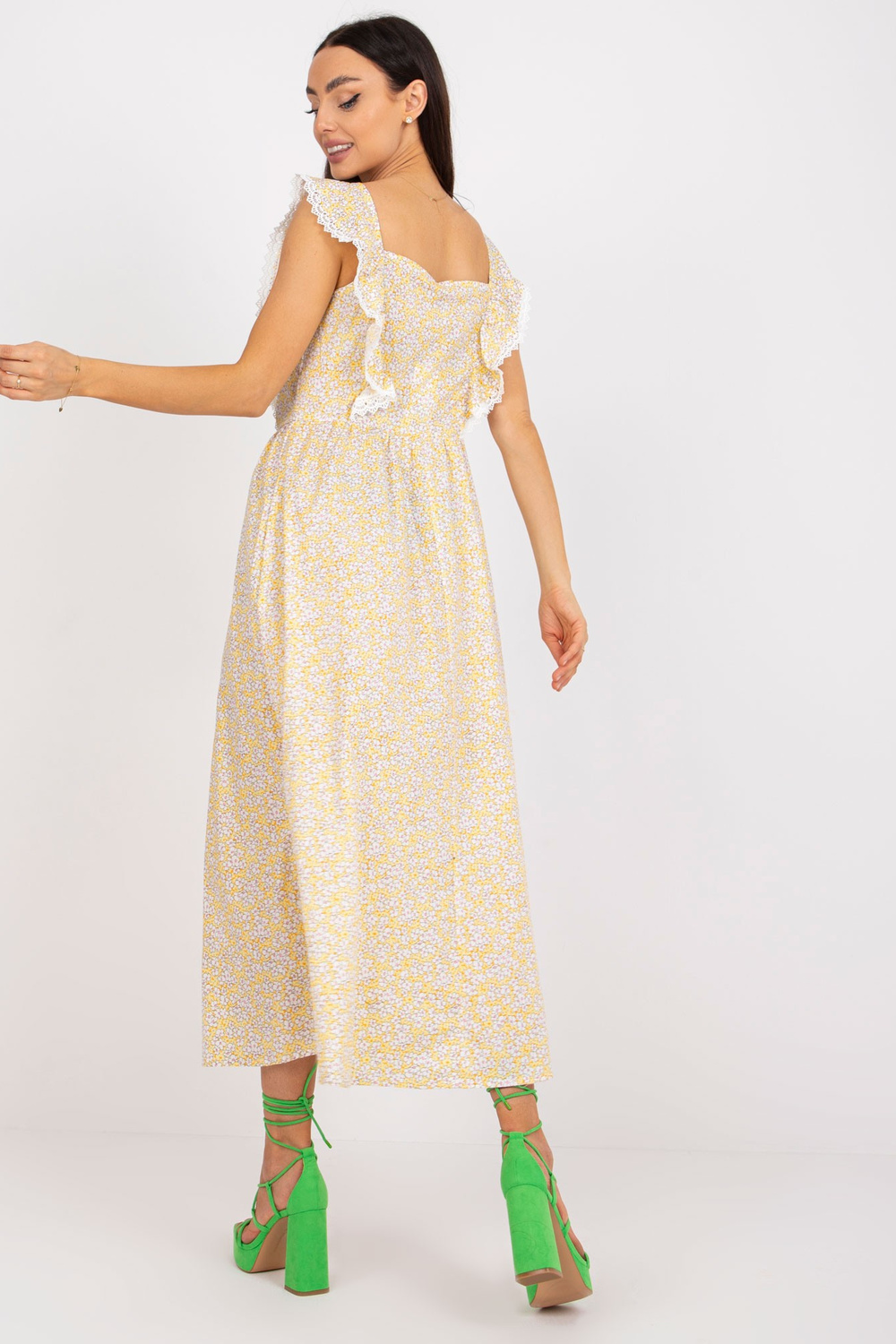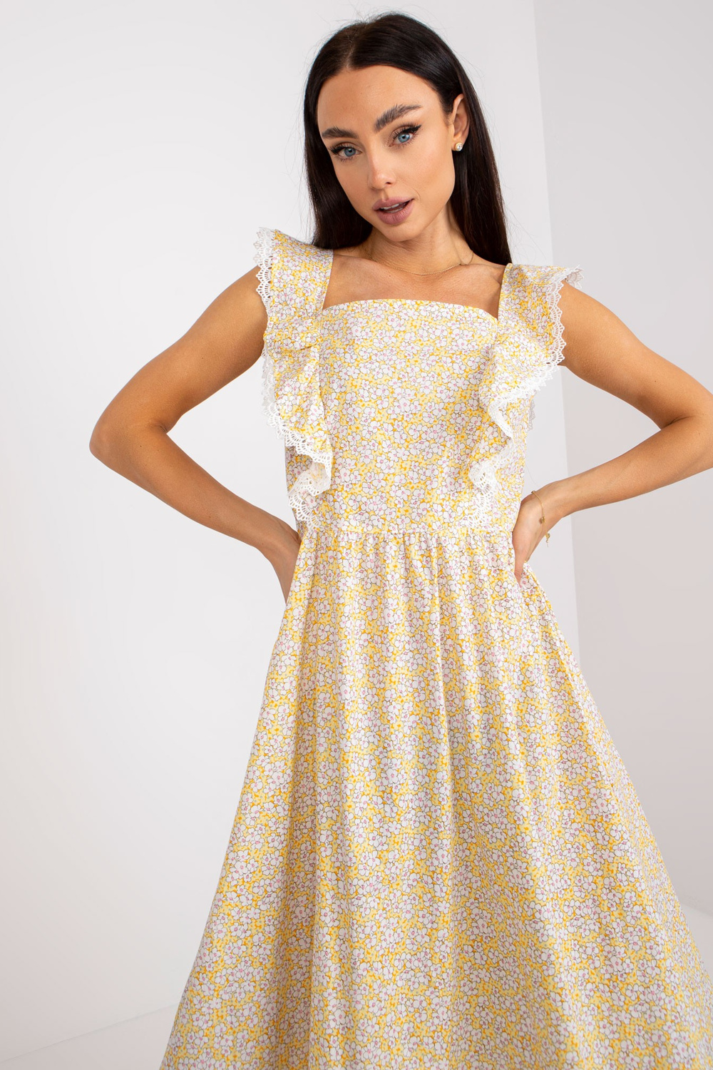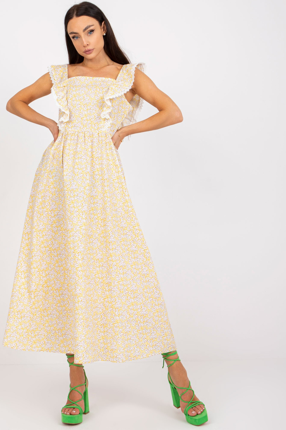 Dzeltenas vasaras kleita no kokvilnas ar apdrukām.