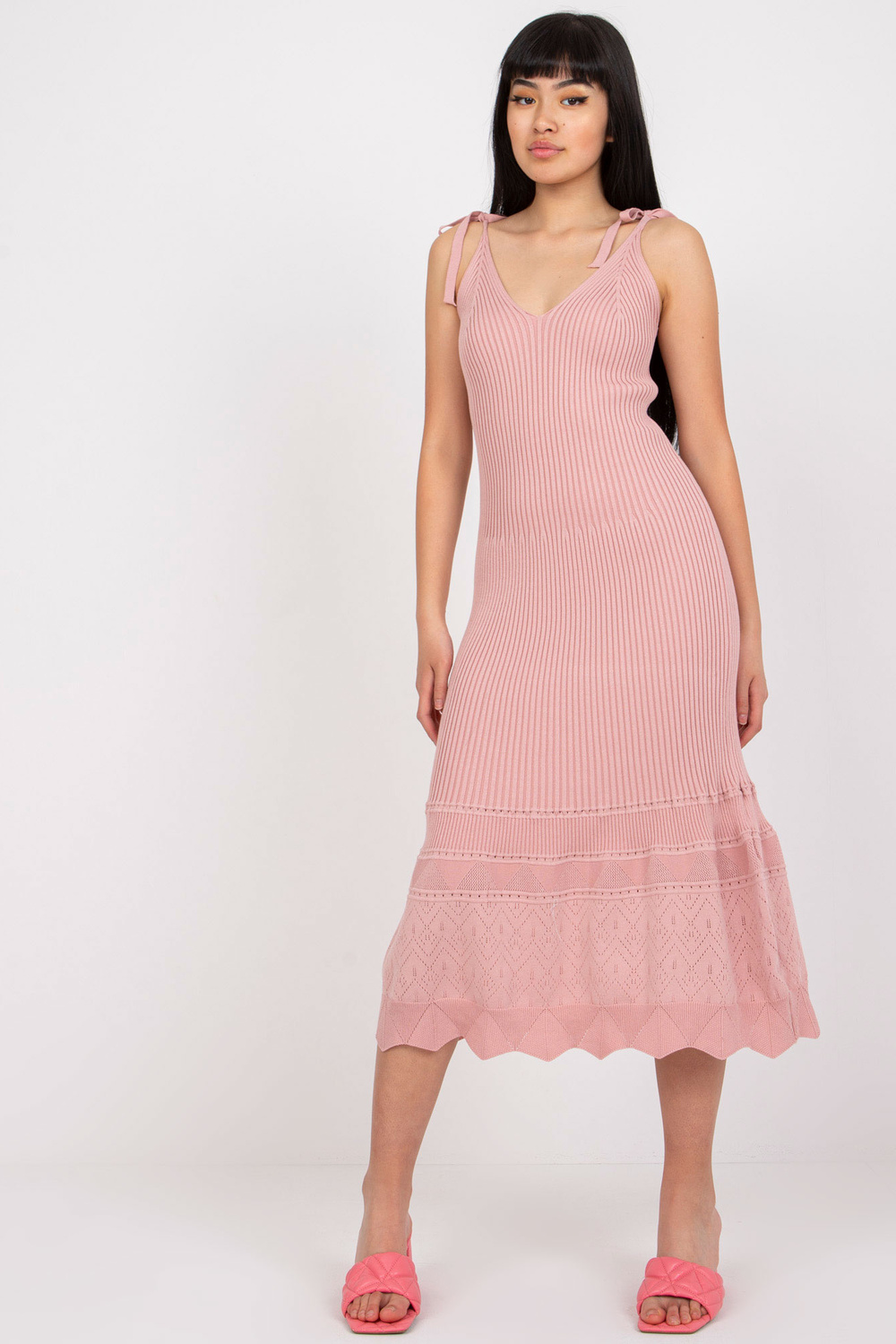 Netīri rozā kleita uz lencēm, kas adītas ar svītrām.