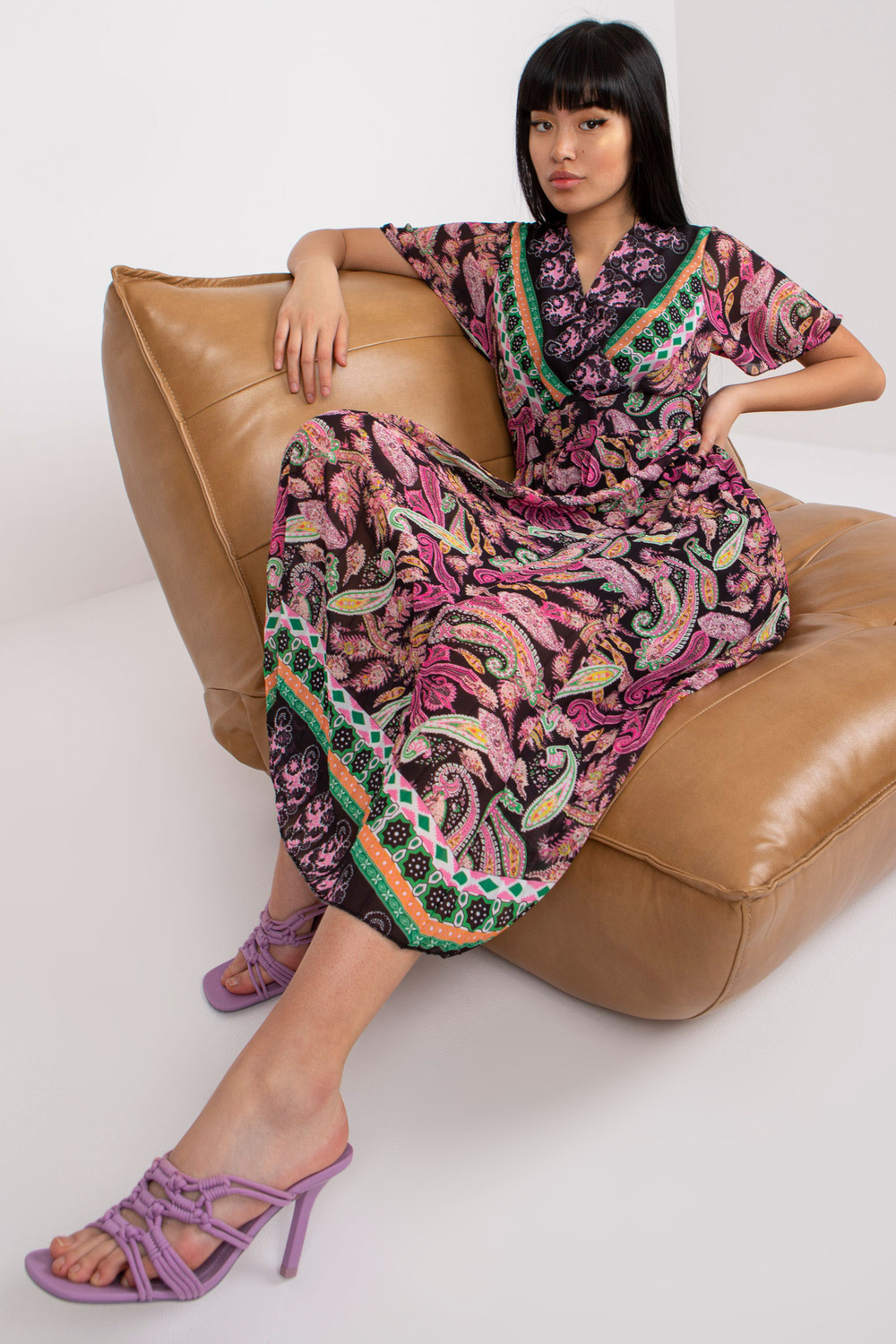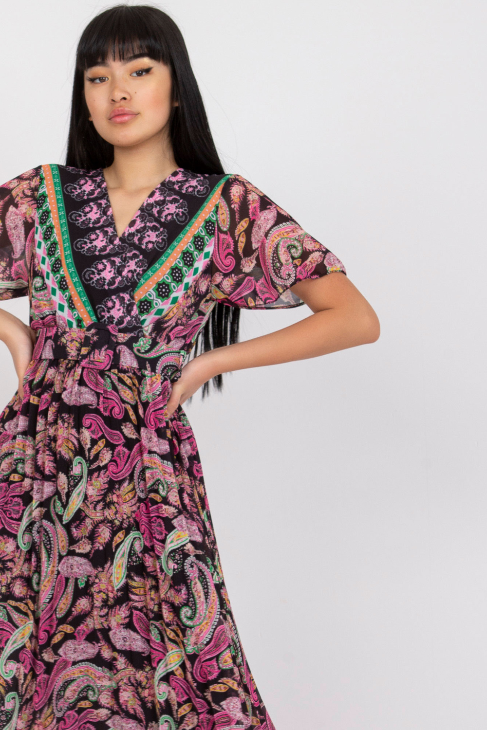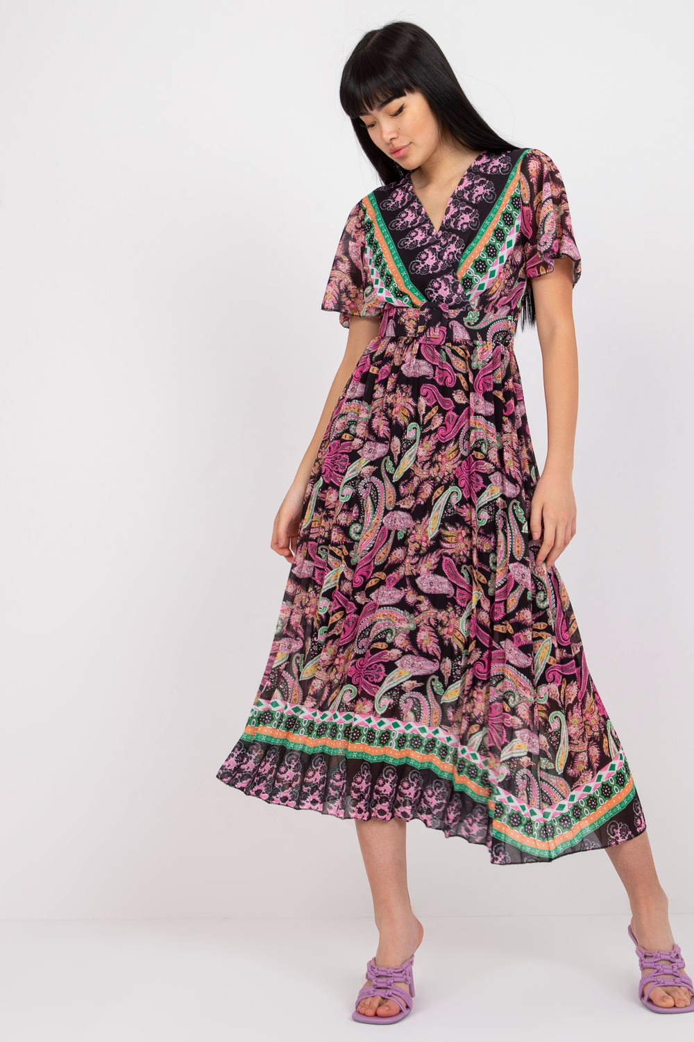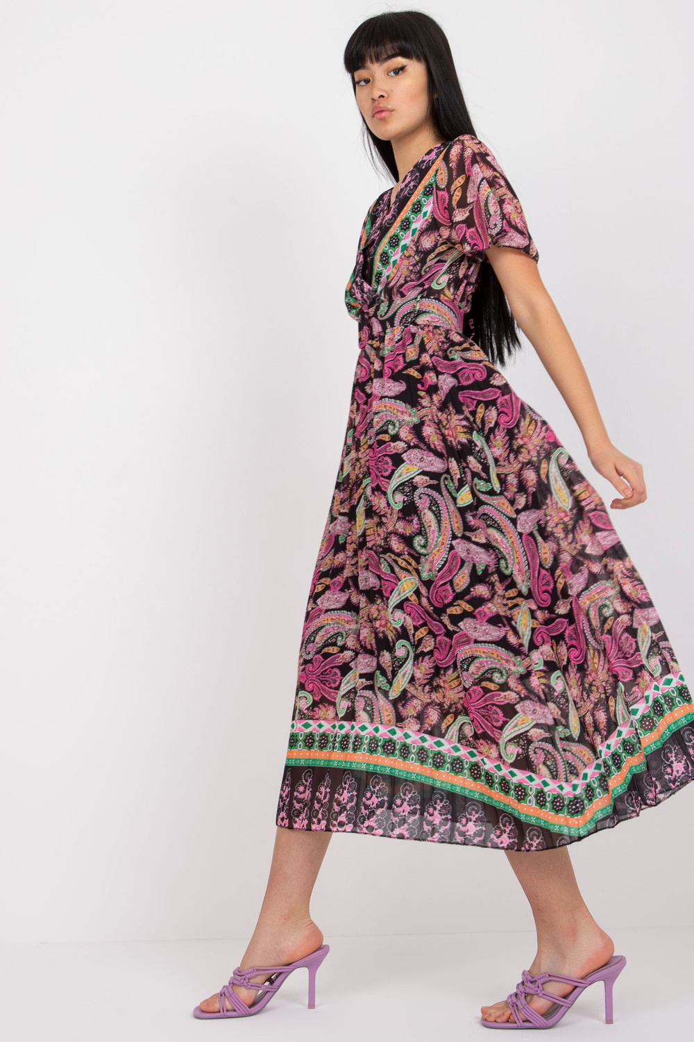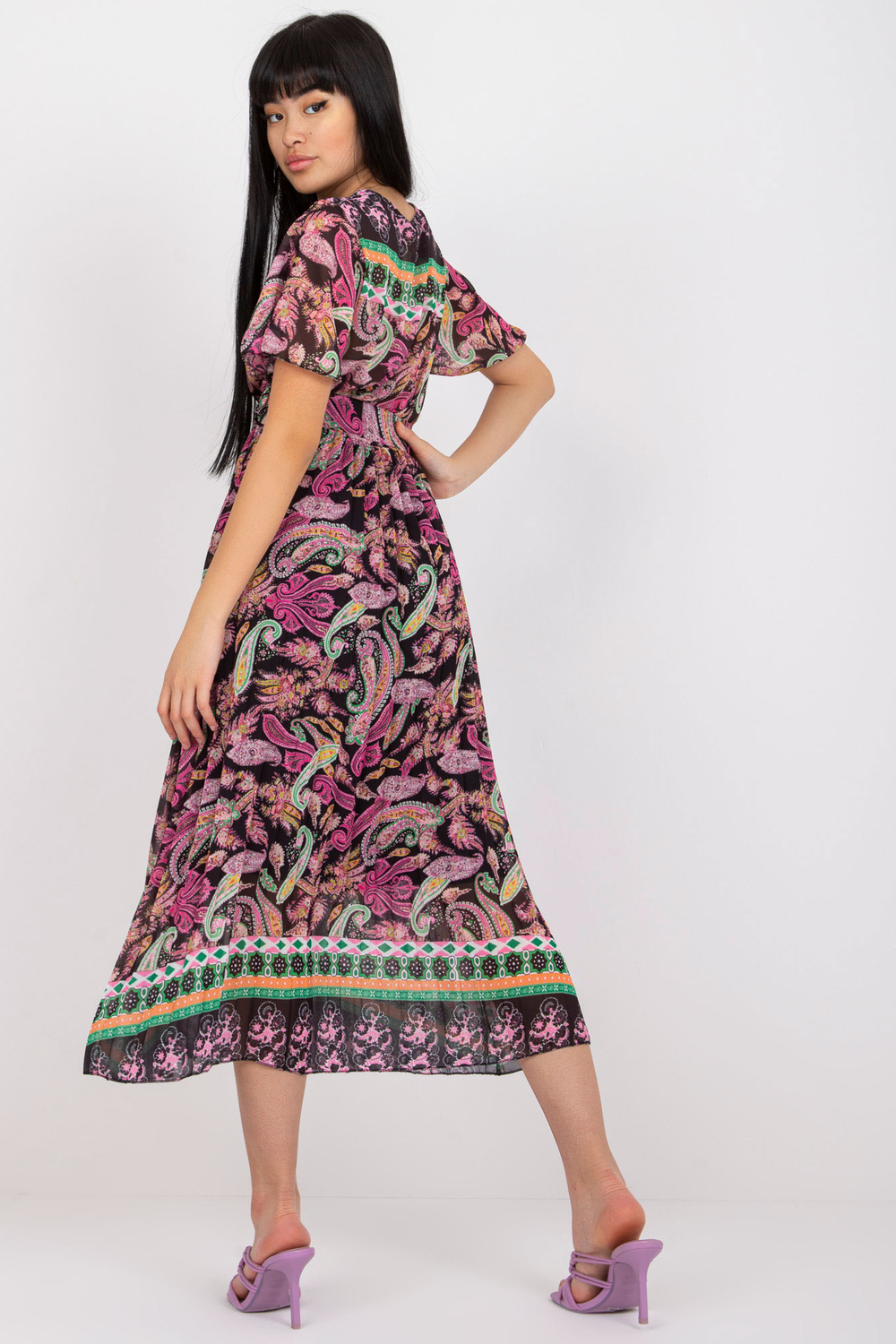 Melni rozā uzliesmojoša viena izmēra kleita ar apdruku.