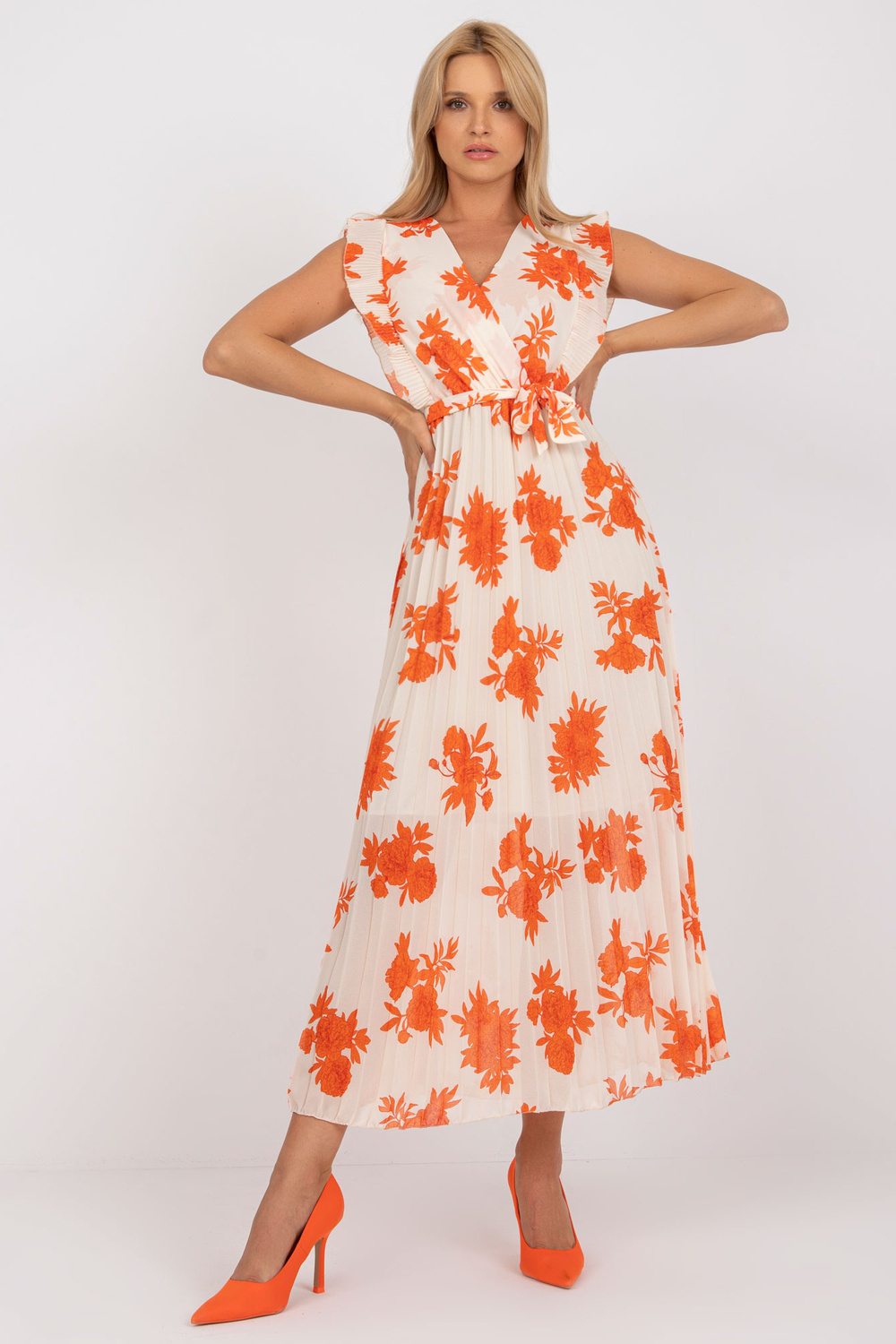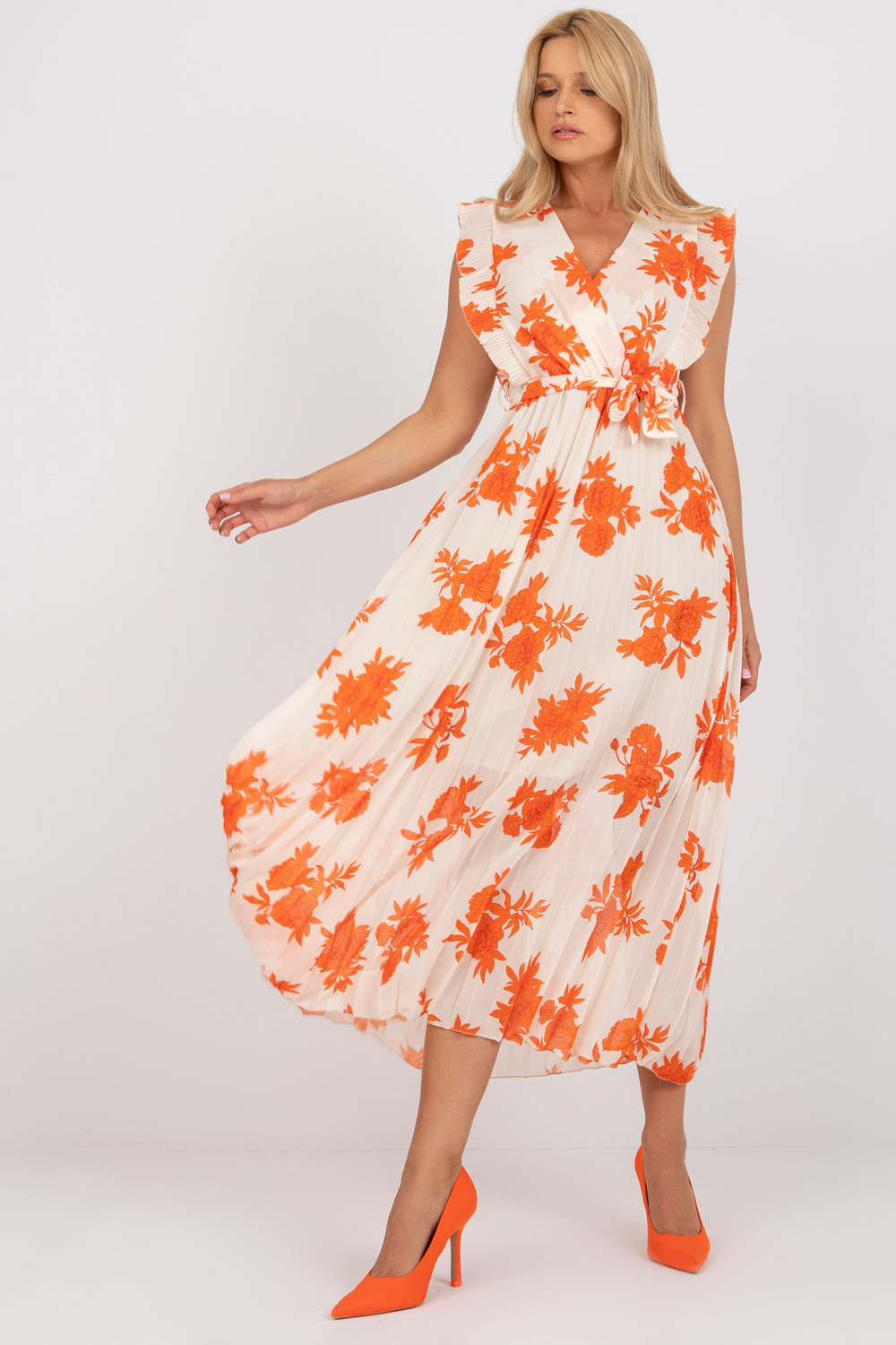 Bēša un oranža gara kroku kleita ar apdrukām . ekstras: siksnas materiālssastāvs: poliesters, elastāns mazgāšanas metode: mazgāšana veļasmašīnā 30°C Produkta kods: DHJ-SK-13166.94P dominējošais raksts: ziedi Stils: ikdienišķs gadījums: ikdienišķs, darbam, randiņam, s
