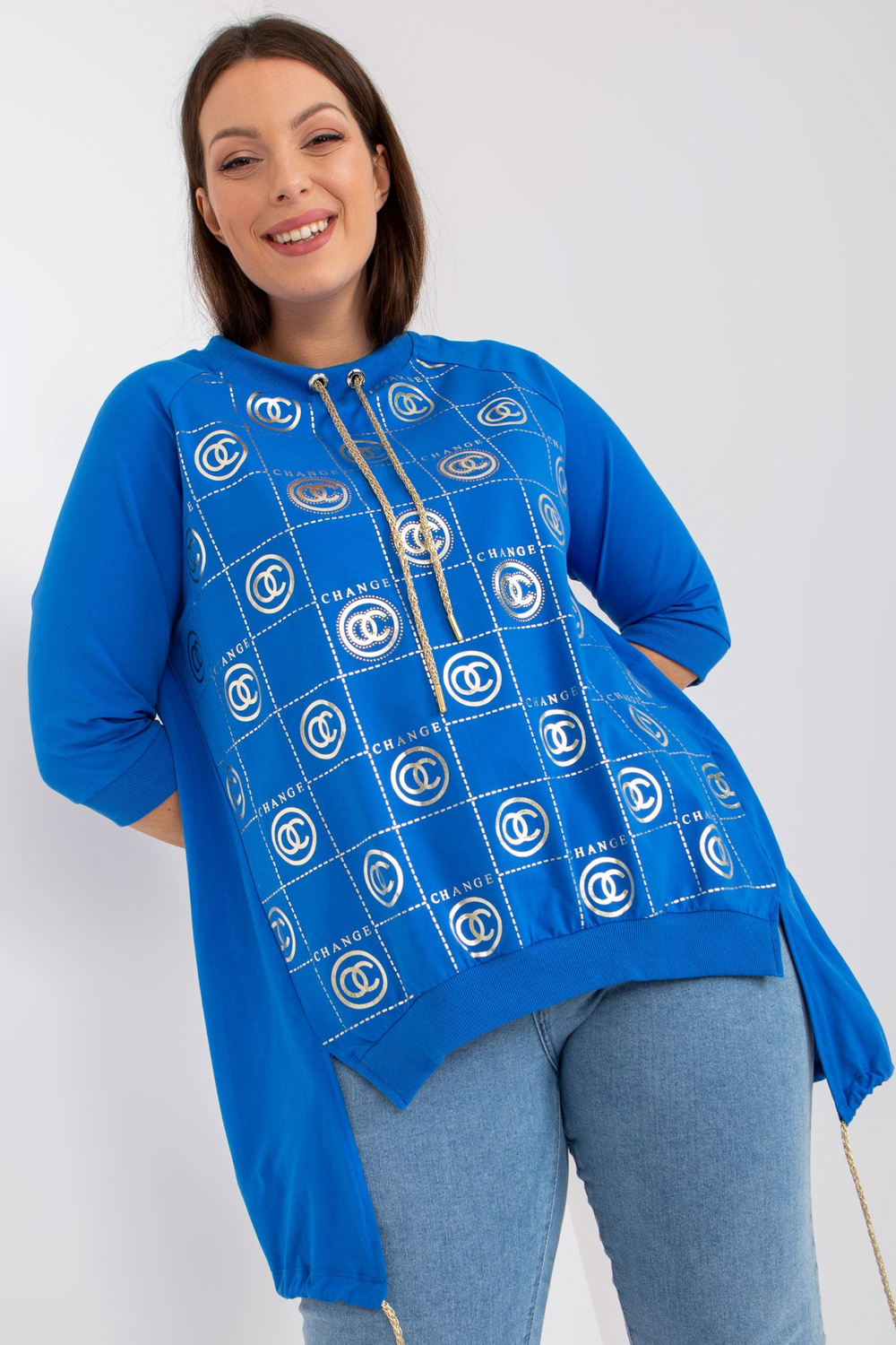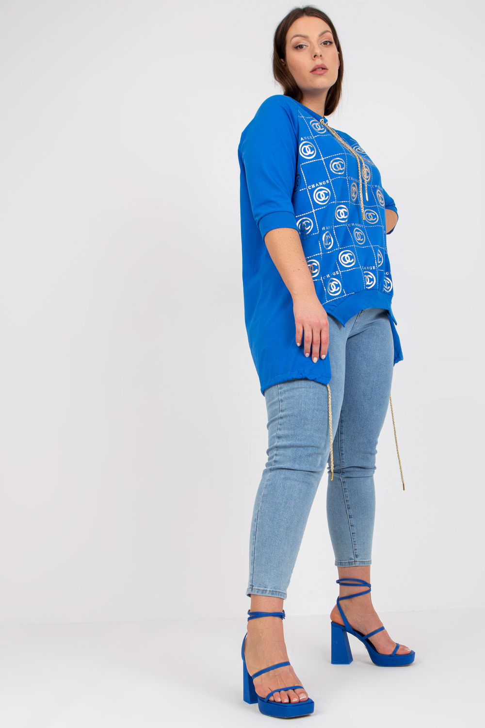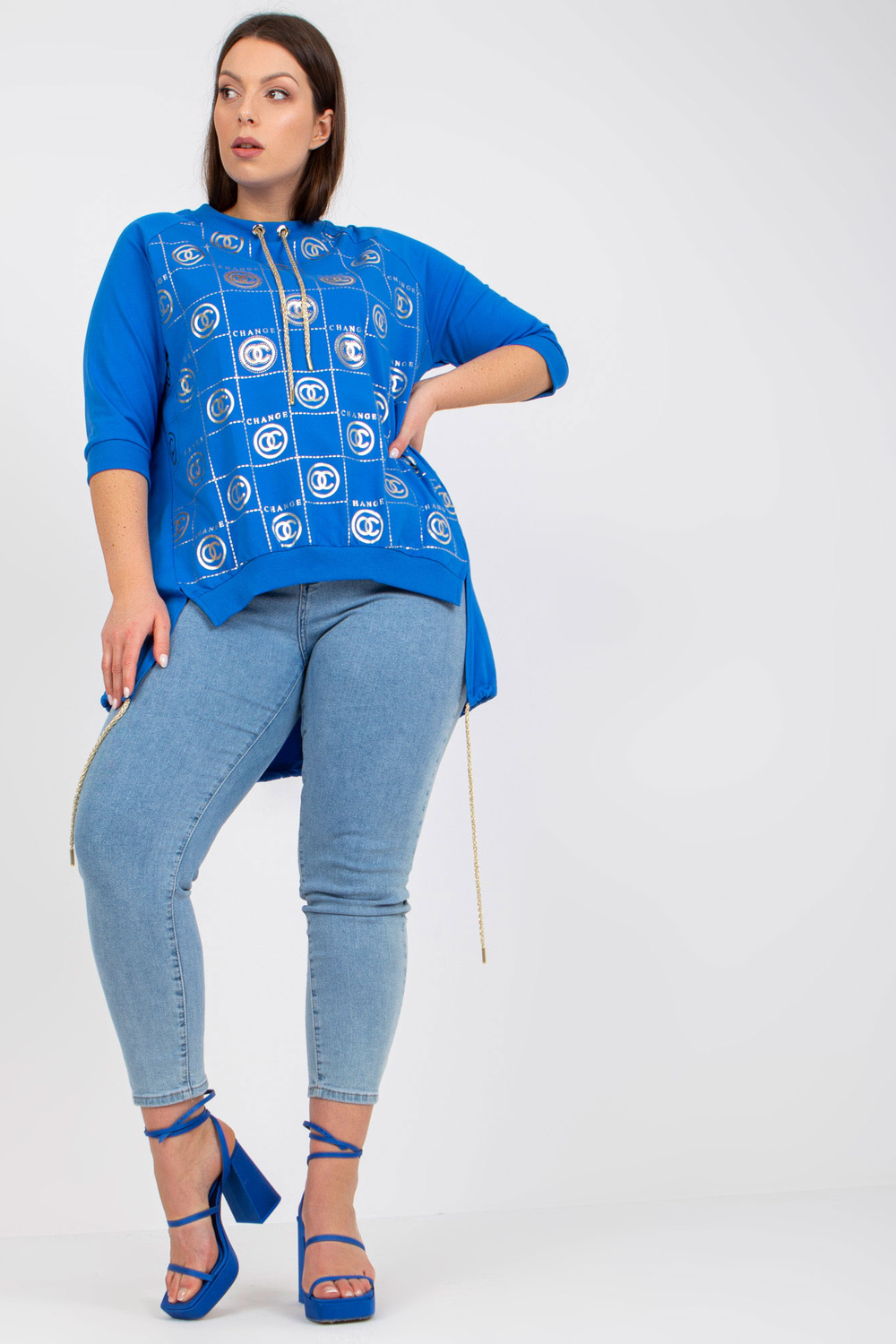 Tumši zila brīva liela izmēra blūze ar aplikāciju.