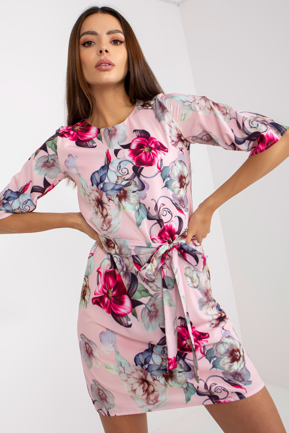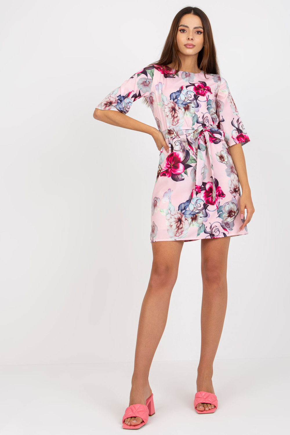 Gaiši rozā īsa kokteiļkleita ar jostu.
