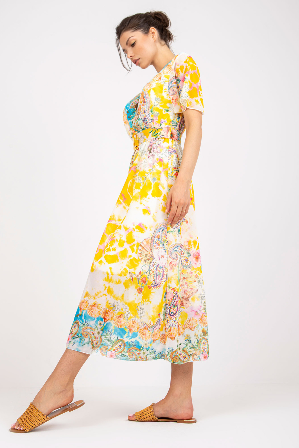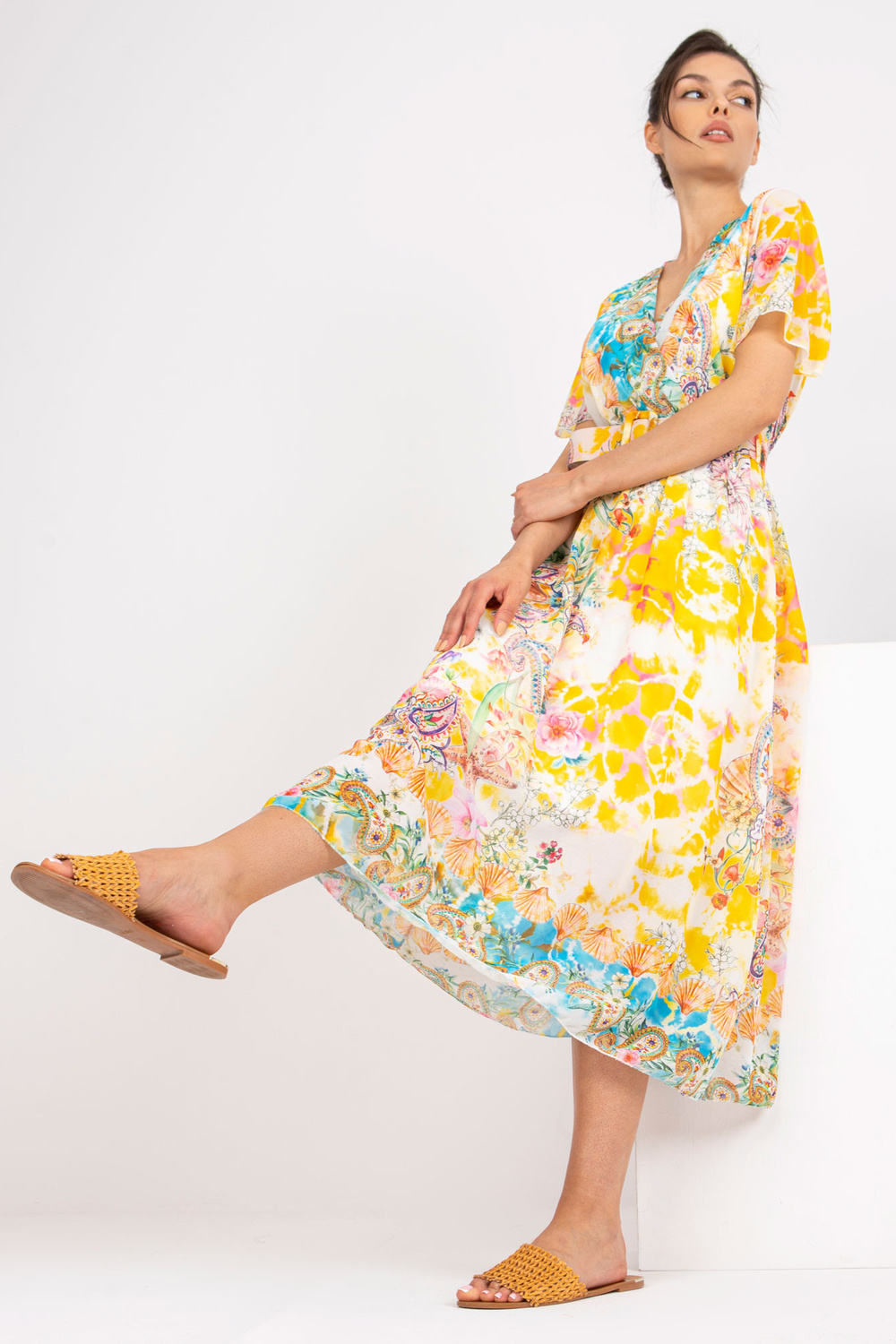 Dzeltena midi kleita ar apdrukām un izgriezumu .