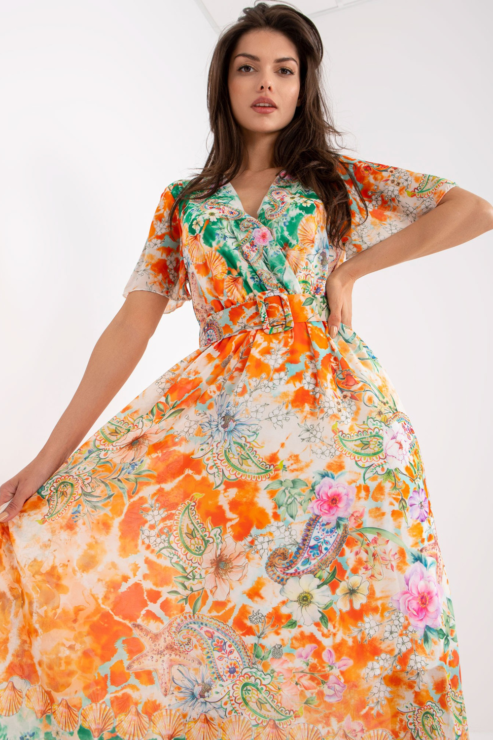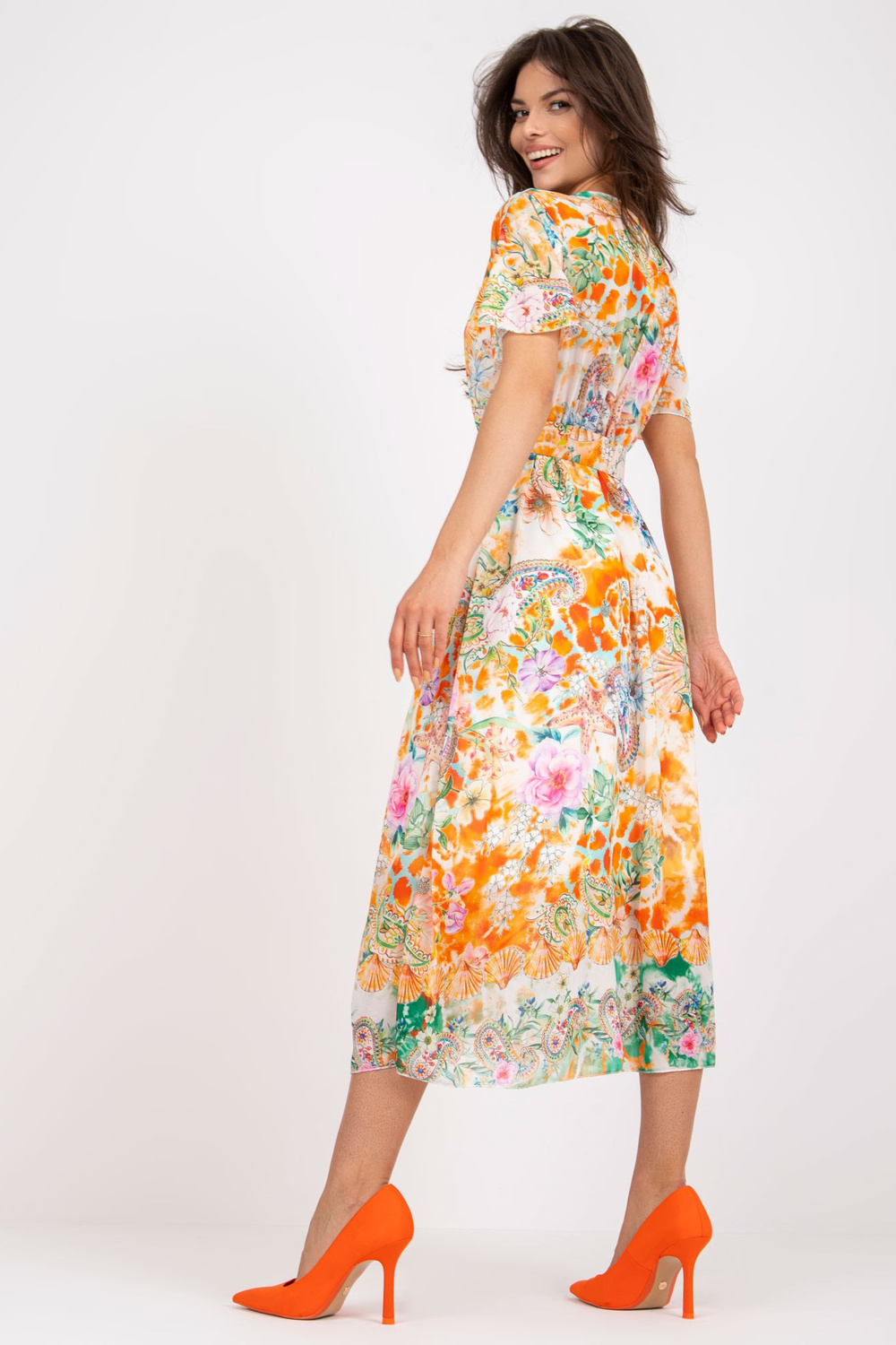 Orangemidi kleita ar apdrukām . ekstras: siksnas materiālssastāvs: 50% poliesters, 45% viskoze, 5% elastāns mazgāšanas metode: mazgāšana veļasmašīnā 30°C Produkta kods: DHJ-SK-15967-1.01P dominējošais raksts: apdruka Stils: ikdienišķs gadījums: ikdienišķs, darbam, randiņam , priekš