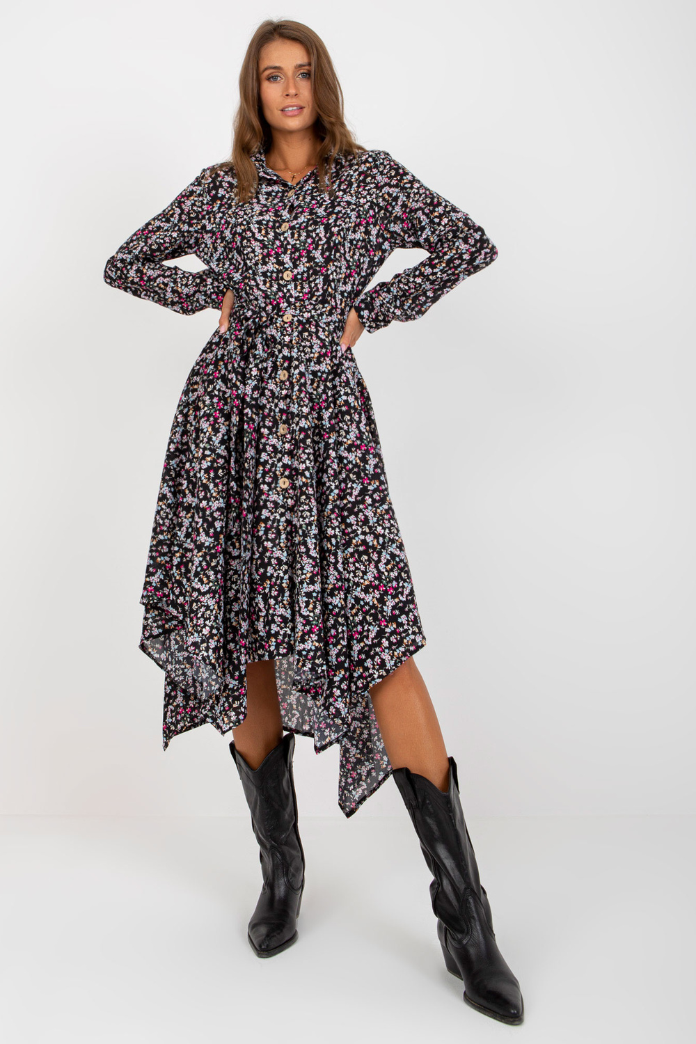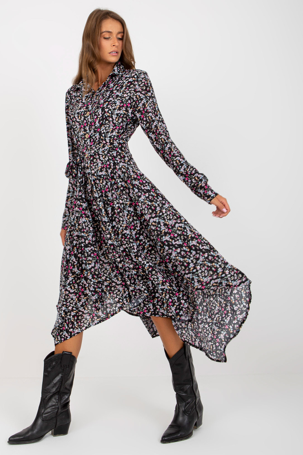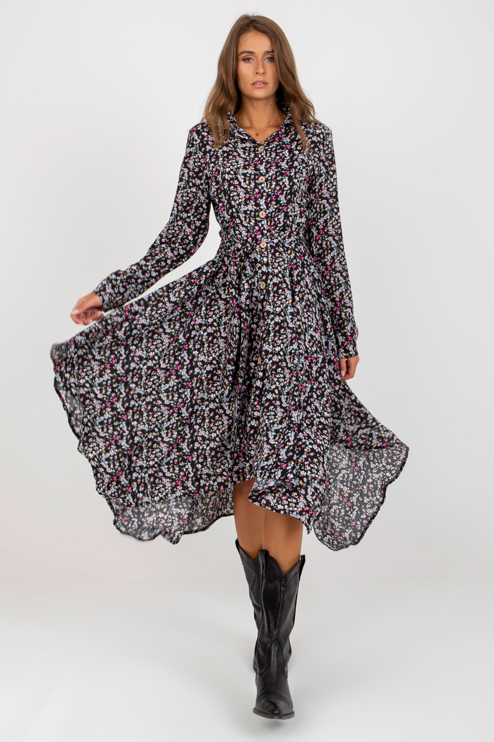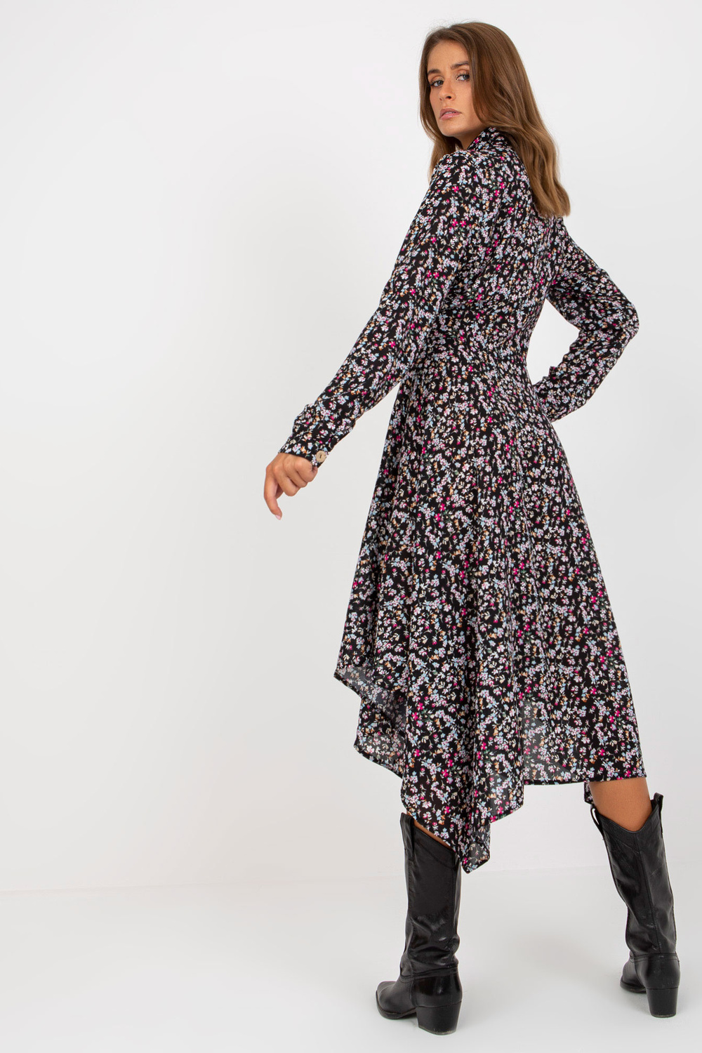 Melna simetriska kleita ar ziedu apdrukām RUE PARIS.
