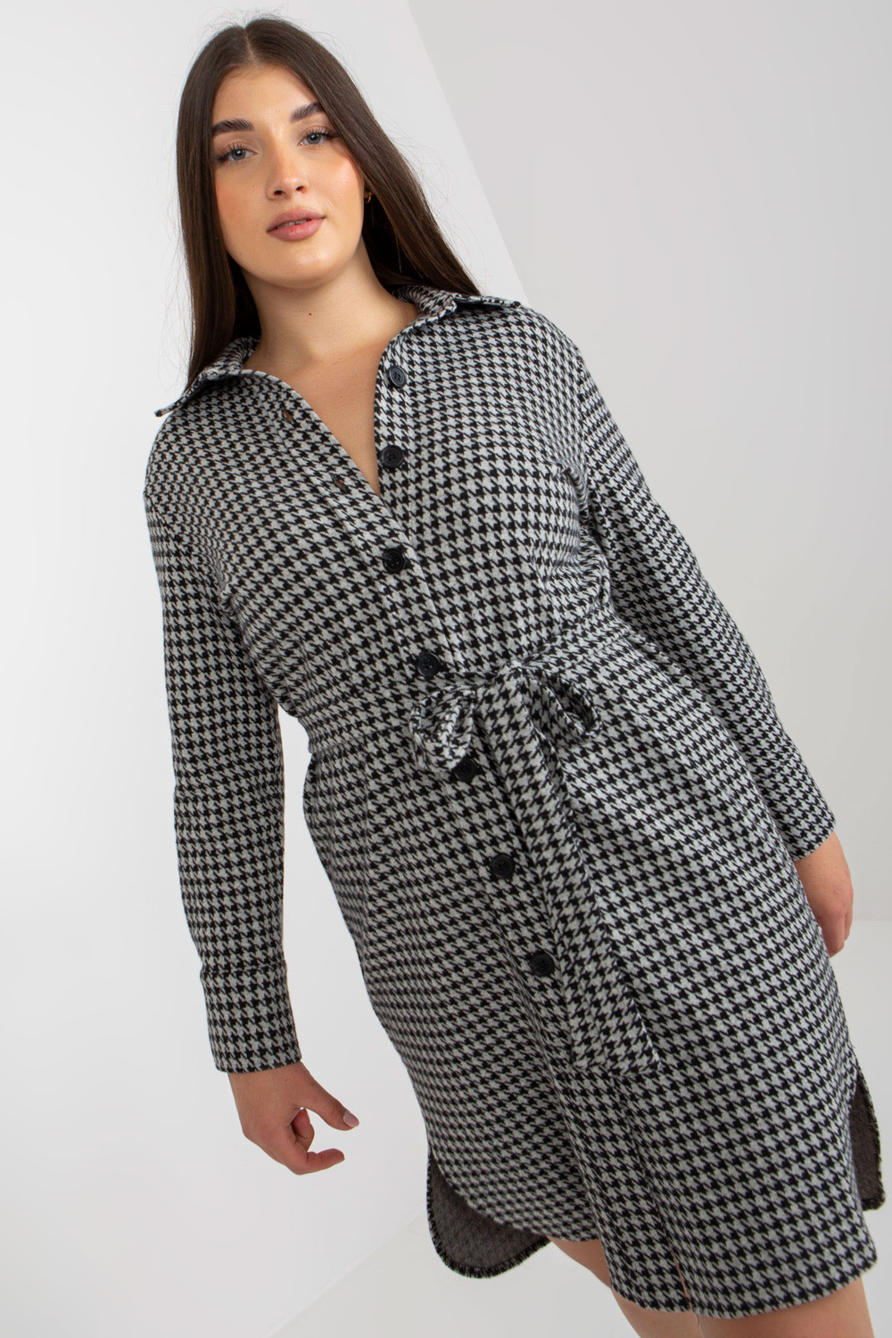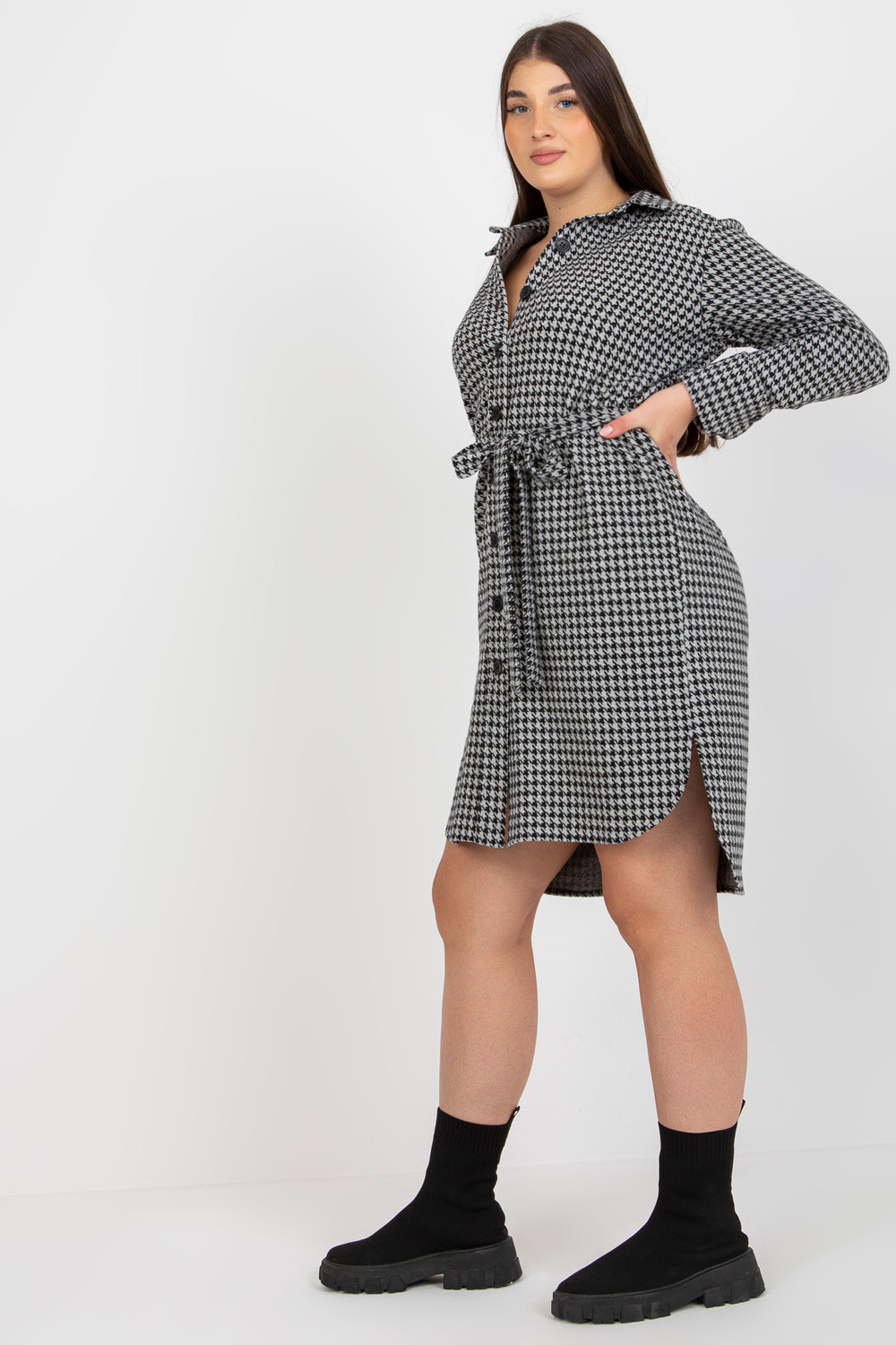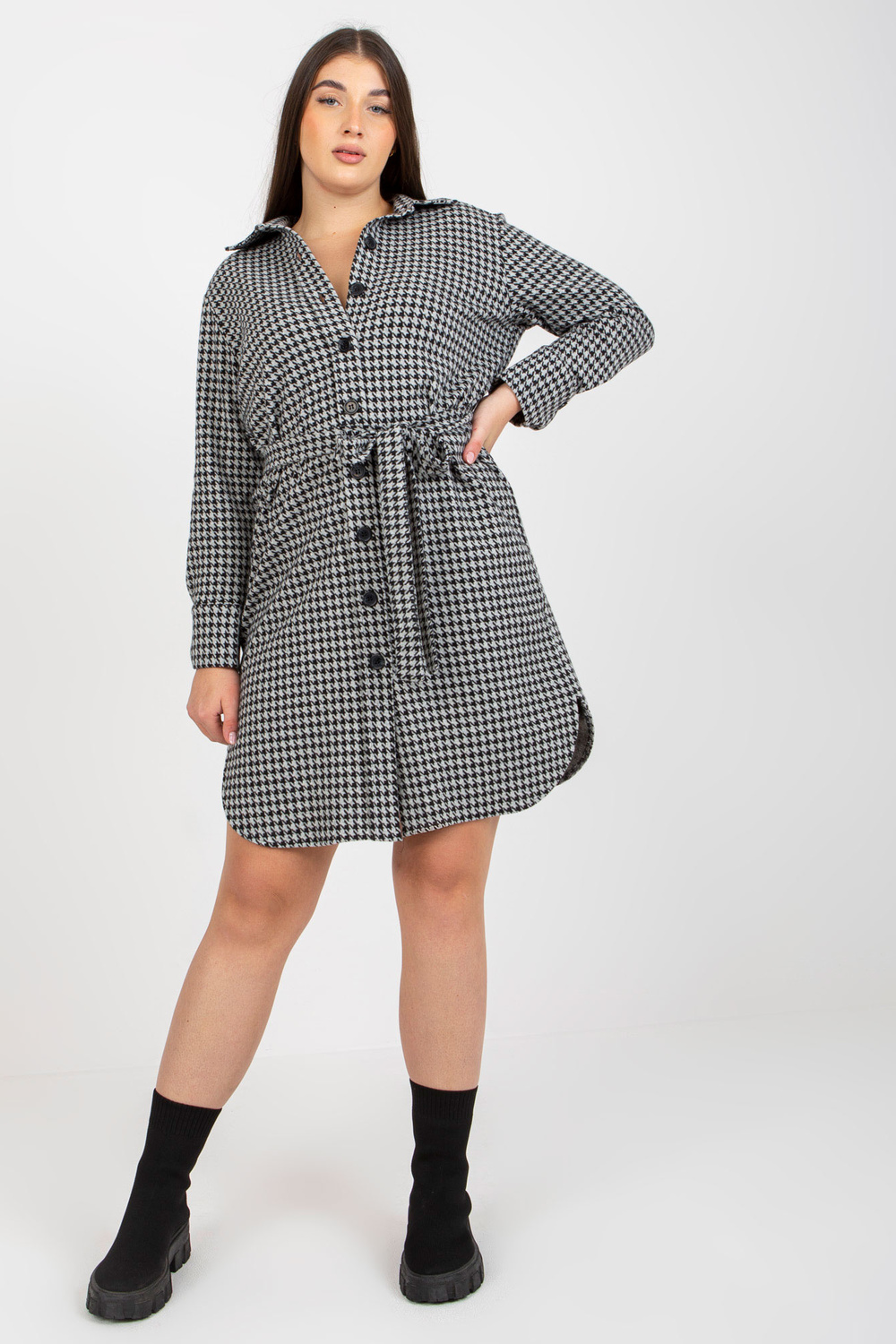 Pelēka un melna liela izmēra kreklkleita ar suņu zobiem.
