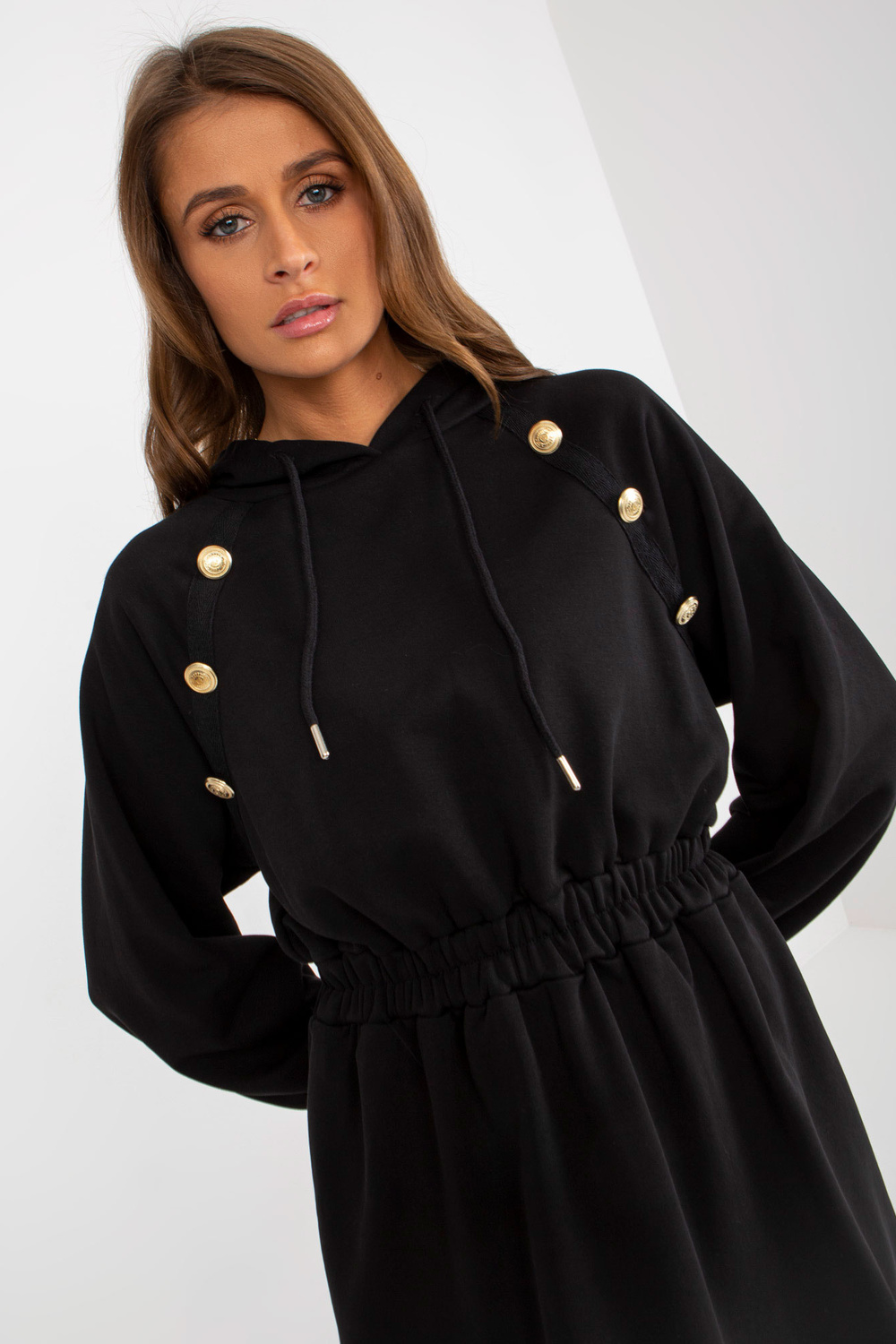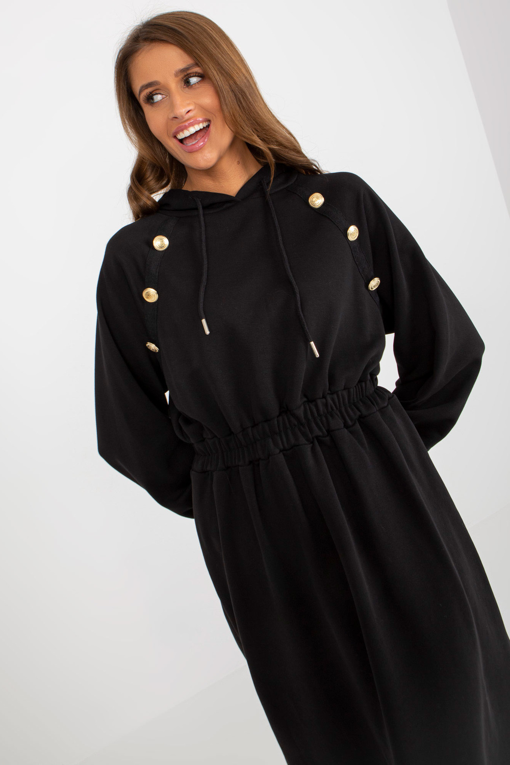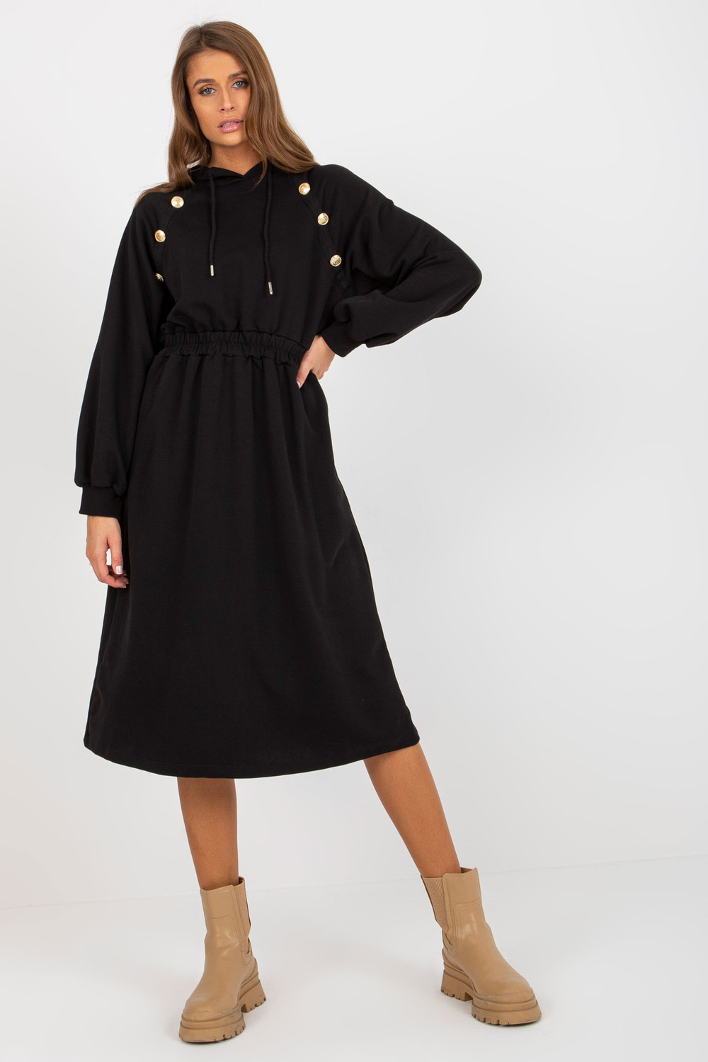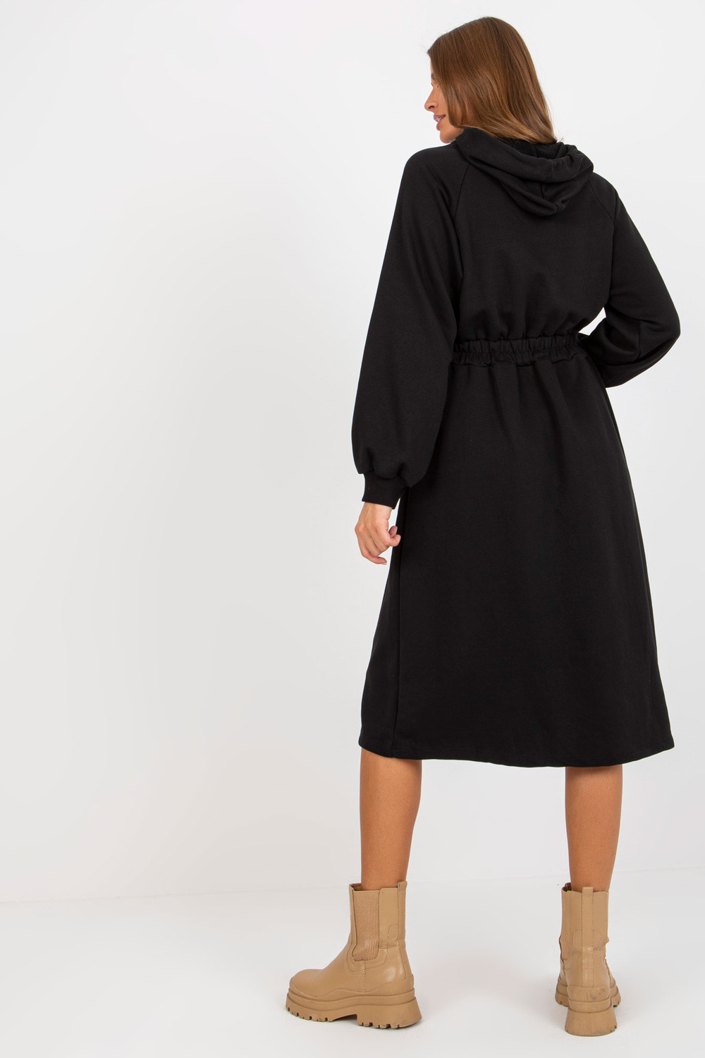 Schwarze Midi-Trainingskleid aus Baumwolle Produkta kods: RV-SK-8336.12P dominantes Grupa: glatt Stils: lässig Anlass: lässig, in der Stadt, spazieren gehen Das Model trägt eine Einheitsgröße. Maße des Models: Höhe 176 cm, Büste 85 cm, Taille 64 cm, Hüfte 9