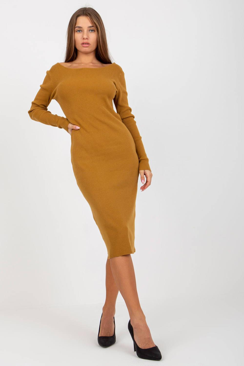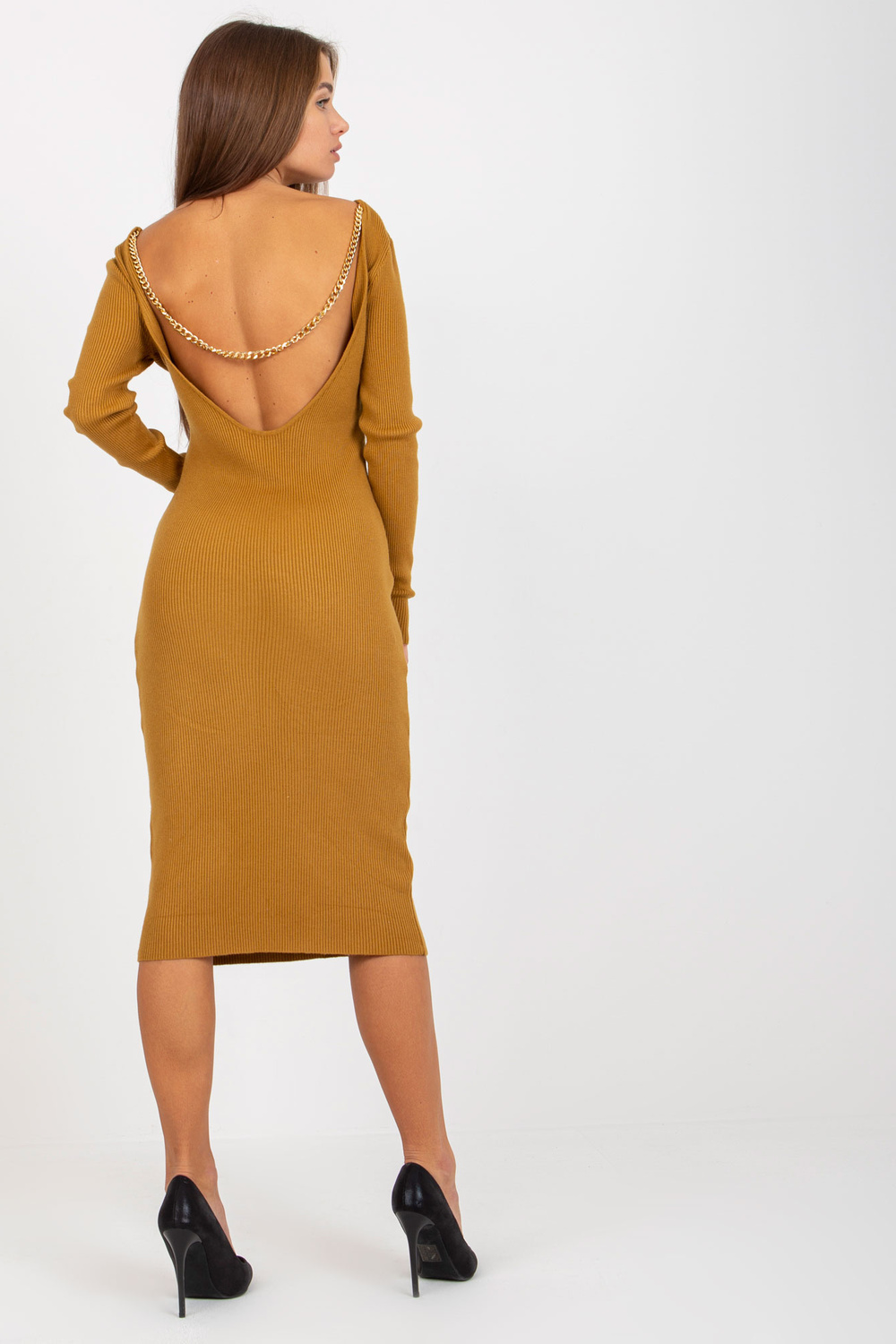 Tumši dzeltena trikotāžas kleita ar kakla izgriezumu mugurpusē.