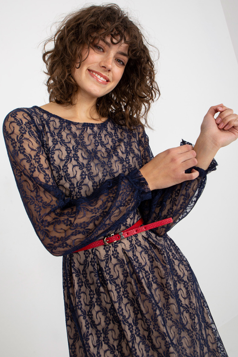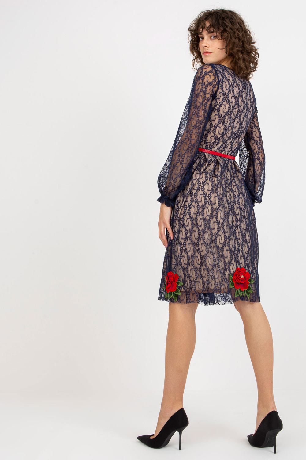 Jūrzila mežģīņu kokteiļkleita ar plānu jostiņu.