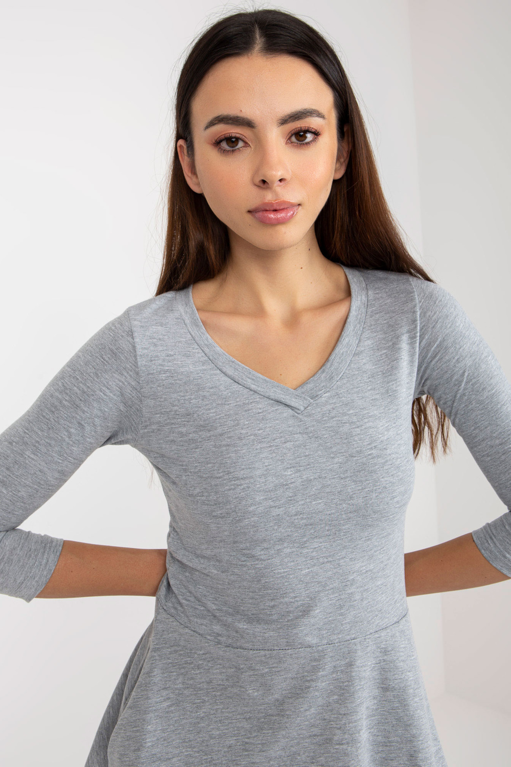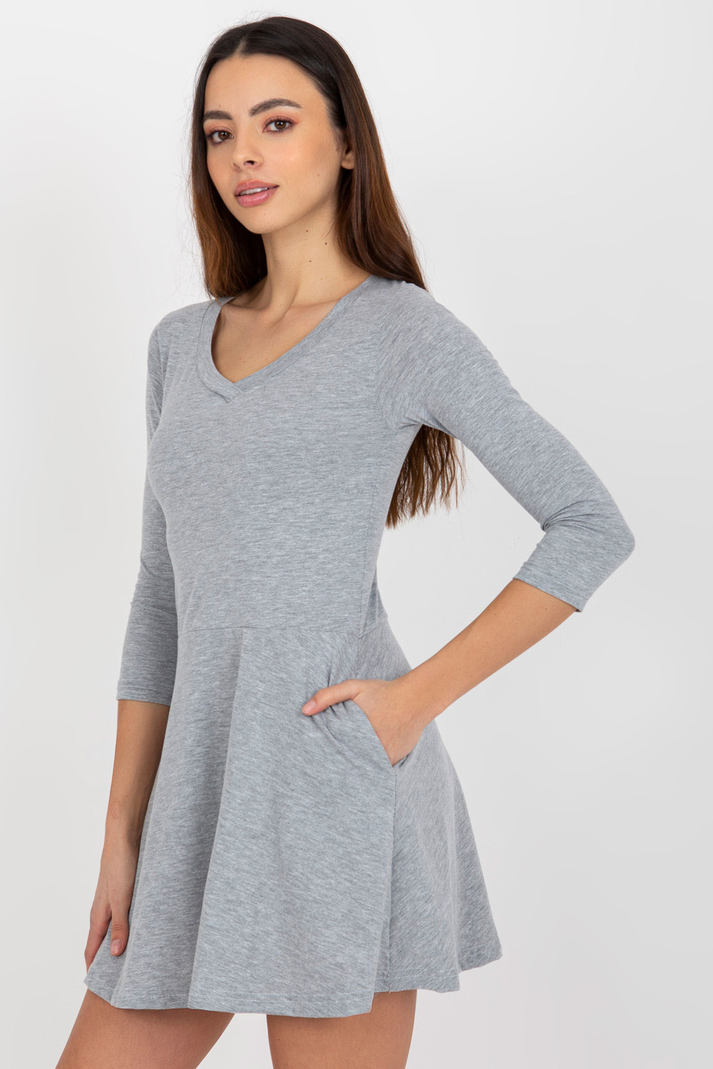 Pelēka minikleita ar V veida kakla izgriezumu.