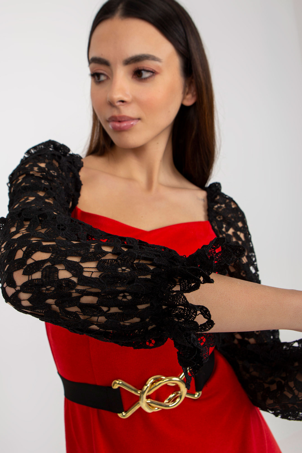 Sarkana kokteiļkleita ar dekoratīvām Marbella piedurknēm.