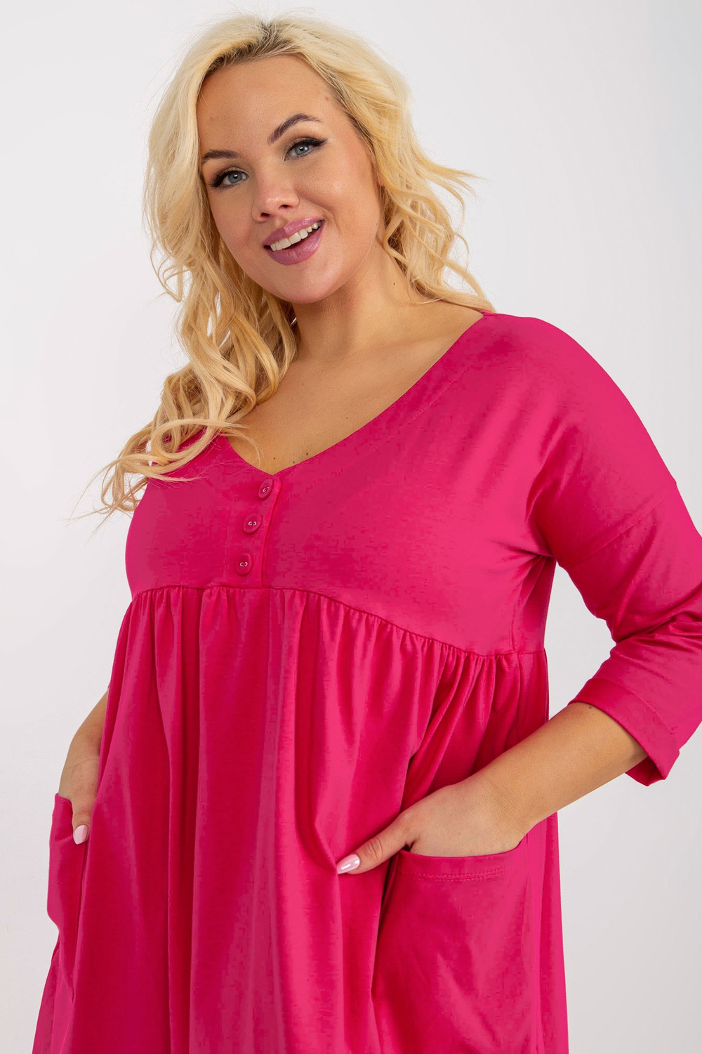 Fuksijas krāsas liela izmēra pamata kleita ar pogām kakla izgriezumā.